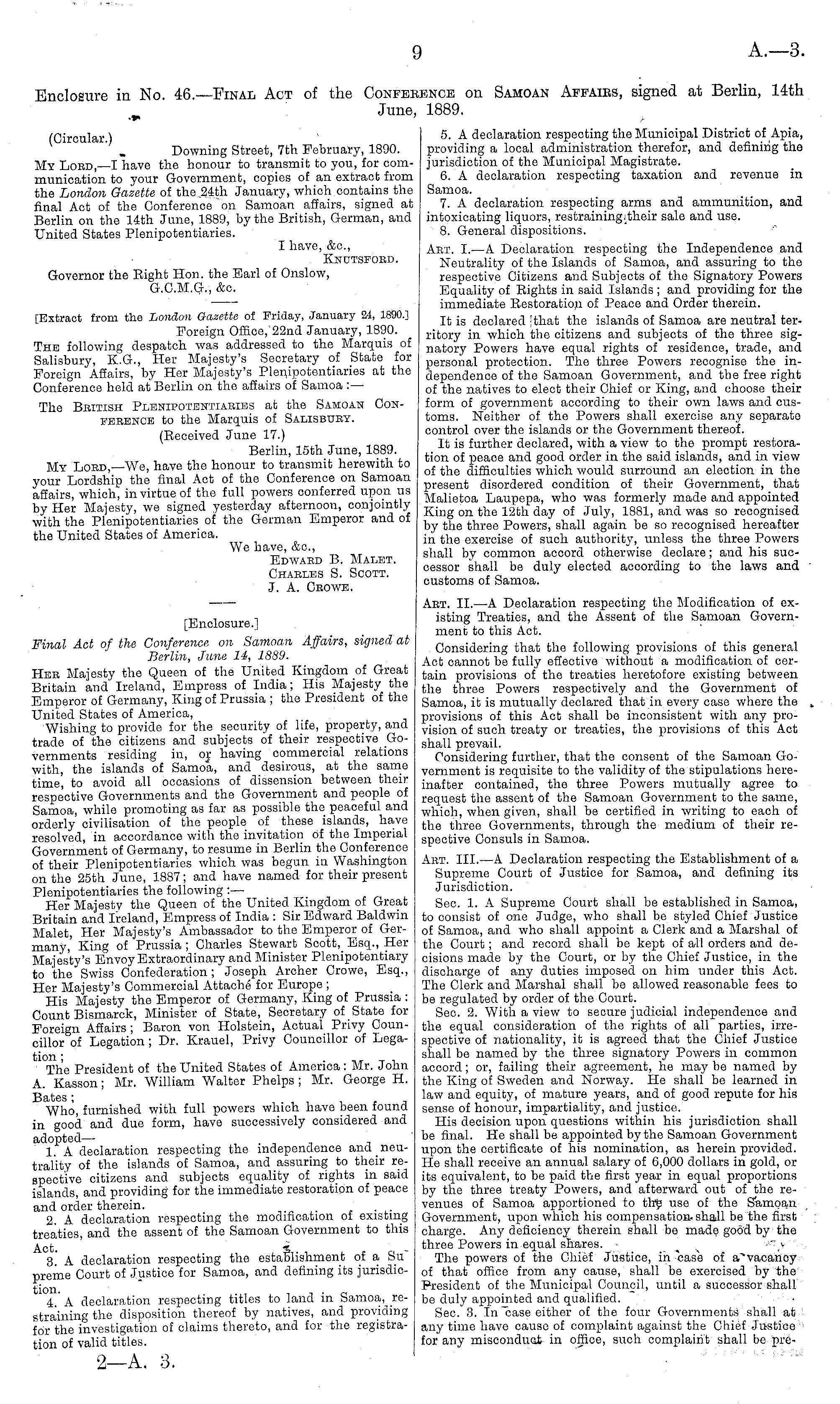 (Circular.) Downing Street, 7th February, 1890. My Lord, —I have the honour to transmit to you, for communication to your Government, copies of an extract from the London Gazette of the 24th January, which contains the final Act of the Conference on Samoan affairs, signed at Berlin on the 14th June, 1889, by the British, German, and United States Plenipotentiaries. I have, &c, Knutsfoed. Governor the Eight Hon. the Earl of Onslow, G.C.M.G., &c. [Extract from the London Gazette of Friday, January 24, 1890.] Foreign Office, 22nd January, 1890. The following despatch was addressed to the Marquis of Salisbury, K.G., Her Majesty's Secretary of State for Foreign Affairs, by Her Majesty's Plenipotentiaries at the Conference held at Berlin on the affairs of Samoa : — The British Plenipotentiaries at the Samoan Conference to the Marquis of Salisbury. (Eeceived June 17.) Berlin, 15th June, 1889. My Lord, —We, have the honour to transmit herewith to your Lordship the final Act of the Conference on Samoan affairs, which, in virtue of the full powers conferred upon us by Her Majesty, we signed yesterday afternoon, conjointly with the Plenipotentiaries of the German Emperor and of the United States of America. We have, &c, Edward B. Malet. Charles S. Scott. J. A. Crowe. [Enclosure.] Final Act of the Conference on Samoan Affairs, signed at Berlin, Jane 14, 1889. Her Majesty the Queen of the United Kingdom of Great Britain and Ireland, Empress of India; His Majesty the Emperor of Germany, King of Prussia ; the President of the United States of America, Wishing to provide for the security of life, property, and trade of the citizens and subjects of their respective Governments residing in, or having commercial relations with, the islands of Samoa, and desirous, at the same time' to avoid all occasions of dissension between their respective Governments and the Government and people of Samoa, while promoting as far as possible the peaceful and orderly civilisation of the people of these islands, have resolved, in accordance with the invitation of the Imperial Government of Germany, to resume in Berlin the Conference of their Plenipotentiaries which was begun in Washington on the 25th June, 1887; and have named for their present Plenipotentiaries the following : — Her Majesty the Queen of the United Kingdom of Great Britain and Ireland, Empress of India : Sir Edward Baldwin Malet, Her Majesty's Ambassador to the Emperor of Germany, King of Prussia ; Charles Stewart Scott^ Esq., Her Majesty's Envoy Extraordinary and Minister Plenipotentiary to the Swiss Confederation; Joseph Archer Crowe, Esq., Her Majesty's Commercial Attache for Europe ; His Majesty the Emperor of Germany, King of Prussia : Count Bismarck, Minister of State, Secretary of State for Foreign Affairs ; Baron von Holstein, Actual Privy Councillor of Legation ; Dr. Krauel, Privy Councillor of LegaTh'e President of the United States of America : Mr. John A. Kasson; Mr. William Walter Phelps ; Mr. George H. Bates ; Who, furnished with full powers winch have been found in good and due form, have successively considered and adopted — 1. A declaration respecting the independence and neutrality of the islands of Samoa, and assuring to their respective citizens and subjects equality of rights in said islands, and providing for the immediate restoration of peace and order therein. . . 2 A declaration respecting the modification of existing treaties, and the assent of the Samoan Government to this 3 A declaration respecting the establishment of a Su preme Court of Justice for Samoa, and defining its jurisdic--4.' A declaration respecting titles to land in Samoa, restraining the disposition thereof by natives, and providing for the investigation of claims thereto, and for the registration of valid titles. 2—A. 3.