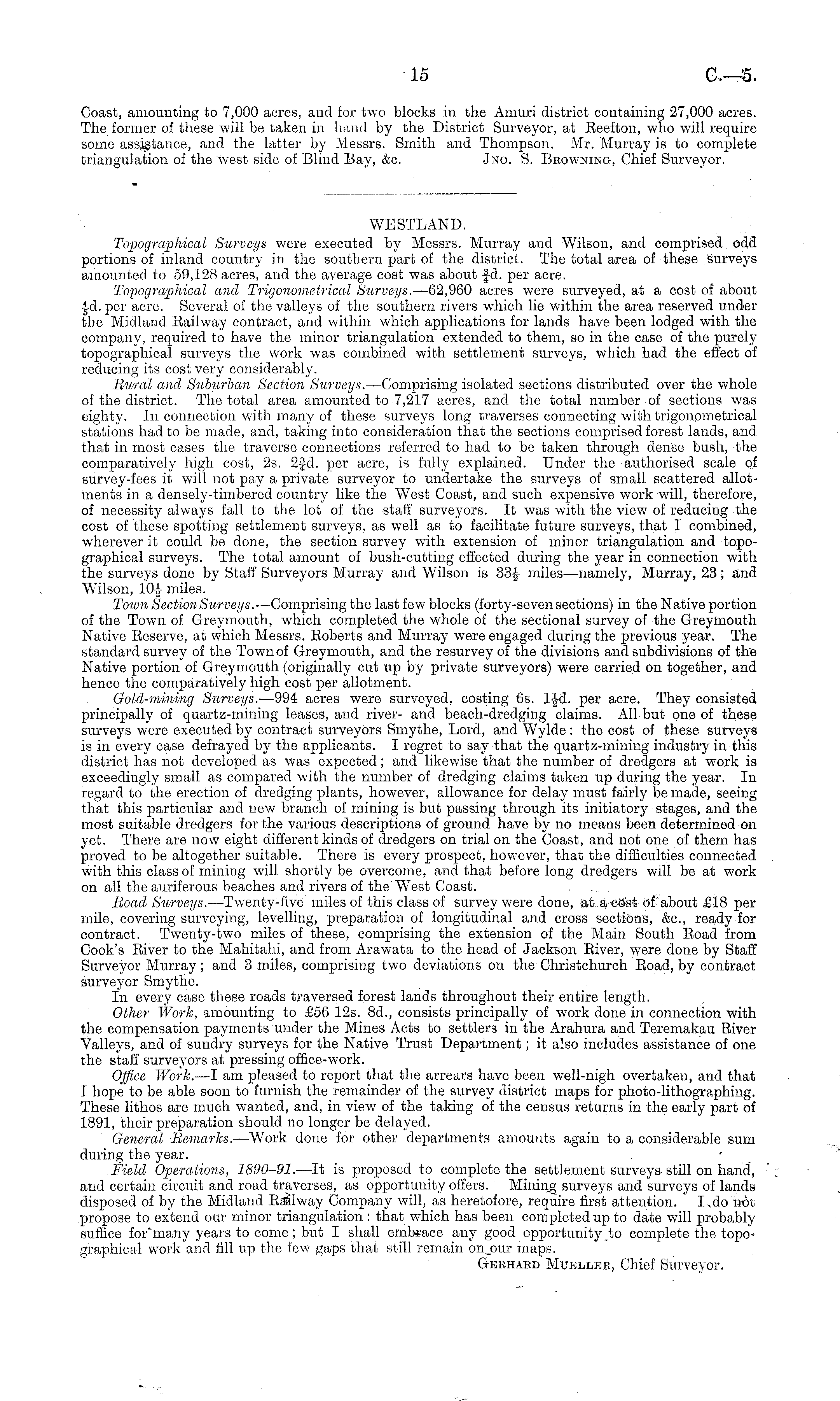 WESTLAND. Topographical Surveys were executed by Messrs. Murray and Wilson, and comprised odd portions of inland country in the southern part of the district. The total area of these surveys amounted to 59,128 acres, and the average cost was about fd. per acre. Topographical and Trigonometrical Surveys.— l>2,96o acres Avere surveyed, at a cost of about |-d. per acre. Several of the valleys of the southern rivers which lie within the area reserved under the Midland Railway contract, and within which applications for lands have been lodged Avith the company, required to have the minor triangulation extended to them, so in the case of the purely topographical surveys the work was combined with settlement surveys, which had the effect of reducing its cost very considerably. Rural and Suburban Section Surveys. —Comprising isolated sections distributed over the whole of the district. The total area amounted to 7,217 acres, and the total number of sections Avas eighty. In connection with many of these surveys long traverses connecting with trigonometrical stations had to be made, and, taking into consideration that the sections comprised forest lands, and that in most cases the traverse connections referred to had to be taken through dense bush, the comparatively high cost, 2s. 2fd. per acre, is fully explained. Under the authorised scale of survey-fees it will not pay a private surveyor to undertake the surveys of small scattered allotments in a densely-timbered country like the West Coast, and such expensive work will, therefore, of necessity always fall to the lot of the staff surveyors. It was with the view of reducing the cost of these spotting settlement surveys, as well as to facilitate future surveys, that I combined, wherever it could be done, the section survey with extension of minor triangulation and topographical surveys. The total amount of bush-cutting effected during the year in connection with the surveys done by Staff Surveyors Murray and Wilson is 334- miles —namely, Murray, 23; and Wilson, 10-|- miles. Town Section Surveys. —Comprising the last few blocks (forty-seven sections) in the Native portion of the Town of Greymouth, which completed the whole of the sectional survey of the Greymouth Native Reserve, at Which Messrs. Roberts and Murray were engaged during the previous year. The standard survey of the Town of Greymouth, and the resurvey of the divisions and subdivisions of the Native portion of Greymouth (originally cut up by private surveyors) were carried on together, and hence the comparatively high cost per allotment. Gold-mining Surveys. —994 acres were surveyed, costing 6s. 1-J-d. per acre. They consisted principally of quartz-mining leases, and river- and beach-dredging claims. All but one of these surveys were executed by contract surveyors Smythe, Lord, and Wylde : the cost of these surveys is in every case defrayed by the applicants. I regret to say that the quartz-mining industry in this district has not deA'eloped as was expected; and likewise that the number of dredgers at work is exceedingly small as compared with the number of dredging claims taken up during the year. In regard to the erection of dredging plants, however, allowance for delay must fairly be made, seeing that this particular and neAv branch of mining is but passing through its initiatory stages, and the most suitable dredgers for the various descriptions of ground have by no means been determined on yet. There are now eight different kinds of dredgers on trial on the Coast, and not one of them has proved to be altogether suitable. There is every prospect, however, that the difficulties connected with this class of mining will shortly be overcome, and that before long dredgers will be at work on all the auriferous beaches and rivers of the West Coast. Road Surveys. —Twenty-five miles of this class of survey were done, at a cost of about £18 per mile, covering surveying, levelling, preparation of longitudinal and cross sections, &c, ready for contract. Twenty-two miles of these, comprising the extension of the Main South Eoad from Cook's Eiver to the Mahitahi, and from Arawata to the head of Jackson River, were done by Staff Surveyor Murray; and 3 miles, comprising two deviations on the Christchurch Road, by contract surveyor Smythe. In every case these roads traversed forest lands throughout their entire length. Other Work, amounting to £56 12s. Bd., consists principally of work done in connection with the compensation payments under the Mines Acts to settlers in the Arahura and Teremakau River Valleys, and of sundry surveys for the Native Trust Department; it also includes assistance of one the staff surveyors at pressing office-work. Office Work. —I am pleased to report that the arrears have been Avell-nigh overtaken, and that I hope to be able soon to furnish the remainder of the survey district maps for photo-lithographing. These lithos are much Avanted, and, in view of the taking of the census returns in the early part of 1891, tlieir preparation should no longer be delayed. General Remarks. —Work done for other departments amounts again to a considerable sum during the year. Field Operations, 1890-91. —It is proposed to complete the settlement surveys still on hand, and certain circuit and road traverses, as opportunity offers. Mining surveys and surveys of lands disposed of by the Midland Rsilway Company will, as heretofore, require first attention. Ido not propose to extend our minor triangulation : that which has been completed up to date will probably suffice for'many years to come; but I shall embrace any good opportunity to complete the topographical work and fill up the few gaps that still remain on_our maps. Gerhard Mueller, Chief Surveyor.