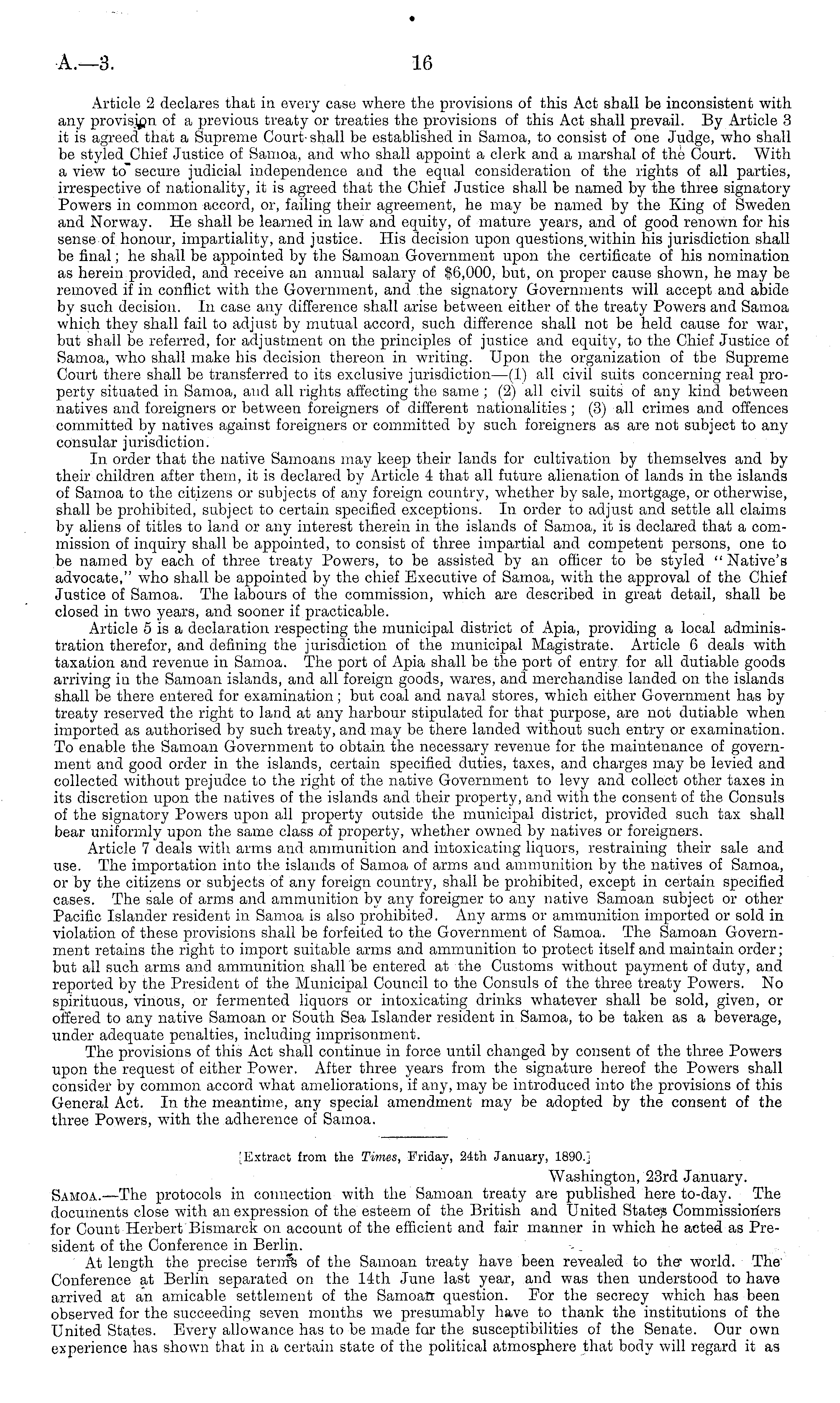 [Extract from the Times, Friday, 24th January, 1890.j Washington, 23rd January. Samoa. —The protocols in connection with the Samoan treaty are published here to-day. The documents close with an expression of the esteem of the British and United States Commissioners for Count Herbert Bismarck on account of the efficient and fair manner in which he acted as President of the Conference in Berlin. At length the precise term% of the Samoan treaty have been revealed to the- world. The Conference at Berlin separated on the 14th June last year, and was then understood to have arrived at an amicable settlement of the SamoaQ question. For the secrecy which has been observed for the succeeding seven months we presumably have to thank the institutions of the United States. Every allowance has to be made far the susceptibilities of the Senate. Our own experience has shown that in a certain state of the political atmosphere that body will regard it as