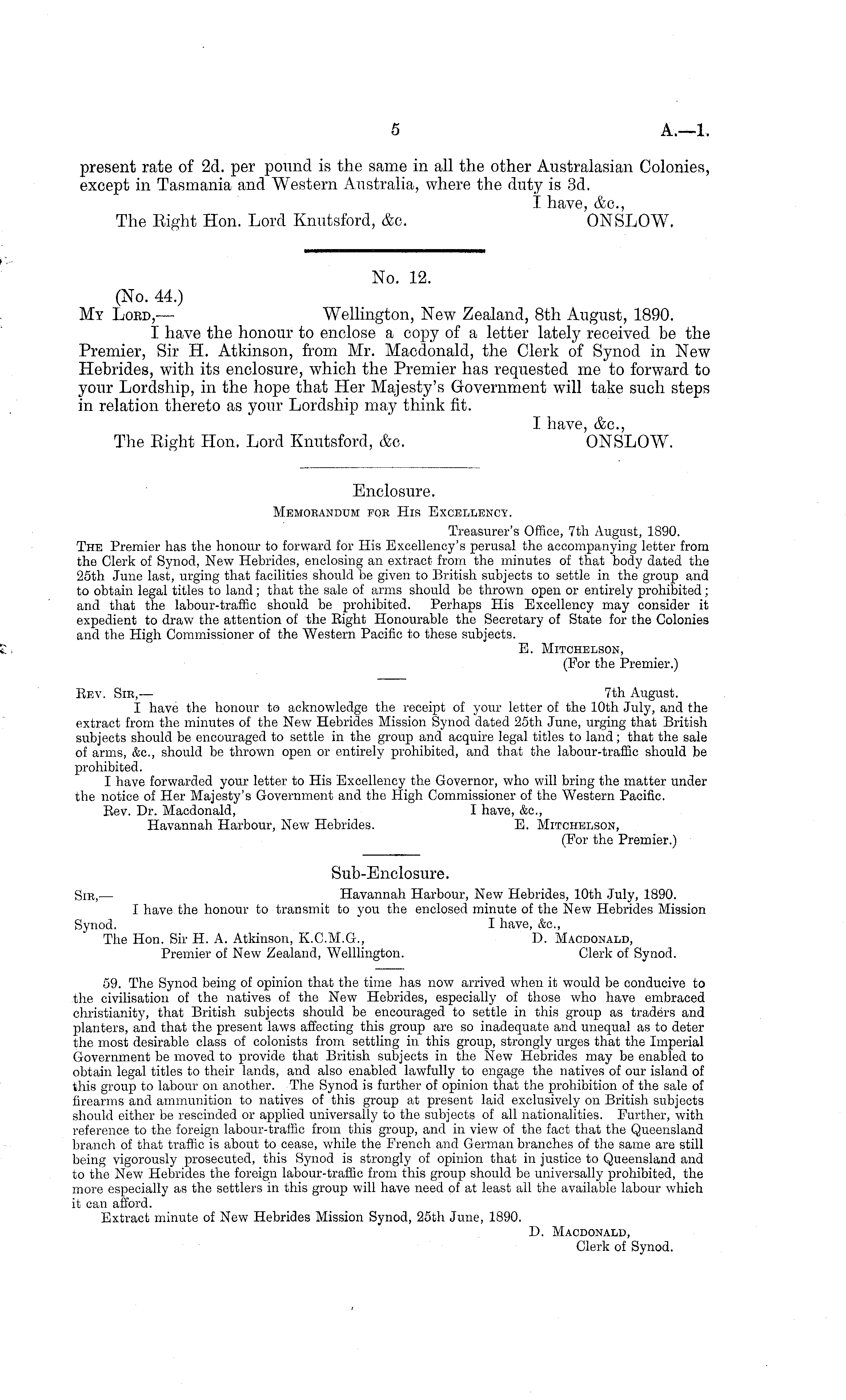 No. 12. (No. 44.) My Lokd,— Wellington, New Zealand, Bth August, 1890. I have the honour to enclose a copy of a letter lately received be the Premier, Sir H. Atkinson, from Mr. Macdonald, the Clerk of Synod in New Hebrides, with its enclosure, which the Premier has requested me to forward to your Lordship, in the hope that Her Majesty's Government will take such steps in relation thereto as your Lordship may think fit. I have, &c, The Right Hon. Lord Knutsford, &c. ONSLOW.
