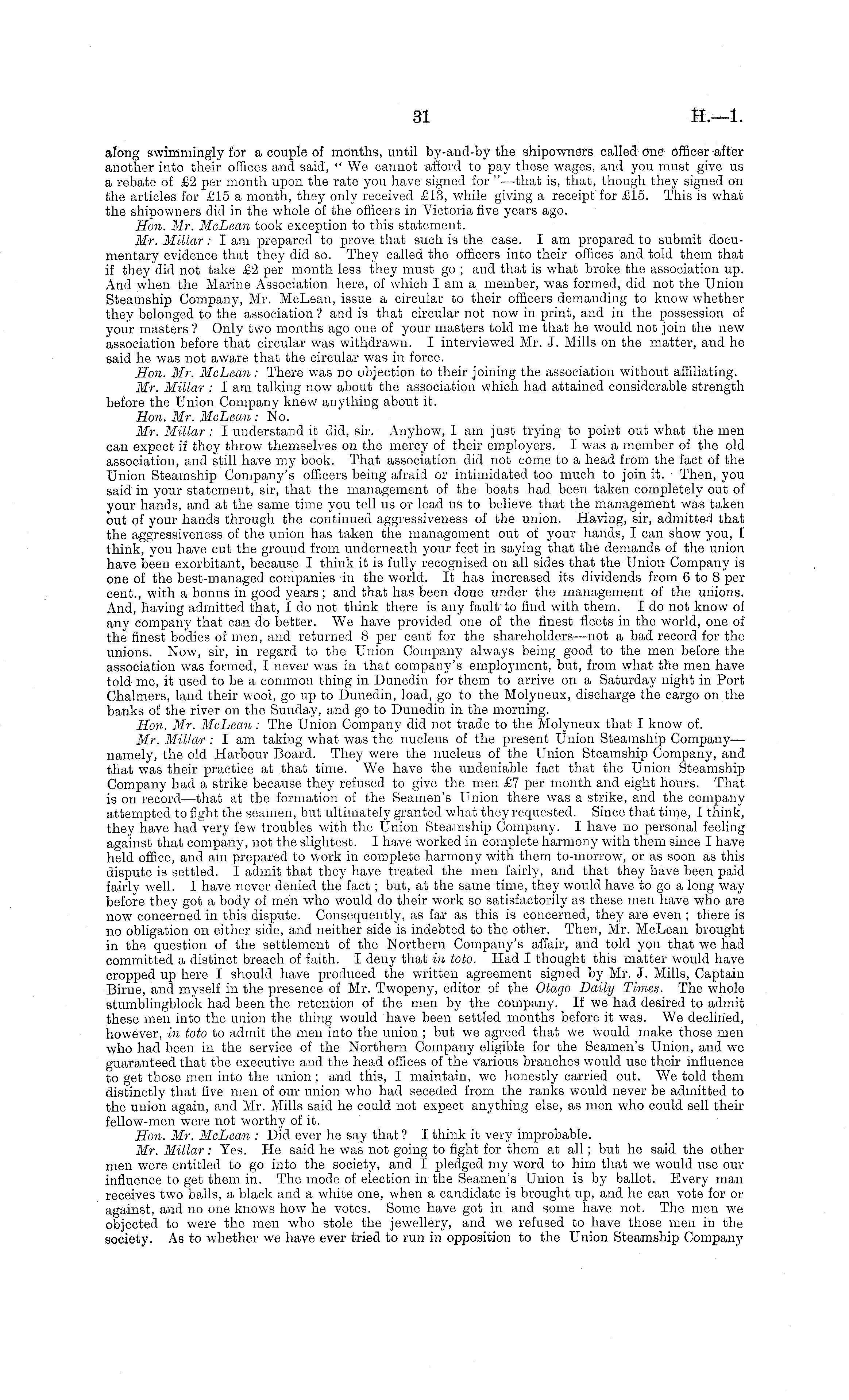 along swimmingly for a couple of months, until by-and-by the shipowners called one officer after another into their offices and said, " We cannot afford to pay these wages, and you must give us a rebate of £2 per month upon the rate you have signed for " —that is, that, though they signed on the articles for £15 a month, they only received £13, while giving a receipt for £15. This is what the shipowners did in the whole of the officers in Victoria five years ago. Hon. Mr. McLean took exception to this statement. Mr. Millar: lam prepared to prove that such is the case. I am prepared to submit documentary evidence that they did so. They called the officers into their offices and told them that if they did not take £2 per month less they must go ; and that is what broke the association up. And when the Marine Association here, of which I am a member, was formed, did not the Union Steamship Company, Mr. McLean, issue a circular to their officers demanding to know whether they belonged to the association ? and is that circular not now in print, and in the possession of your masters ? Only two months ago one of your masters told me that he would not join the new association before that circular was withdrawn. I interviewed Mr. J. Mills on the matter, and he said he was not aware that the circular was in force. Hon. Mr. McLean : There was no objection to their joining the association without affiliating. Mr. Millar : I am talking now about the association which had attained considerable strength before the Union Company knew anything about it. Hon. Mr. McLean : No. Mr. Millar : I understand it did, sir. Anyhow, I am just trying to point out what the men can expect if they throw themselves on the mercy of their employers. I was a member of the old association, and still have my book. That association did not come to a head from the fact of the Union Steamship Company's officers being afraid or intimidated too much to join it. Then, you said in your statement, sir, that the management of the boats had been taken completely out of your hands, and at the same time you tell us or lead us to believe that the management was taken out of your hands through the continued aggressiveness of the union. Having, sir, admitted that the aggressiveness of the union has taken the management out of your hands, I can show you, I think, you have cut the ground from underneath your feet in saying that the demands of the union have been exorbitant, because I think it is fully recognised on all sides that the Union Company is one of the best-managed companies in the world. It has increased its dividends from 6to 8 per cent., with a bonus in good years; and that has been done under the management of the unions. And, having admitted that, Ido not think there is any fault to find with them. Ido not know of any company that can do better. We have provided one of the finest fleets in the world, one of the finest bodies of men, and returned 8 per cent for the shareholders —not a bad record for the unions. Now, sir, in regard to the Union Company always being good to the men before the association was formed, I never was in that company's employment, but, from what the men have told me, it used to be a common thing in Dunedin for them to arrive on a Saturday night in Port Chalmers, land their wool, go up to Dunedin, load, go to the Molyneux, discharge the cargo on the banks of the river on the Sunday, and go to Dunedin in the morning. Hon. Mr. McLean: The Union Company did not trade to the Molyneux that I know of. Mr. Millar : I am taking what was the nucleus of the present Union Steamship Company— namely, the old Harbour Board. They were the nucleus of the Union Steamship Company, and that was their practice at that time. We have the undeniable fact that the Union Steamship Company had a strike because they refused to give the men £7 per month and eight hours. That is on record —that at the formation of the Seamen's Union there was a strike, and the company attempted to fight the seamen, but ultimately granted what they requested. Since that time, I think, they have had very few- troubles with the Union Steamship Company. I have no personal feeling against that company, not the slightest. I have worked in complete harmony with them since I have held office, and am prepared to work in complete harmony with them to-morrow, or as soon as this dispute is settled. I admit that they have treated the men fairly, and that they have been paid fairly well. I have never denied the fact ; but, at the same time, they would have to go a long way before they got a body of men who would do their work so satisfactorily as these men have who are now concerned in this dispute. Consequently, as far as this is concerned, they are even ; there is no obligation on either side, and neither side is indebted to the other. Then, Mr. McLean brought in the question of the settlement of the Northern Company's affair, and told you that we had committed a distinct breach of faith. I deny that in toto. Had I thought this matter would have cropped up here I should have produced the written agreement signed by Mr. J. Mills, Captain Birne, and myself in the presence of Mr. Twopeny, editor of the Otago Daily Times. The whole stumbling-block had been the retention of the men by the company. If we had desired to admit these men into the union the thing would have been settled months before it was. We declined, however, in toto to admit the men into the union ; but we agreed that we would make those men who had been in the service of the Northern Company eligible for the Seamen's Union, and we guaranteed that the executive and the head offices of the various branches would use their influence to get those men into the union; and this, I maintain, we honestly carried out. We told them distinctly that five men of our union who had seceded from the ranks would never be admitted to the union again, and Mr. Mills said he could not expect anything else, a