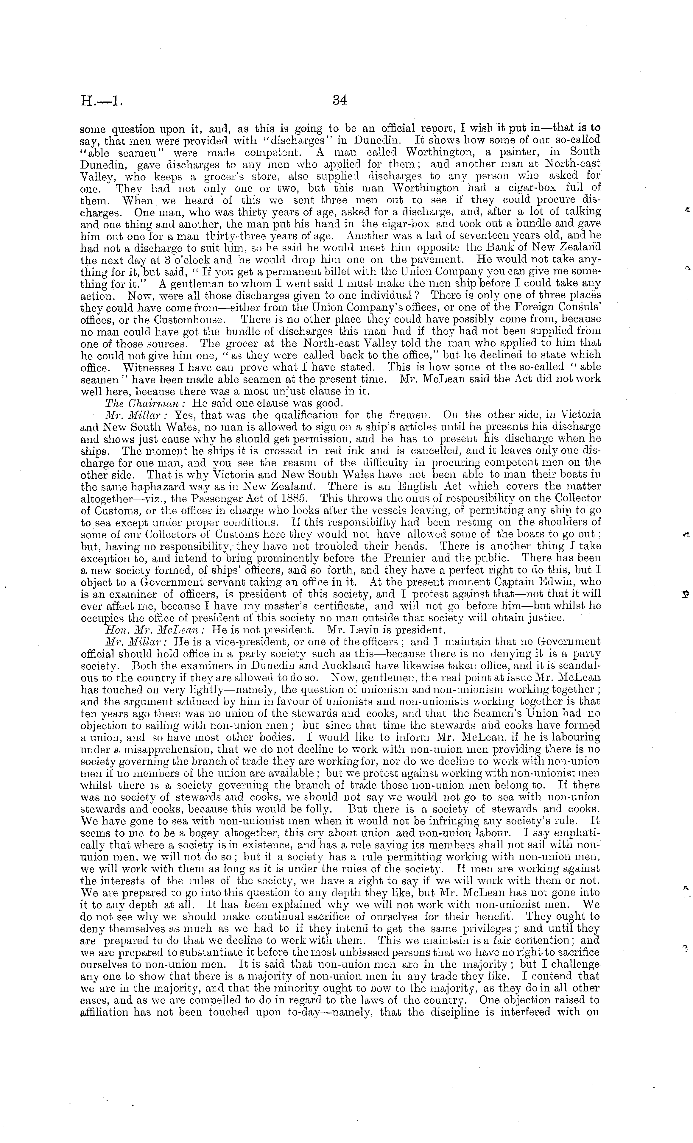 some question upon it, aud, as this is going to be an official report, I wish it put in—that is to say, that men were provided with "discharges" in Dunedin. It shows how some of our so-called "able seamen" were made competent. A man called Worthington, a painter, in South Dunedin, gave discharges to any men who applied for them; and another man at North-east Valley, who keeps a grocer's store, also supplied discharges to any person who asked for one. " They had not only one or two, but this man Worthington had a cigar-box full of them. When we heard of this we sent three men out to see if they could procure discharges. One man, who was thirty years of age, asked for a discharge, and, after a lot of talking and one thing and another, the man put his hand in the cigar-box and took out a bundle and gave him out one for a man thirty-three years of age. Another was a lad of seventeen years old, and he had not a discharge to suit him, so he said he would meet him opposite the Bank of New Zealand the next day at 3 o'clock and he would drop him one on the pavement. He would not take anything for it, but said, " If you get a permanent billet with the Union Company you can give me something for it." A gentleman to whom I went said I must make the men ship before I could take any action. Now, were all those discharges given to one individual ? There is only one of three places they could have come from—either from the Union Company's offices, or one of the Foreign Consuls' offices, or the Customhouse. There is no other place they could have possibly come from, because no man could have got the bundle of discharges this man had if they had not been supplied from one of those sources. The grocer at the North-east Valley told the man who applied to him that he could not give him one, " as they were called back to the office," but he declined to state which office. Witnesses I have can prove what I have stated. This is how some of the so-called " able seamen " have been made able seamen at the present time. Mr. McLean said the Act did not work well here, because there was a most unjust clause in it. The Chairman : He said one clause was good. Mr. Millar: Yes, that was the qualification for the firemen. On the other side, in Victoria and New South Wales, no man is allowed to sign on a ship's articles until he presents his discharge and shows just cause why he should get permission, and he has to present his discharge when he ships. The moment he ships it is crossed in red ink and is cancelled, and it leaves only one discharge for one man, aud you see the reason of the difficulty in procuring competent men on the other side. That is why Victoria and New South Wales have not been able to man their boats in the same haphazard way as in New Zealand. There is an English Act which covers the matter altogether—viz., the Passenger Act of 1885. This throws the onus of responsibility on the Collector of Customs, or the officer in charge who looks after the vessels leaving, of permitting any ship to go to sea except under proper conditions. If this responsibility had been resting on the shoulders of some of our Collectors of Customs here they would not have allowed some of the boats to go out; but, having no responsibility, they have not troubled their heads. There is another thing I take exception to, and intend to bring prominently before the Premier and the public. There has been a new society formed, of ships' officers, and so forth, and they have a perfect right to do this, but I object to a Government servant taking an office in it. At the present moment Captain Edwin, who is an examiner of officers, is president of this society, and I protest against that—not that it will ever affect me, because I have my master's certificate, and will not go before him—butwhilsthe occupies the office of president of this society no man outside that society will obtain justice. Hon. Mr. McLean : He is not president. Mr. Levin is president. Mr. Millar: He is a vice-president, or one of the officers ; and 1 maintain that no Government official should hold office in a party society such as this —because there is no denying it is a party society. Both the examiners in Duuedin and Auckland have likewise taken office, and it is scandalous to the country if they are allowed to do so. Now, gentlemen, the real point at issue Mr. McLean has touched on very lightly—namely, the question of unionism and non-unionism working together ; and the argument adduced by him in favour of unionists and non-unionists working together is that ten years ago there was no union of the stewards and cooks, and that the Seamen's Union had no objection to sailing with non-union men ; but since that time the stewards and cooks have formed a union, and so have most other bodies. I would like to inform Mr. McLean, if he is labouring under a misapprehension, that we do not decline to work with non-union men providing there is no society governing the branch of trade they are working for, nor do we decline to work with non-union men if no members of the union are available ; but we protest against working with non-unionist men whilst there is a society governing the branch of trade those non-union men belong to. If there was no society of stewards and cooks, we should not say we would not go to sea with non-union stewards and cooks, because this would be folly. But there is a society of stewards and cooks. We have gone to sea with non-unionist men when it would not be infringing any society's rule. It seems to me to be a bogey altogether, this cry about union and non-union labour. I say emphatically that where a society is in existence, and has a rule saying its members shall not sail with nonunion men, we will not do so; but if a society has a rule permitting working with non-union men, we will work with them as long as it is under the rules of the society. If men are working against the interests of the rules of the society, we have a right to 