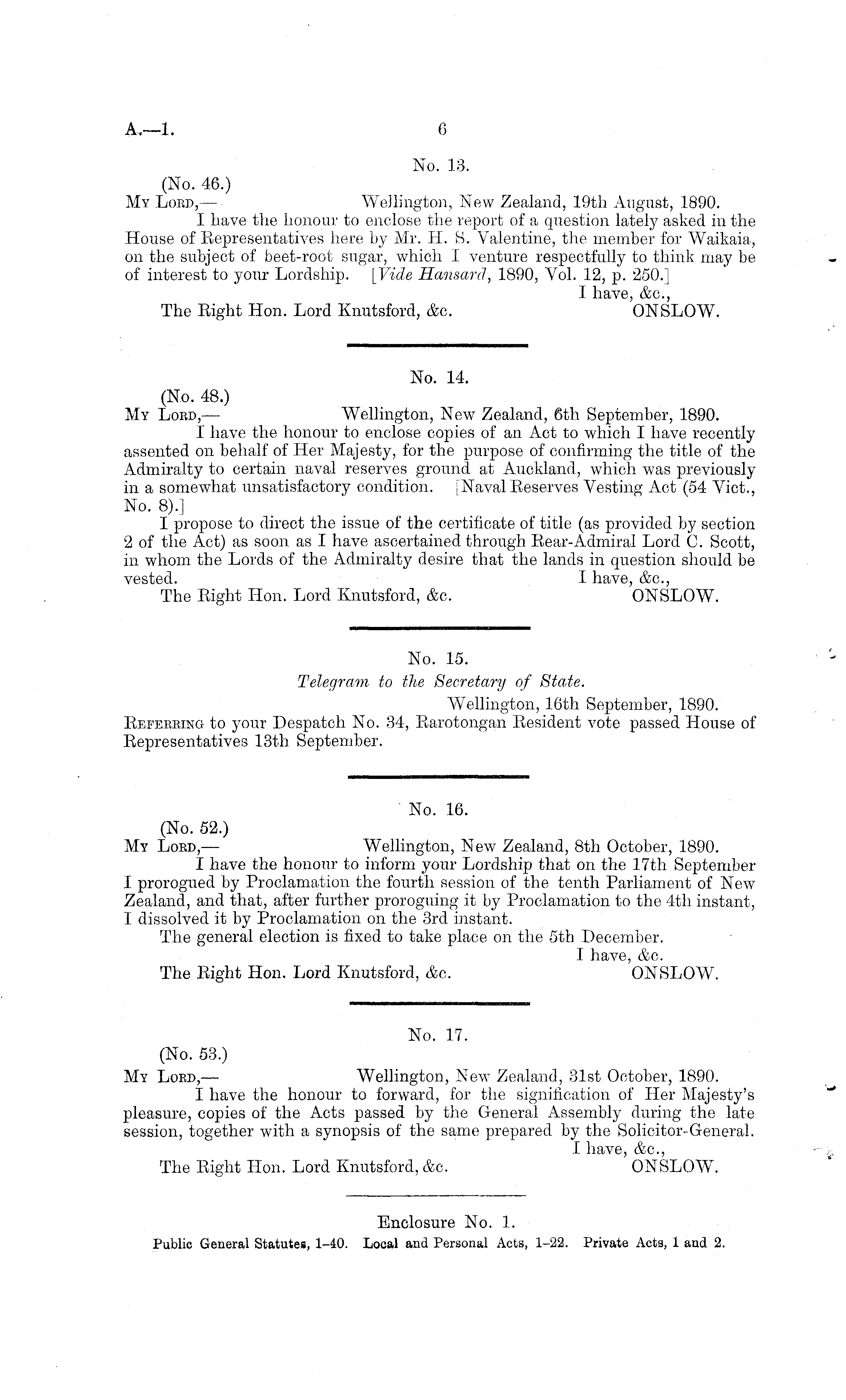 No. 16. (No. 52.) My Lord, — Wellington, New Zealand, Bth October, 1890. I have the honour to inform your Lordship that on the 17th September I prorogued by Proclamation the fourth session of the tenth Parliament of New Zealand, and that, after further proroguing it by Proclamation to the 4th instant, I dissolved it by Proclamation on the 3rd instant. The general election is fixed to take place on the sth December. I have, &c. The Eight Hon. Lord Knutsford, &c. ONSLOW.