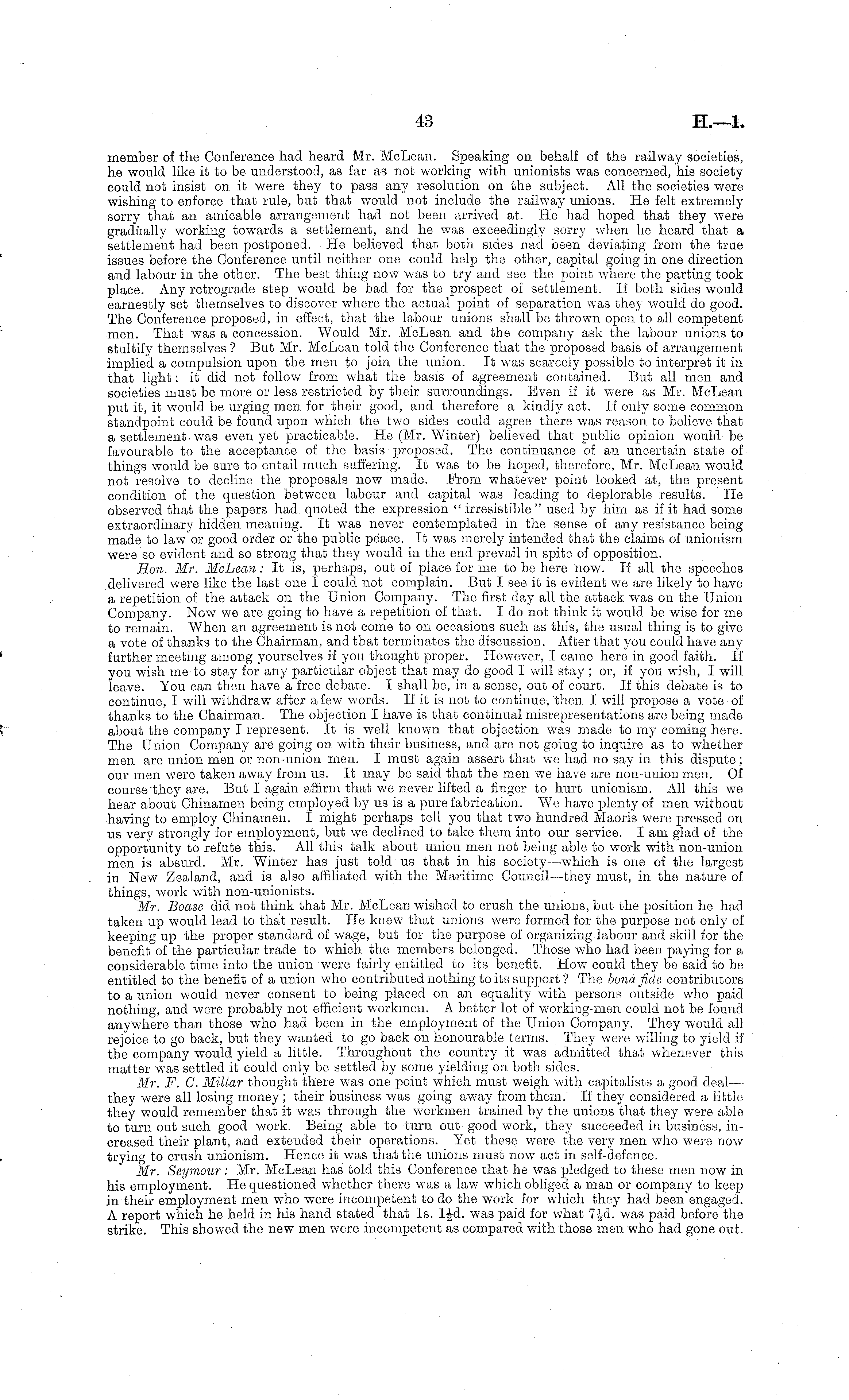 member of the Conference had heard Mr. McLean. Speaking on behalf of the railway societies, he would like it to be understood, as far as not working with unionists was concerned, his society could not insist on it were they to pass any resolution on the subject. All the societies were, wishing to enforce that rule, but that would not include the railway unions. He felt extremely sorry that an amicable arrangement had not been arrived at. He had hoped that they were gradually working towards a settlement, and he was exceedingly sorry when he heard that a settlement had been postponed. He believed that; both sides nail been deviating from the true issues before the Conference until neither one could help the other, capital going in one direction and labour in the other. The best thing now was to try and see the point where the parting took place. Any retrograde step would be bad for the prospect of settlement. If both sides would earnestly set themselves to discover where the actual point of separation was they would do good. The Conference proposed, in effect, that the labour unions shall be thrown open to all competent men. That was a concession. Would Mr. McLean and the company ask the labour unions to stultify themselves ? But Mr. McLean told the Conference that the proposed basis of arrangement implied a compulsion upon the men to join the union. It was scarcely possible to interpret it in that light: it did not follow from what the basis of agreement contained. But all men and societies must be more or less restricted by their surroundings. Even if it were as Mr. McLean put it, it would be urging men for their good, and therefore a kindly act. If only some common standpoint could be found upon which the two sides could agree there was reason to believe that a settlement, was even yet practicable. He (Mr. Winter) believed that public opinion would be favourable to the acceptance of the basis proposed. The continuance of an uncertain state of things would be sure to entail much suffering. It was to be hoped, therefore, Mr. McLean would not resolve to decline the proposals now made. From whatever poiut looked at, the present condition of the question between labour and capital was leading to deplorable results. He observed that the papers had quoted the expression "irresistible" used by him as if it had some extraordinary hidden meaning. It was never contemplated in the sense of any resistance being made to law or good order or the public peace. It was merely intended that the claims of unionism were so evident and so strong that they would in the end prevail in spite of opposition. Hon. Mr. McLean: It is, perhaps, out of place for me to be here now. If all the speeches delivered were like the last one I could not complain. But I see it is evident we are likely to have a repetition of the attack on the Onion Company. The first day all the attack was on the Union Company. Now we are going to have a repetition of that. Ido not think it would be wise for me to remain. When an agreement is not come to on occasions such as this, the usual thing is to give a vote of thanks to the Chairman, and that terminates the discussion. After that you could have any further meeting among yourselves if you thought proper. However, I came here in good faith. If you wish me to stay for any particular object that may do good 1 will stay ; or, if you wish, I will leave. You can then have a free debate. I shall be, in a sense, out of court. If this debate is to continue, I will withdraw after a few words. If it is not to continue, then I will propose a vote of thanks to the Chairman. The objection I have is that continual misrepresentations are being made about the company I represent. It is well known that objection was made to my coming here. The Union Company are going on with their business, and are not going to inquire as to whether men are union men or non-union men. I must again assert that we had no say in this dispute; our men were taken away from us. It may he said that the men we have are non-union men. Of course they are. But I again affirm that we never lifted a finger to hurt unionism. All this we hear about Chinamen being employed by us is a pure fabrication. We have plenty of men without having to employ Chinamen. I might perhaps tell you that two hundred Maoris were pressed on us very strongly for employment, but we declined to take them into our service. lam glad of the opportunity to refute this. All this talk about union men not being able to work with non-union men is absurd. Mr. Winter has just told us that in his society-—which, is one of the largest in New Zealand, and is also affiliated with the Maritime Council—they must, in the nature of things, work with non-unionists. Mr. Boase did not think that Mr. McLean wished to crush the unions, but the position he had taken up would lead to that result. He knew that unions were formed for the purpose not only of keeping up the proper standard of wage, but for the purpose of organizing labour and skill for the benefit of the particular trade to which the members belonged. Those who had been paying for a considerable time into the union were fairly entitled to its benefit. How could they be said to be entitled to the benefit of a union who contributed nothing to its support ? The hona fide contributors to a union would never consent to being placed on an equality with persons outside who paid nothing, and were probably not efficient workmen. A better lot of working-men could not be found anywhere than those who had been in the employment of the Union Company. They would all rejoice to go back, but they wanted to go back on honourable terms. They were willing to yield if the company would yield a little. Throughout the country it was admitted that whenever this matter was settled it could only be settled by some yielding on both sides. Mr. F. G. Millar thought there was one point which must weigh with capitalists a good deal— they were al