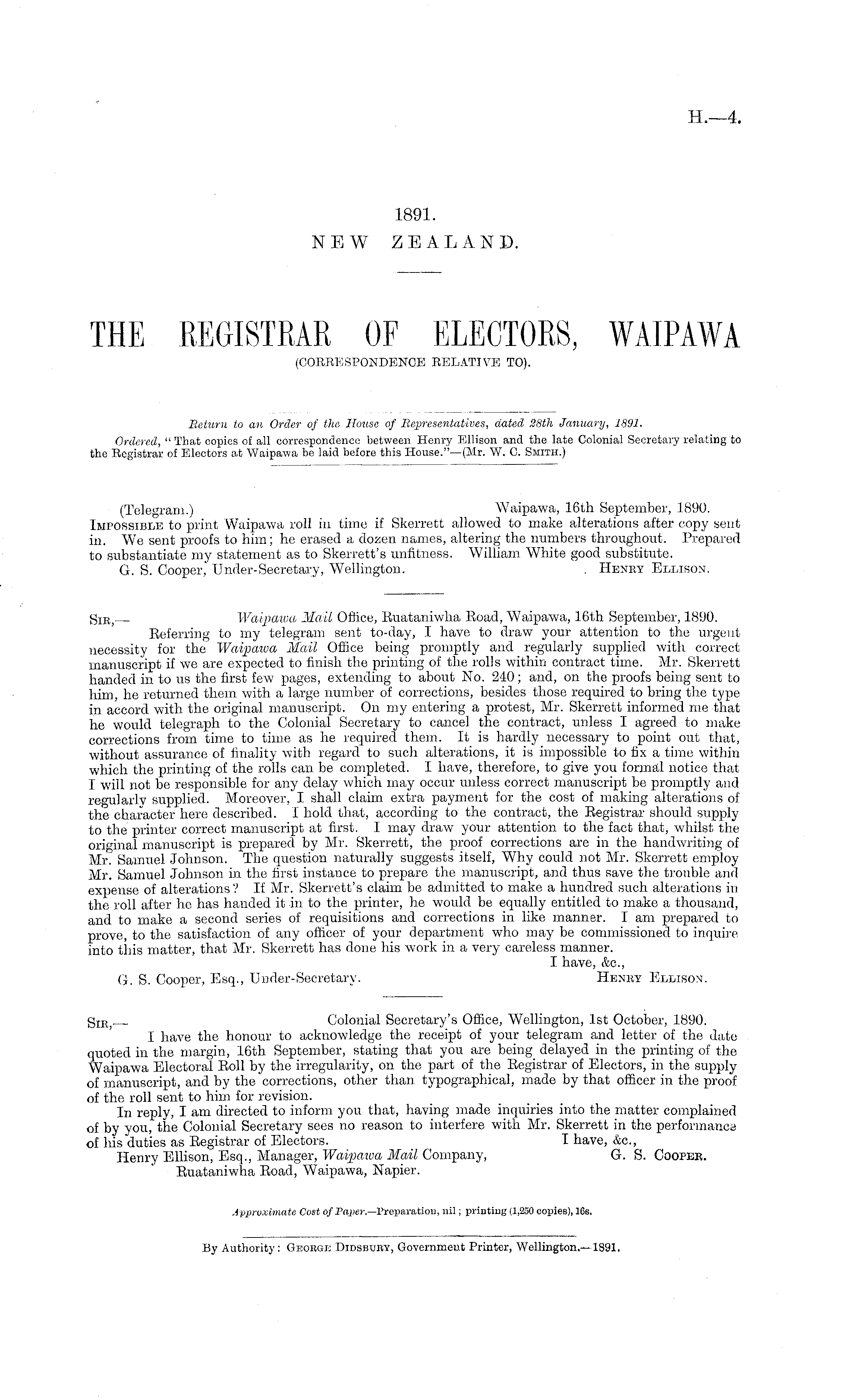 (Telegram.) Waipawa, 16th September, 1890. Impossible to print Waipawa roll in time if Skerrett allowed to make alterations after copy sent in. We sent proofs to him; he erased a dozen names, altering the numbers throughout. Prepared to substantiate my statement as to Skerrett's unfitness. William White good substitute. G. S. Cooper,' Under-Secretary, Wellington. , Henry Ellison.