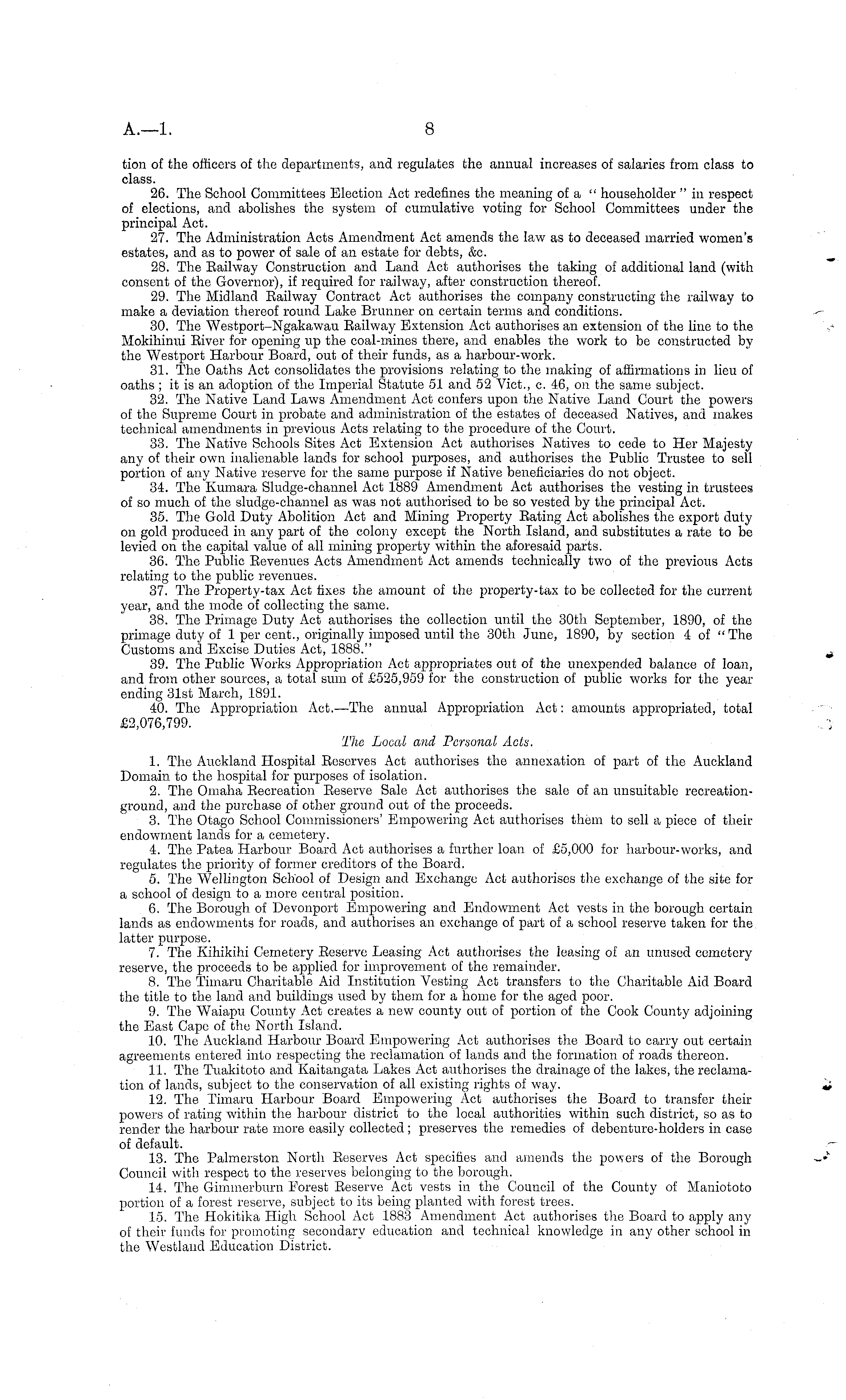 tion of the officers of the departments, and regulates the annual increases of salaries from class to class. 26. The School Committees Election Act redefines the meaning of a " householder " in respect of elections, and abolishes the system of cumulative voting for School Committees under the principal Act. 27. The Administration Acts Amendment Act amends the law as to deceased married women's estates, and as to power of sale of an estate for debts, &c. 28. The Railway Construction and Land Act authorises the taking of additional land (with consent of the Governor), if required for railway, after construction thereof. 29. The Midland Eailway Contract Act authorises the company constructing the railway to make a deviation thereof round Lake Brunner on certain terms and conditions. 30. The Westport-Ngakawau Eailway Extension Act authorises an extension of the line to the Mokihinui Eiver for opening up the coal-mines there, and enables the work to be constructed by the Westport Harbour Board, out of their funds, as a harbour-work. 31. The Oaths Act consolidates the provisions relating to the making of affirmations in lieu of oaths ; it is an adoption of the Imperial Statute 51 and 52 Vict., c. 46, on the same subject. 32. The Native Land Laws Amendment Act confers upon the Native Land Court the powers of the Supreme Court in probate and administration of the estates of deceased Natives, and makes technical amendments in previous Acts relating to the procedure of the Court. 33. The Native Schools Sites Act Extension Act authorises Natives to cede to Her Majesty any of their own inalienable lands for school purposes, and authorises the Public Trustee to sell portion of any Native reserve for the same purpose if Native beneficiaries do not object. 34. The Kumara Sludge-channel Act 1889 Amendment Act authorises the vesting in trustees of so much of the sludge-channel as was not authorised to be so vested by the principal Act. 35. The Gold Duty Abolition Act and Mining Property Eating Act abolishes the export duty on gold produced in any part of the colony except the North Island, and substitutes a rate to be levied on the capital value of all mining property within the aforesaid parts. 36. The Public Eevenues Acts Amendment Act amends technically two of the previous Acts relating to the public revenues. 37. The Property-tax Act fixes the amount of the property-tax to be collected for the current year, and the mode of collecting the same. 38. The Primage Duty Act authorises the collection until the 30th September, 1890, of the primage duty of 1 per cent., originally imposed until the 30th June, 1890, by section 4 of "The Customs and Excise Duties Act, 1888." 39. The Public Works Appropriation Act appropriates out of the unexpended balance of loan, and from other sources, a total sum of £525,959 for the construction of public works for the year ending 31st March, 1891. 40. The Appropriation Act.—The annual Appropriation Act: amounts appropriated, total £2,076,799. The Local and Personal Acta. 1. The Auckland Hospital Eeserves Act authorises the annexation of part of the Auckland Domain to the hospital for purposes of isolation. 2. The Omaha Eecreation Eeserve Sale Act authorises the sale of an unsuitable recreationground, and the purchase of other ground out of the proceeds. 3. The Otago School Commissioners' Empowering Act authorises them to sell a piece of their endowment lands for a cemetery. 4. The Patea Harbour Board Act authorises a further loan of £5,000 for harbour-works, and regulates the priority of former creditors of the Board. 5. The Wellington School of Design and Exchange Act authorises the exchange of the site for a school of design to a more central position. 6. The Borough of Devonport Empowering and Endowment Act vests in the borough certain lands as endowments for roads, and authorises an exchange of part of a school reserve taken for the latter purpose. 7. The Kihikihi Cemetery Eeserve Leasing Act authorises the leasing of an unused cemetery reserve, the proceeds to be applied for improvement of the remainder. 8. The Timaru Charitable Aid Institution Vesting Act transfers to the Charitable Aid Board the title to the land and buildings used by them for a home for the aged poor. 9. The Waiapu County Act creates a new county out of portion of the Cook County adjoining the East Gape of the North Island. 10. The Auckland Harbour Board Empowering Act authorises the Board to carry out certain agreements entered into respecting the reclamation of lands and the formation of roads thereon. 11. The Tuakitoto and Kaitangata Lakes Act authorises the drainage of the lakes, the reclamation of lands, subject to the conservation of all existing lights of way. 12. The Timaru Harbour Board Empowering Act authorises the Board to transfer their powers of rating within the harbour district to the local authorities within such district, so as to render the harbour rate more easily collected ; preserves the remedies of debenture-holders in case of default. 13. The Palmerston North Eeserves Act specifies and amends the powers of the Borough Council with respect to the reserves belonging to the borough. 14. The Gimmerburn Forest Eeserve Act vests in the Council of the County of Maniototo portion of a forest reserve, subject to its being planted with forest trees. 15. The Hokitika High School Act 1883 Amendment Act authorises the Board to apply any of their funds for promoting secondary education and technical knowledge in any other school in the Westlaud Education District.