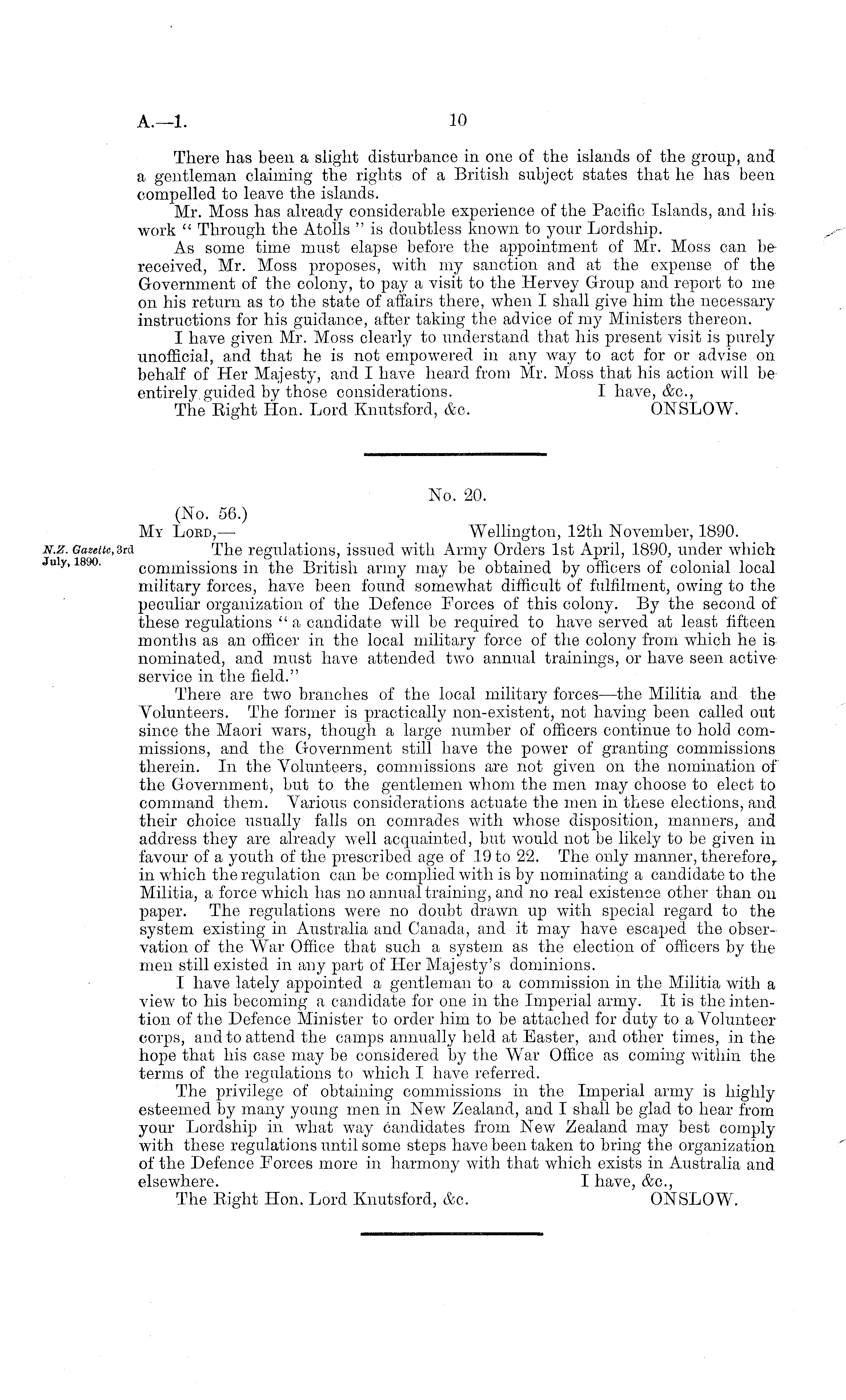 No. 20. (No. 5G.) My Loed,— Wellington, 12th November, 1890. The regulations, issued with Army Orders Ist April, 1890, under which commissions in the British army may be obtained by officers of colonial local military forces, have been found somewhat difficult of fulfilment, owing to the peculiar organization of the Defence Forces of this colony. By the second of these regulations " a candidate will be required to have served at least fifteen months as an officer in the local military force of the colony from which he is nominated, and must have attended two annual trainings, or have seen activeservice in the field." There are two branches of the local military forces-—the Militia and the Volunteers. The former is practically non-existent, not having been called out since the Maori wars, though a large number of officers continue to hold commissions, and the Government still have the power of granting commissions therein. In the Volunteers, commissions are not given on the nomination of the Government, but to the gentlemen whom the men may choose to elect to command them. Various considerations actuate the men in these elections, and their choice usually falls on comrades with whose disposition, manners, and address they are already well acquainted, but would not be likely to be given in favour of a youth of the prescribed age of 19 to 22. The only manner, therefore,. in which the regulation can be complied with is by nominating a candidate to the Militia, a force which has no annual training, and no real existence other than on paper. The regulations were no doubt drawn up with special regard to the system existing in Australia and Canada, and it may have escaped the observation of the War Office that such a system as the election of officers by the men still existed in any part of Her Majesty's dominions. I have lately appointed a gentleman to a commission in the Militia with a view to his becoming a candidate for one in the Imperial army. It is the intention of the Defence Minister to order him to be attached for duty to a Volunteer corps, and to attend the camps annually held at Easter, and other times, in the hope that his case may be considered by the War Office as coining within the terms of the regulations to which I have referred. The privilege of obtaining commissions in the Imperial army is highly esteemed by many young men in New Zealand, and I shall be glad to hear from your Lordship in what way candidates from New Zealand may best comply with these regulations until some steps have been taken to bring the organization of the Defence Forces more in harmony with that which exists in Australia and elsewhere. I have, &c, The Eight Hon. Lord Knutsford, &c. ONSLOW.