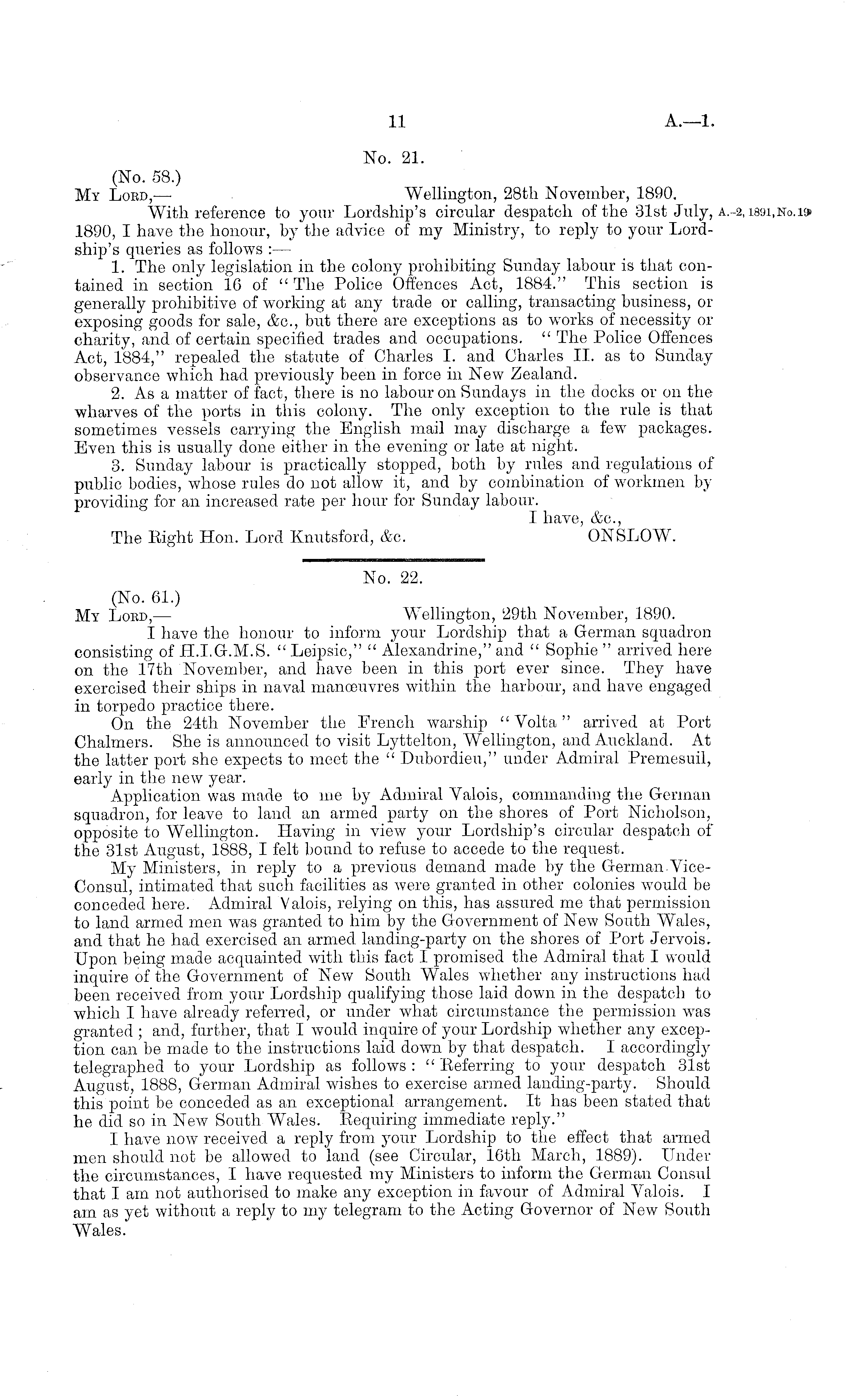 No. 21. (No. 58.) My Lord,— Wellington, 28th November, 1890. With reference to your Lordship's circular despatch of the 31st July, 1890, I have the honour, by the advice of my Ministry, to reply to your Lordship's queries as follows :— 1. The only legislation in the colony prohibiting Sunday labour is that contained in section 16 of " The Police Offences Act, 1884." This section is generally prohibitive of working at any trade or calling, transacting business, or exposing goods for sale, &c, Init there are exceptions as to works of necessity or charity, and of certain specified trades and occupations. " The Police Offences Act, 1884," repealed the statute of Charles I. and Charles 11. as to Sunday observance which had previously been in force in New Zealand. 2. As a matter of fact, there is no labour on Sundays in the docks or on the wharves of the ports in this colony. The only exception to the rule is that sometimes vessels carrying the English mail may discharge a few packages. Even this is usually done either in the evening or late at night. 3. Sunday labour is practically stopped, both by rules and regulations of public bodies, whose rules do not allow it, and by combination of workmen by providing for an increased rate per hour for Sunday labour. I have, &c, The Eight Hon. Lord Knutsford, &c. ONSLOW.