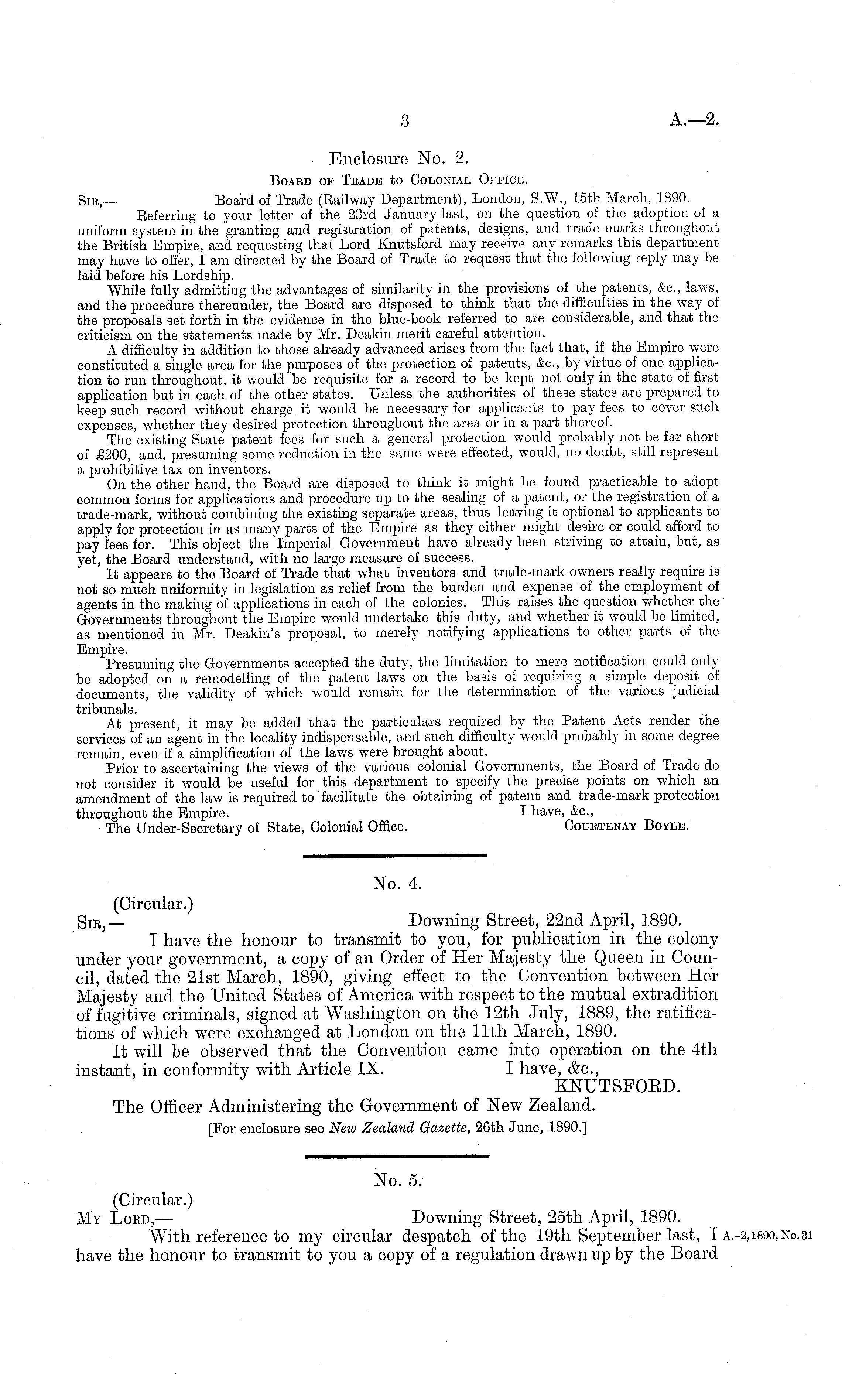Enclosure No. 2. Board op Teade to Colonial Office. Sib,— Board of Trade (Eailway Department), London, S.W., 15th March, 1890. Eeferring to your letter of the 23rd January last, on the question of the adoption of a uniform system in the granting and registration of patents, designs, and trade-marks throughout the British Empire, and requesting that Lord Knutsford may receive any remarks this department may have to offer, I am directed by the Board of Trade to request that the following reply may be laid before his Lordship. "While fully admitting the advantages of similarity in the provisions of the patents, &c, laws, and the procedure thereunder, the Board are disposed to think that the difficulties in the way of the proposals set forth in the evidence in the blue-book referred to are considerable, and that the criticism on the statements made by Mr. Deakin merit careful attention. A difficulty in addition to those already advanced arises from the fact that, if the Empire were constituted a single area for the purposes of the protection of patents, &c, by virtue of one application to run throughout, it would be requisite for a record to be kept not only in the state of first application but in each of the other states. Unless the authorities of these states are prepared to keep such record without charge it would be necessary for applicants to pay fees to cover such expenses, whether they desired protection throughout the area or in a part thereof. The existing State patent fees for such a general protection would probably not be far short of £200, and, presuming some reduction in the same were effected, would, no doubt, still represent a prohibitive tax on inventors. On the other hand, the Board are disposed to think it might be found practicable to adopt common forms for applications and procedure up to the sealing of a patent, or the registration of a trade-mark, without combining the existing separate areas, thus leaving it optional to applicants to apply for protection in as many parts of the Empire as they either might desire or could afford to pay fees for. This object the Imperial Government have already been striving to attain, but, as yet, the Board understand, with no large measure of success. It appears to the Board of Trade that what inventors and trade-mark owners really require is not so much uniformity in legislation as relief from the burden and expense of the employment of agents in the making of applications in each of the colonies. This raises the question whether the Governments throughout the Empire would undertake this duty, and whether it would be limited, as mentioned in Mr. Deakin's proposal, to merely notifying applications to other parts of the Empire. Presuming the Governments accepted the duty, the limitation to mere notification could only be adopted on a remodelling of the patent laws on the basis of requiring a simple deposit of documents, the validity of which would remain for the determination of the various judicial tribunals. At present, it may be added that the particulars required by the Patent Acts render the services of an agent in the locality indispensable, and such difficulty would probably in some degree remain, even if a simplification of the laws were brought about. Prior to ascertaining the views of the various colonial Governments, the Board of Trade do not consider it would be useful for this department to specify the precise points on which an amendment of the law is required to facilitate the obtaining of patent and trade-mark protection throughout the Empire. I have, &c, The Under-Secretary of State, Colonial Office. Coubtenay Boyle.