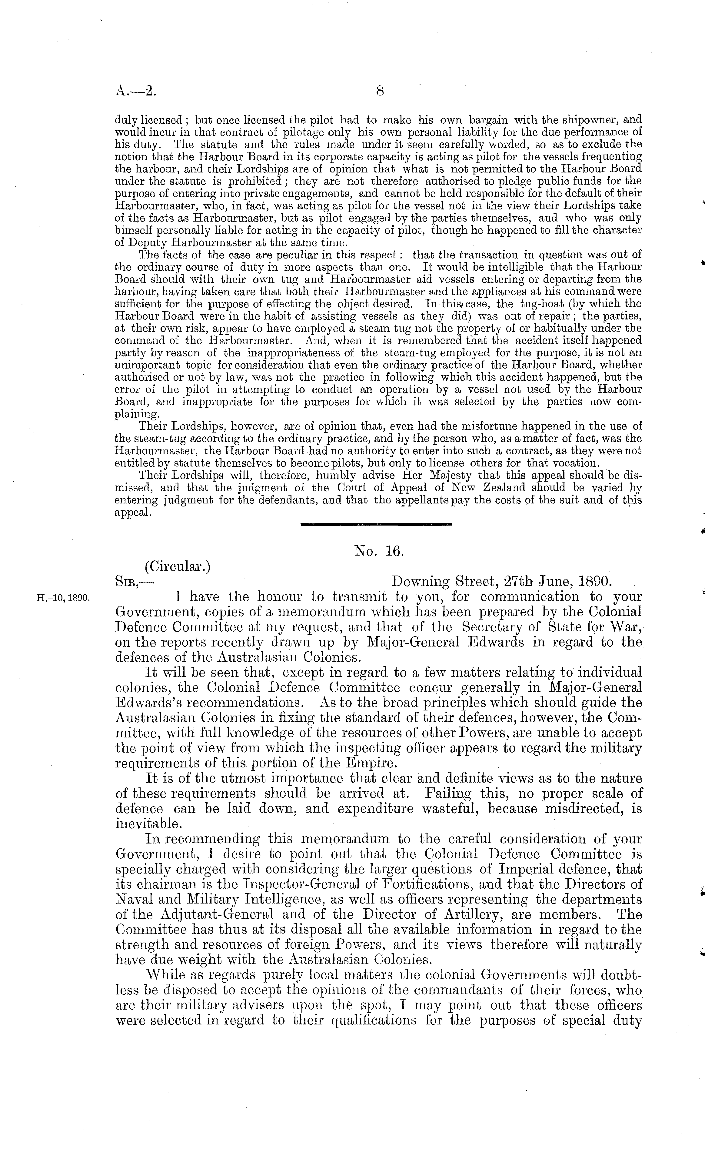 No. 16. (Circular.) Sis, — Downing Street, 27th June, 1890. I have the honour to transmit to you, for communication to your Government, copies of a memorandum which has been prepared by the Colonial Defence Committee at my request, and that of the Secretary of State for War, on the reports recently drawn up by Major-General Edwards in regard to the defences of the Australasian Colonies. It will be seen that, except in regard to a few matters relating to individual colonies, the Colonial Defence Committee concur generally in Major-General Edwards's recommendations. As to the broad principles which should guide the Australasian Colonies in fixing the standard of their defences, however, the Committee, with full knowledge of the resources of other Powers, are unable to accept the point of view from which the inspecting officer appears to regard the military requirements of this portion of the Empire. It is of the utmost importance that clear and definite views as to the nature of these requirements should be arrived at. Failing this, no proper scale of defence can be laid down, and expenditure wasteful, because misdirected, is inevitable. In recommending this memorandum to the careful consideration of your Government, I desire to point out that the Colonial Defence Committee is specially charged with considering the larger questions of Imperial defence, that its chairman is the Inspector-General of Fortifications, and that the Directors of Naval and Military Intelligence, as well as officers representing the departments of the Adjutant-General and of the Director of Artillery, are members. The Committee has thus at its disposal all the available information in regard to the strength and resources of foreign Powers, and its views therefore will naturally have due weight with the Australasian Colonies. While as regards purely local matters the colonial Governments will doubtless be disposed to accept the opinions of the commandants of their forces, who are their military advisers upon the spot, I may point out that these officers were selected in regard to their qualifications for the purposes of special duty