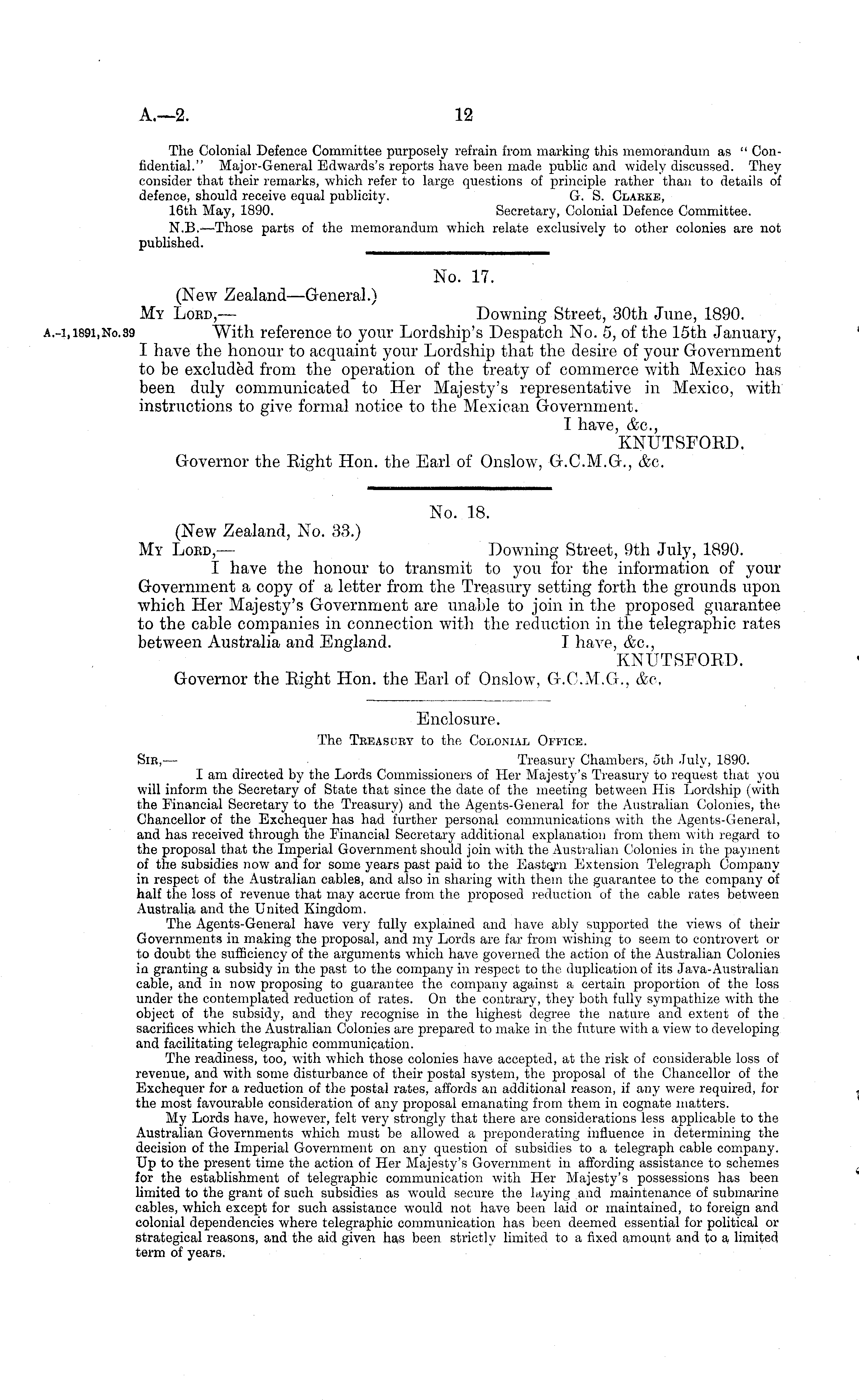Enclosure. The Treasury to the Colonial Office. Sir, — Treasury Chambers, oth July, 1890. I am directed by the Lords Commissioners of Her Majesty's Treasury to request that you will inform the Secretary of State that since the date of the meeting between His Lordship (with the Financial Secretary to the Treasury) and the Agents-General for the Australian Colonies, the Chancellor of the Exchequer has had further personal communications with the Agents-General, and has received through the Financial Secretary additional explanation from them with regard to the proposal that the Imperial Government should join with the Australian Colonies in the payment of the subsidies now and for some years past paid to the Eastqrn Extension Telegraph Company in respect of the Australian cables, and also in sharing with them the guarantee to the company of half the loss of revenue that may accrue from the proposed reduction of the cable rates between Australia and the United Kingdom. The Agents-General have very fully explained and have ably supported the views of their . Governments in making the proposal, and my Lords are far from wishing to seem to controvert or to doubt the sufficiency of the arguments which have governed the action of the Australian Colonies in granting a subsidy in the past to the company in respect to the duplication of its Java-Australian cable, and in now proposing to guarantee the company against a certain proportion of the loss under the contemplated reduction of rates. On the contrary, they both fully sympathize with the object of the subsidy, and they recognise in the highest degree the nature and extent of the sacrifices which the Australian Colonies are prepared to make in the future with a view to developing and facilitating telegraphic communication. The readiness, too, with which those colonies have accepted, at the risk of considerable loss of revenue, and with some disturbance of their postal system, the proposal of the Chancellor of the Exchequer for a reduction of the postal rates, affords an additional reason, if any were required, for the most favourable consideration of any proposal emanating from them in cognate matters. My Lords have, however, felt very strongly that there are considerations less applicable to the Australian Governments which must be allowed a preponderating influence in determining the decision of the Imperial Government on any question of subsidies to a telegraph cable company. Up to the present time the action of Her Majesty's Government in affording assistance to schemes for the establishment of telegraphic communication with Her Majesty's possessions has been limited to the grant of such subsidies as would secure the laying and maintenance of submarine cables, which except for such assistance would not have been laid or maintained, to foreign and colonial dependencies where telegraphic communication has been deemed essential for political or strategical reasons, and the aid given has been strictly limited to a fixed amount and to a limited term of years.