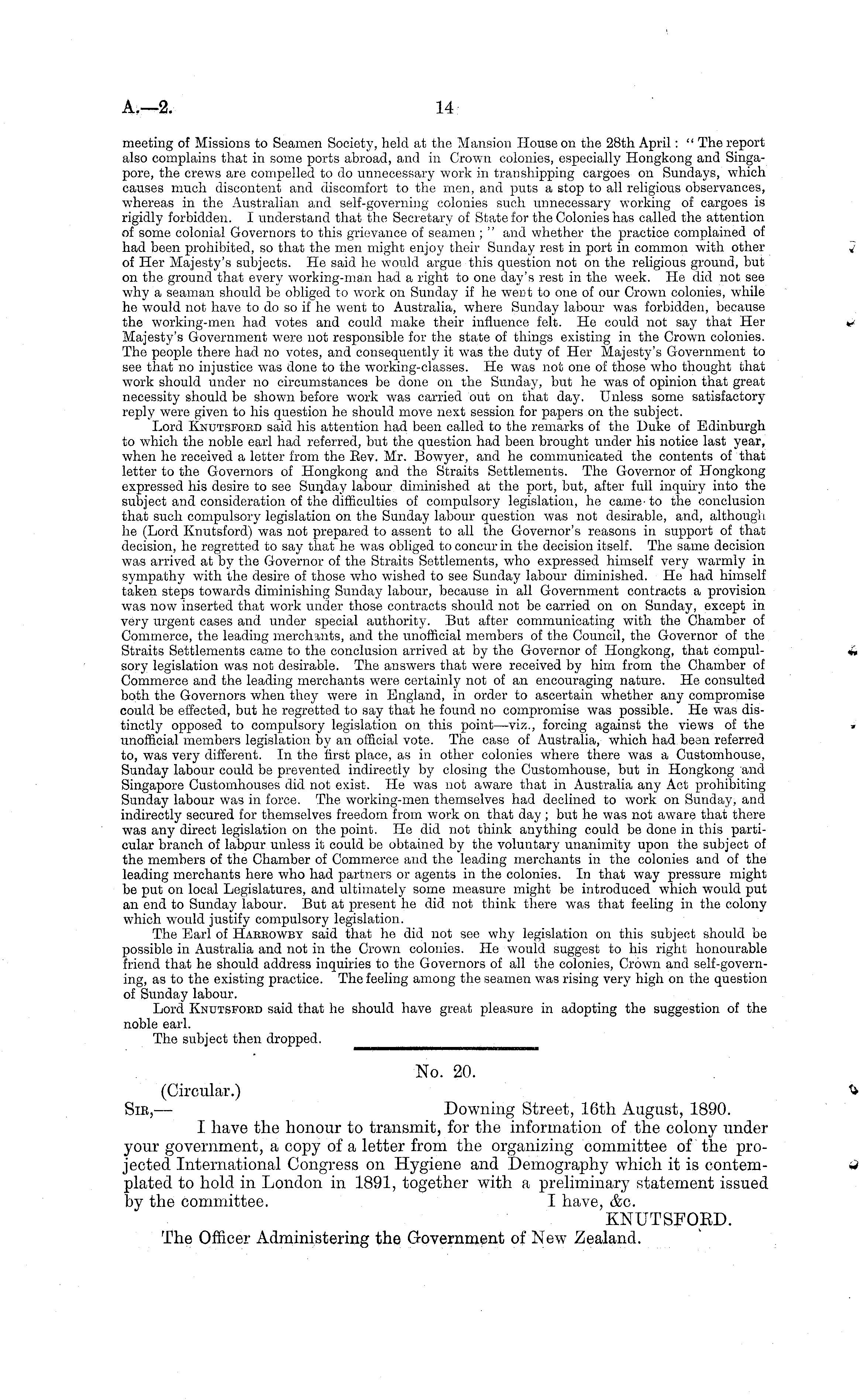 meeting of Missions to Seamen Society, held at the Mansion House on the 28th April: " The report also complains that in some ports abroad, and in Crown colonies, especially Hongkong and Singapore, the crews are compelled to do unnecessary work in transhipping cargoes on Sundays, which causes much discontent and discomfort to the men, and puts a stop to all religious observances, whereas in the Australian and self-governing colonies such unnecessary working of cargoes is rigidly forbidden. I understand that the Secretary of State for the Colonies has called the attention of some colonial Governors to this grievance of seamen ; " and whether the practice complained of had been prohibited, so that the men might enjoy their Sunday rest in port in common with other of Her Majesty's subjects. He said he would argue this question not on the religious ground, but on the ground that every working-man had a right to one day's rest in the week. He did not see why a seaman should be obliged to w T ork on Sunday if he went to one of our Crown colonies, w T hile he would not have to do so if he went to Australia, where Sunday labour was forbidden, because the working-men had votes and could make their influence felt. He could not say that Her Majesty's Government w r ere not responsible for the state of things existing in the Crown colonies. The people there had no votes, and consequently it was the duty of Her Majesty's Government to see that no injustice was done to the working-classes. He was not one of those who thought that work should under no circumstances be done on the Sunday, but he was of opinion that great necessity should be shown before work was carried out on that day. Unless some satisfactory reply were given to his question he should move next session for papers on the subject. Lord Kndtsfobd said his attention had been called to the remarks of the Duke of Edinburgh to which the noble earl had referred, but the question had been brought under his notice last year, when he received a letter from the Eev. Mr. Bowyer, and he communicated the contents of that letter to the Governors of Hongkong and the Straits Settlements. The Governor of Hongkong expressed his desire to see Sunday labour diminished at the port, but, after full inquiry into the subject and consideration of the difficulties of compulsory legislation, he came- to the conclusion that such compulsory legislation on the Sunday labour question was not desirable, and, although, he (Lord Knutsford) was not prepared to assent to all the Governor's reasons in support of that decision, he regretted to say that he was obliged to concur in the decision itself. The same decision was arrived at by the Governor of the Straits Settlements, who expressed himself very warmly in sympathy with the desire of those who wished to see Sunday labour diminished. He had himself taken steps towards diminishing Sunday labour, because in all Government contracts a provision was now inserted that work under those contracts should not be carried on on Sunday, except in very urgent cases and under special authority. But after communicating with the Chamber of Commerce, the leading merchants, and the unofficial members of the Council, the Governor of the Straits Settlements came to the conclusion arrived at by the Governor of Hongkong, that compulsory legislation was not desirable. The answers that were received by him from the Chamber of Commerce and the leading merchants were certainly not of an encouraging nature. He consulted both the Governors when they were in England, in order to ascertain whether any compromise could be effected, but he regretted to say that he found no compromise was possible. He was distinctly opposed to compulsory legislation on this point—viz., forcing against the views of the unofficial members legislation by an official vote. The case of Australia, which had bean referred to, was very different. In the first place, as in other colonies where there was a Customhouse, Sunday labour could be prevented indirectly by closing the. Customhouse, but in Hongkong and Singapore Customhouses did not exist. He was not aware that in Australia any Act prohibiting Sunday labour was in force. The working-men themselves had declined to work on Sunday, and indirectly secured for themselves freedom from work on that day ; but he was not aware that there was any direct legislation on the point. He did not think anything could be done in this particular branch of labpur unless it could be obtained by the voluntary unanimity upon the subject of the members of the Chamber of Commerce and the leading merchants in the colonies and of the leading merchants here who had partners or agents in the colonies. In that way pressure might be put on local Legislatures, and ultimately some measure might be introduced which would put an end to Sunday labour. But at present he did not think there was that feeling in the colony which would justify compulsory legislation. The Earl of Hakrowby said that he did not see why legislation on this subject should be possible in Australia and not in the Crown colonies. He would suggest to his right honourable friend that he should address inquiries to the Governors of all the colonies, Crown and self-govern-ing, as to the existing practice. The feeling among the seamen was rising very high on the question of Sunday labour. Lord Knutsfoed said that he should have great pleasure in adopting the suggestion of the noble earl. The subject then dropped. „_____