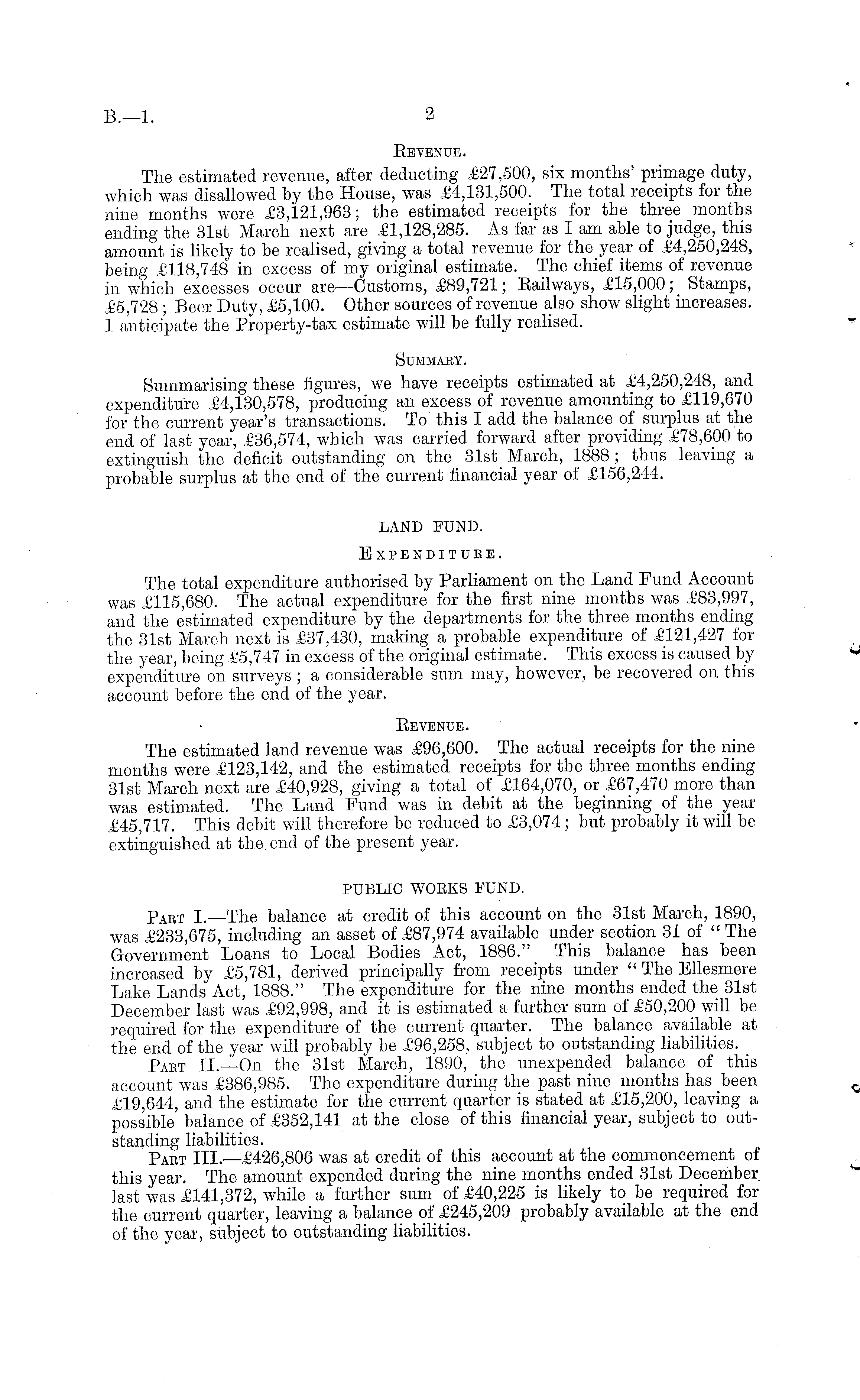 Bevenue. The estimated revenue, after deducting £27,500, six months' primage duty, which was disallowed by the House, was £4,131,500. The total receipts for the nine months were £3,121,963; the estimated receipts for the three months ending the 31st March next are £1,128,285. As far as lam able to judge, this amount is likely to be realised, giving a total revenue for the year of £4,250,248, being £118,748 in excess of my original estimate. The chief items of revenue in which excesses occur are—Customs, £89,721; Bailways, £15,000; Stamps, £5,728 ; Beer Duty, £5,100. Other sources of revenue also show slight increases. I anticipate the Property-tax estimate will be fully realised. Summary. Summarising these figures, we have receipts estimated at £4,250,248, and expenditure £4,130,578, producing an excess of revenue amounting to £119,670 for the current year's transactions. To this I add the balance of surplus at the end of last year, £36,574, which was carried forward after providing £78,600 to extinguish the deficit outstanding on the 31st March, 1888 ; thus leaving a probable surplus at the end of the current financial year of £156,244. LAND EDND. Expenditure. The total expenditure authorised by Parliament on the Land Fund Account was £115,680. The actual expenditure for the first nine months was £83,997, and the estimated expenditure by the departments for the three months ending the 31st March next is £37,430, making a probable expenditure of £121,427 for the year, being £5,747 in excess of the original estimate. This excess is caused by expenditure on surveys ; a considerable sum may, however, be recovered on this account before the end of the year. Bevenue. The estimated land revenue was £96,600. The actual receipts for the nine months were £123,142, and the estimated receipts for the three months ending 31st March next are £40,928, giving a total of £164,070, or £67,470 more than was estimated. The Land Fund was in debit at the beginning of the year £45,717. This debit will therefore be reduced to £3,074; but probably it will be extinguished at the end of the present year. PUBLIC WOEKS FUND. Part I.—The balance at credit of this account on the 31st March, 1890, was £233,675, including an asset of £87,974 available under section 31 of "The Government Loans to Local Bodies Act, 1886." This balance has been increased by £5,781, derived principally from receipts under " The Ellesmere Lake Lands Act, 1888." The expenditure for the nine months ended the 31st December last was £92,998, and it is estimated a further sum of £50,200 will be required for the expenditure of the current quarter. The balance available at the end of the year will probably be £96,258, subject to outstanding liabilities. Part ll.—On the 31st March, 1890, the unexpended balance of this account was £386,985. The expenditure during the past nine months has been £19,644, and the estimate for the current quarter is stated at £15,200, leaving a possible balance of £352,141 at the close of this financial year, subject to outstanding liabilities. Part 111.—£426,806 was at credit of this account at the commencement of this year. The amount expended during the nine months ended 31st December last was £141,372, while a further sum of £40,225 is likely to be required for the current quarter, leaving a balance of £245,209 probably available at the end of the year, subject to outstanding liabilities.