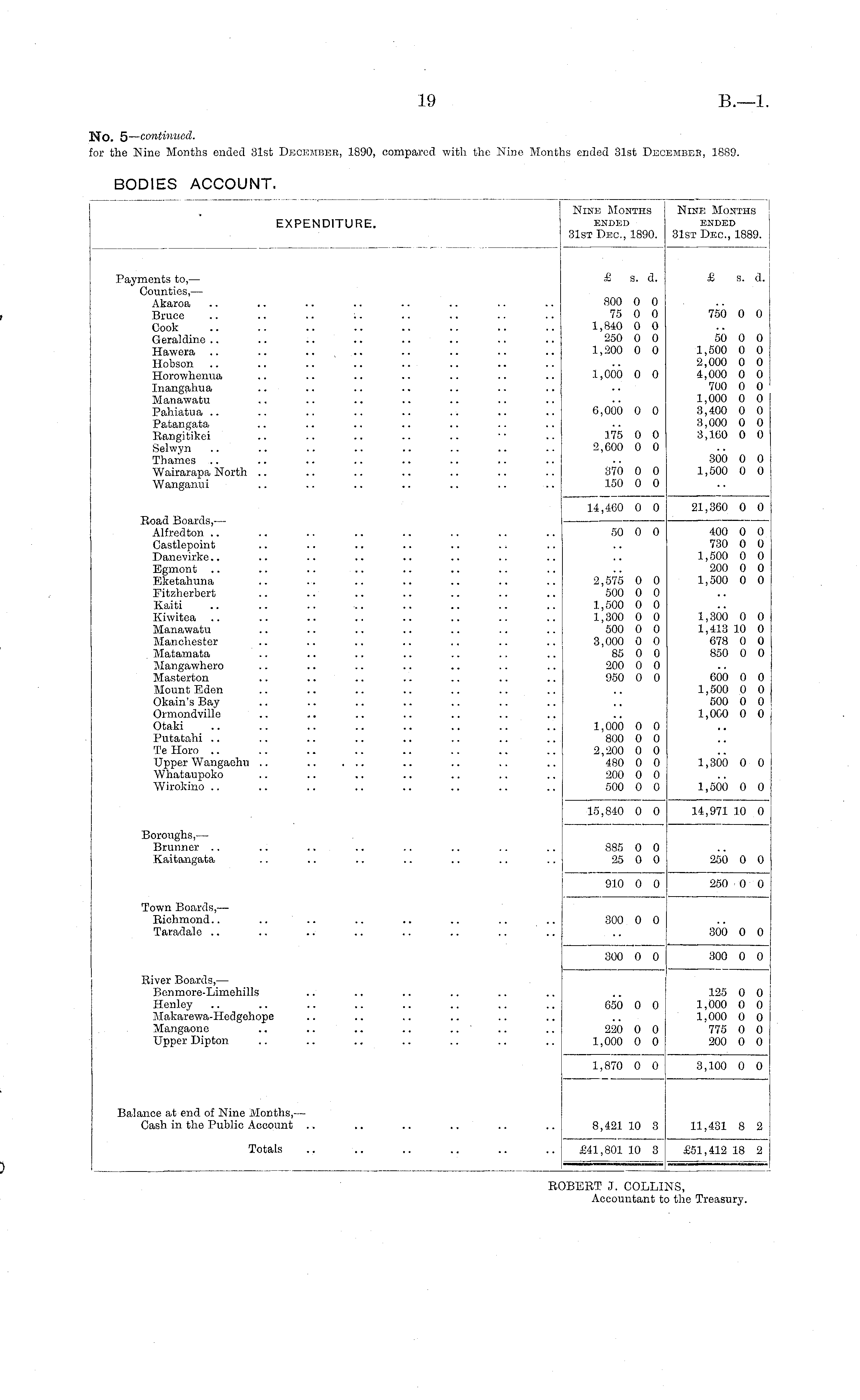EXPENDITURE. Nine Months ENDED 31st Dec, 1S90. Nine Months ENDED 31st Dec, 1889. Payments to, — Counties, — Akaroa Bruce Cook Geraldine Hawera Hobson Horowhenua Inangahua Manawatu Pahiatua .. Patangata Eangitikei Selwyn Thames Wairarapa North Wanganui & s. d. 800 0 0 75 0 0 1,840 0 0 250 0 0 1,200 0 0 1,000 0 0 £ s. d. 750 0 0 50 0 0 1,500 0 0 2,000 0 0 4,000 0 0 700 0 0 1,000 0 0 3,400 0 0 3,000 0 0 3,100 0 0 6,000 0 0 175 0 0 2,600 0 0 370 0 0 150 0 0 300 0 0 1,500 0 0 Road Boards, — Alfredton Castlepoint Danovirke.. Bgmont Eketahuna Fitzherbert Kaiti Kiwitea Manawatu Manchester Matamata Mangawhero Masterton Mount Eden Okain's Bay Ormondville Otaki Putatahi Te Horo Upper Wangaehu Whataupoko Wirokino 14,460 0 0 50 0 0 2,575 0 0 500 0 0 1,500 0 0 1,300 0 0 500 0 0 3,000 0 0 85 0 0 200 0 0 950 0 0 21,360 0 0 400 0 0 730 0 0 1,500 0 0 200 0 0 1,500 0 0 1,300 0 0 1,413 10 0 678 0 0 850 0 0 600 0 0 1,500 0 0 500 0 0 1,000 0 0 1,000 0 0 800 0 0 2,200 0 0 480 0 0 200 0 0 500 0 0 1,300 0 0 1,500 0 0 15,840 0 0 14,971 10 0 Boroughs,— Brunner Kaitangata 885 0 0 25 0 0 250 0 0 Town Boards, — Richmond.. Tftradale 910 0 0 250 0 0 300 0 0 300 0 0 River Boards, — Benmore-Limehills Henley Makarewa-Hedgehope Mangaone Upper Dipton 300 0 0 300 0 0 050 0 0 220 0 0 1,000 0 0 125 0 0 1,000 0 0 1,000 0 0 775 0 0 200 0 0 1,870 0 0 3,100 0 0 Balance at end of Nine Months, — Cash in the Public Account 8,421 10 3 11,431 8 2 Totals £41,801 10 3 £51,412 18 2 IBERT J. COLLI: Accountant ti rs, the Treasury.