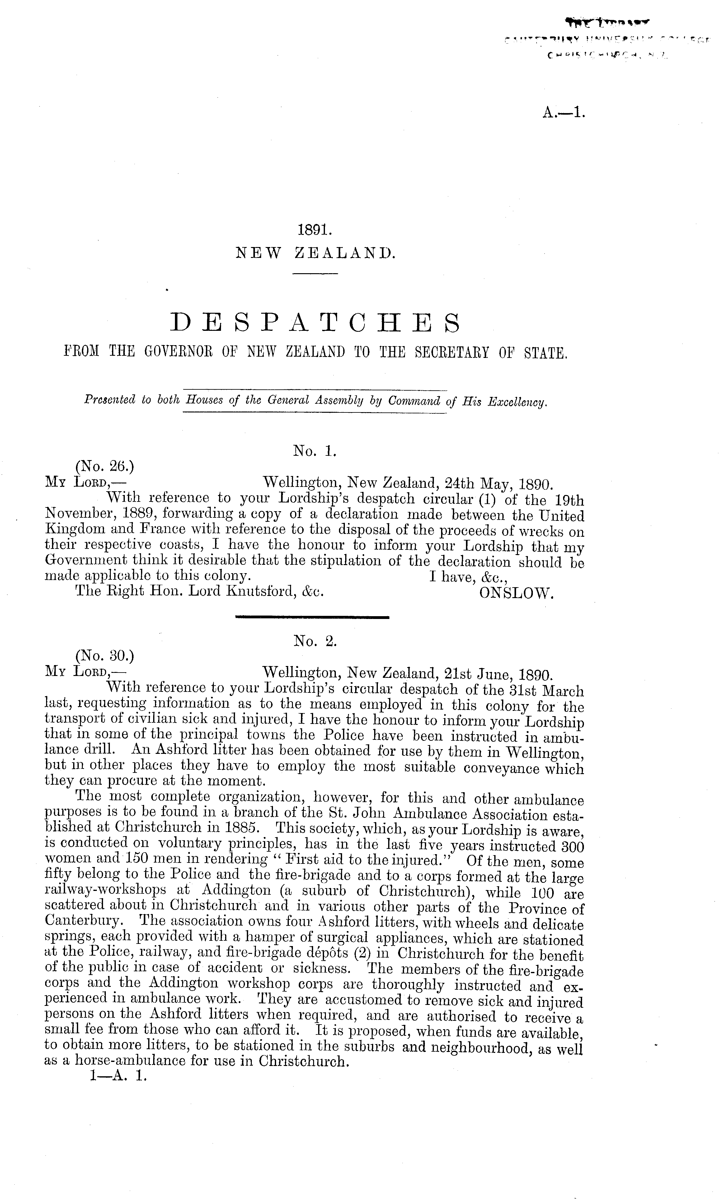 No. 2. (No. 30.) My Lord, — Wellington, New Zealand, 21st June, 1890. With reference to your Lordship's circular despatch of the 31st March last, requesting information as to the means employed in this colony for the transport of civilian sick and injured, I have the honour to inform your Lordship that in some of the principal towns the Police have been instructed in ambulance drill. An Ashford litter has been obtained for use by them in Wellington, but in other places they have to employ the most suitable conveyance which they can procure at the moment. The most complete organization, however, for this and other ambulance purposes is to be found in a branch of the St. John Ambulance Association established at Christchurch in 1885. This society, which, as your Lordship is aware, is conducted on voluntary principles, has in the last five years instructed 300 women and 150 men in rendering " First aid to the injured." Of the men, some fifty belong to the Police and the fire-brigade and to a corps formed at the large railway-workshops at Addington (a suburb of Christchurch), while 100 are scattered about in Christchurch and in various other parts of the Province of Canterbury. The association owns four Ashford litters, with wheels and delicate springs, each provided with a hamper of surgical appliances, which are stationed at the Police, railway, and fire-brigade depots (2) in Christchurch for the benefit of the public in case of accident or sickness. The members of the fire-brigade corps and the Addington workshop corps are thoroughly instructed and experienced in ambulance work. They are accustomed to remove sick and injured persons on the Ashford litters when required, and are authorised to receive a small fee from those who can afford it. It is proposed, when funds are available, to obtain more litters, to be stationed in the suburbs and neighbourhood, as well as a horse-ambulance for use in Christchurch.