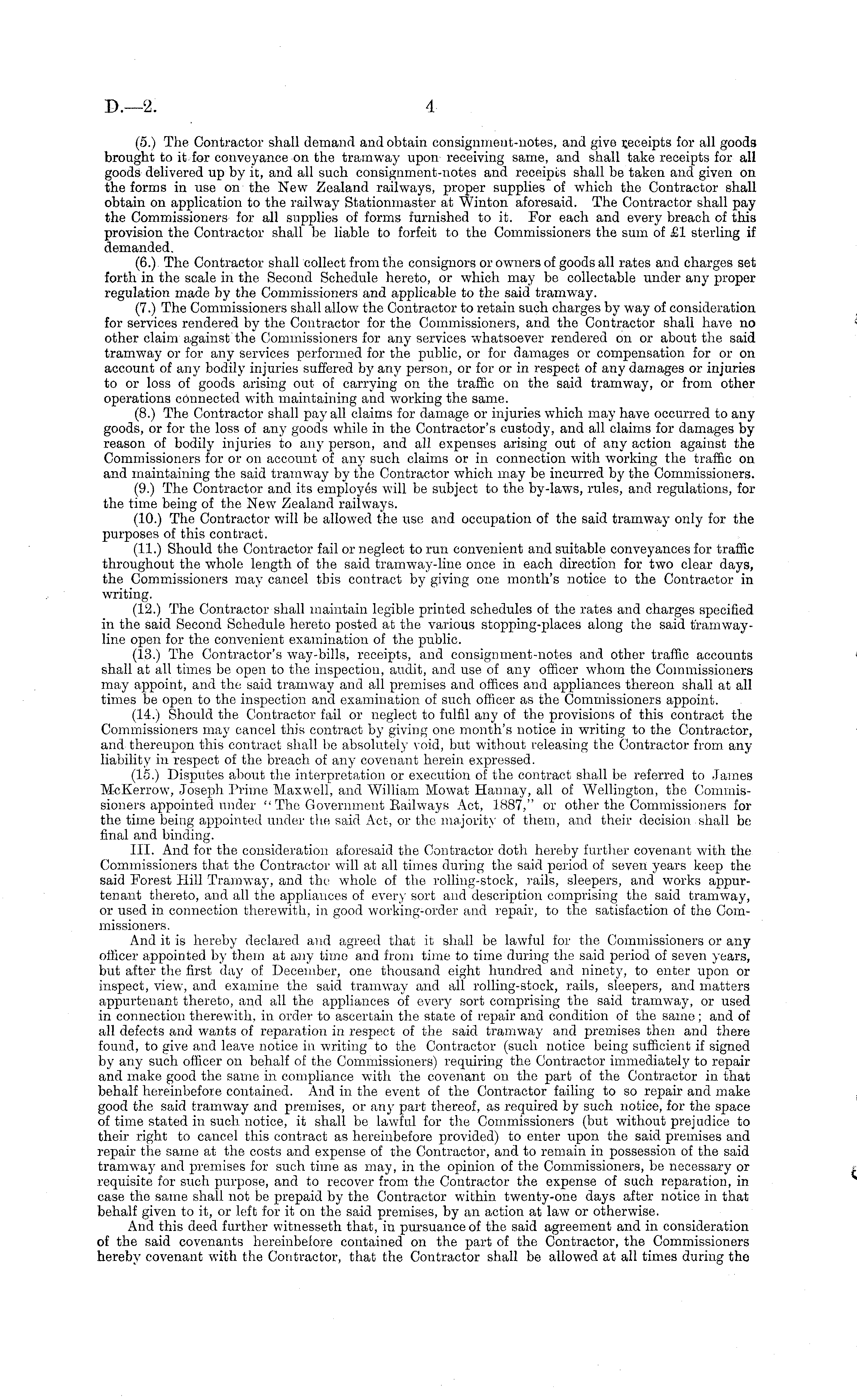 (5.) The Contractor shall demand and obtain consignment-notes, and give receipts for all goods brought to it for conveyance on the tramway upon receiving same, and shall take receipts for all goods delivered up by it, and all such consignment-notes and receipts shall be taken and given on the forms in use on the New Zealand railways, proper supplies of which the Contractor shall obtain on application to the railway Stationmaster at Winton aforesaid. The Contractor shall pay the Commissioners for all supplies of forms furnished to it. For each and every breach of this provision the Contractor shall lie liable to forfeit to the Commissioners the sum of £1 sterling if demanded. (6.) The Contractor shall collect from the consignors or owners of goods all rates and charges set forth in the scale in the Second Schedule hereto, or which may be collectable under any proper regulation made by the Commissioners and applicable to the said tramway. (7.) The Commissioners shall allow T the Contractor to retain such charges by way of consideration for services rendered by the Contractor for the Commissioners, and the Contractor shall have no other claim against the Commissioners for any services whatsoever rendered on or about the said tramway or for any services performed for the public, or for damages or compensation for or on account of any bodily injuries suffered by any person, or for or in respect of any damages or injuries to or loss of goods arising out of carrying on the traffic on the said tramway, or from other operations connected with maintaining and working the same. (8.) The Contractor shall pay all claims for damage or injuries which may have occurred to any goods, or for the loss of any goods while in the Contractor's custody, and all claims for damages by reason of bodily injuries to any person, and all expenses arising out of any action against the Commissioners for or on account of any such claims or in connection with working the traffic on and maintaining the said tramway by the Contractor which may be incurred by the Commissioners. (9.) The Contractor and its employes will be subject to the by-laws, rules, and regulations, for the time being of the New Zealand railways. (10.) The Contractor will be allowed the use and occupation of the said tramway only for the purposes of this contract. (11.) Should the Contractor fail or neglect to run convenient and suitable conveyances for traffic throughout the whole length of the said tramway-line once in each direction for two clear days, the Commissioners may cancel this contract by giving one month's notice to the Contractor in writing. (12.) The Contractor shall maintain legible printed schedules of the rates and charges specified in the said Second Schedule hereto posted at the various stopping-places along the said tramwayline open for the convenient examination of the public. (13.) The Contractor's way-bills, receipts, and consignment-notes and other traffic accounts shall at all times be open to the inspection, audit, and use of any officer whom the Commissioners may appoint, and the said tramway and all premises and offices and appliances thereon shall at all times be open to the inspection and examination of such officer as the Commissioners appoint. (14.) Should the Contractor fail or neglect to fulfil any of the provisions of this contract the Commissioners may cancel this contract by giving one month's notice in writing to the Contractor, and thereupon this contract shall be absolutely void, but without releasing the Contractor from any liability in respect of the breach of any covenant herein expressed. (15.) Disputes about the interpretation or execution of the contract shall be referred to James M-cKerrow, Joseph. Prime Maxwell, and William Mowat Hannay, all of Wellington, the Commissioners appointed under " The Government Eailways Act, 1887," or other the Commissioners for the time being appointed under the said Act, or the majority of them, and their decision shall be final and binding. 111. And for the consideration aforesaid the Contractor doth hereby further covenant with the Commissioners that the Contractor will at all times during the said period of seven years keep the said Forest Hill Tramway, and the whole of the rolling-stock, rails, sleepers, and works appurtenant thereto, and all the appliances of ever)' sort and description comprising the said tramway, or used in connection therewith, in good working-order and repair, to the satisfaction of the Commissioners. And it is hereby declared and agreed that it shall be lawful for the Commissioners or any officer appointed by them at any time and from time to time during the said period of seven years, but after the first day of December, one thousand eight hundred and ninety, to enter upon or inspect, view, and examine the said tramway and all rolling-stock, rails, sleepers, and matters appurtenant thereto, and all the appliances of every sort comprising the said tramway, or used in connection therewith, in order to ascertain the state of repair and condition of the same; and of all defects and wants of reparation in respect of the said tramway and premises then and there found, to give and leave notice in writing to the Contractor (such notice being sufficient if signed by any such officer on behalf of the Commissioners) requiring the Contractor immediately to repair and make good the same in compliance with the covenant on the part of the Contractor in that behalf hereinbefore contained. And in the event of the Contractor failing to so repair and make good the said tramway and premises, or any part thereof, as required by such notice, for the space of time stated in such notice, it shall be lawful for the Commissioners (but without prejudice to their right to cancel this contract as hereinbefore provided) to enter upon the said premises and repair the same at the costs and expense of the Contractor, and to remain in possession of the said tramway and premises for