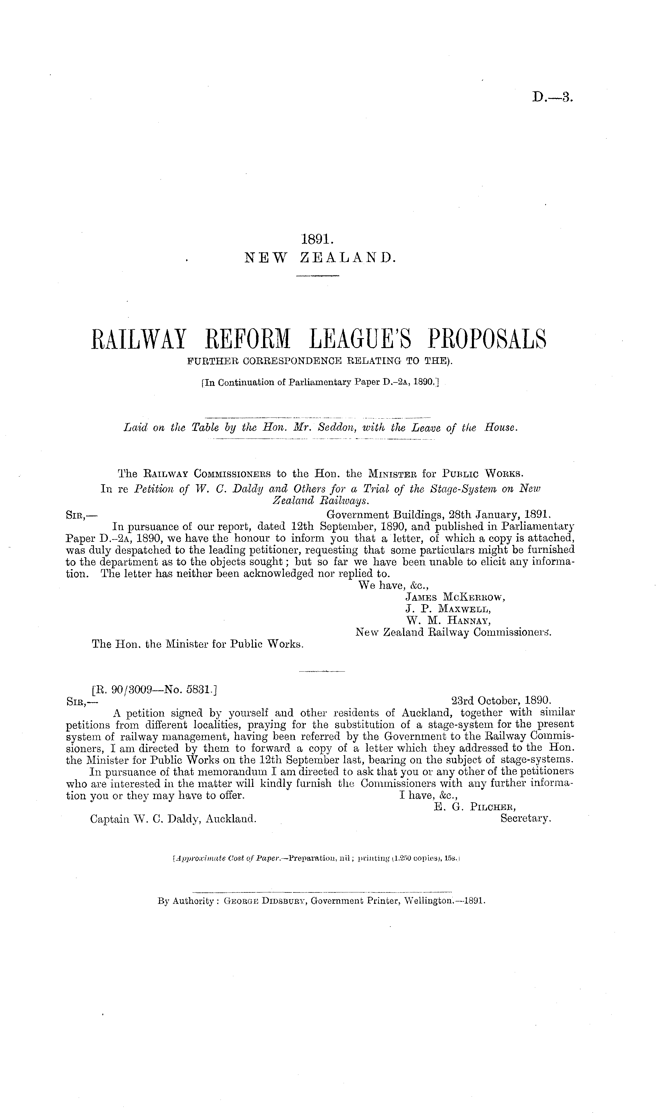 The Railway Commissioners to the Hon. the Minister for Public Works. In re Petition of W. C. Daldy and Others for a Trial of the Stage-System on New Zealand Railways. Sir, — Government Buildings, 28th January, 1891. In pursuance of our report, dated 12th September, 1890, and published in Parliamentary Paper D.-2a, 1890, we have the honour to inform you that a letter, of which a copy is attached, was duly despatched to the leading petitioner, requesting that some particulars might be furnished to the department as to the objects sought; but so far we have been unable to elicit any information. The letter has neither been acknowledged nor replied to. We have, &c, James McKerrow, J. P. Maxwell, W. M. Hannay, New Zealand Railway Commissioners. The Hon. the Minister for Public Works.