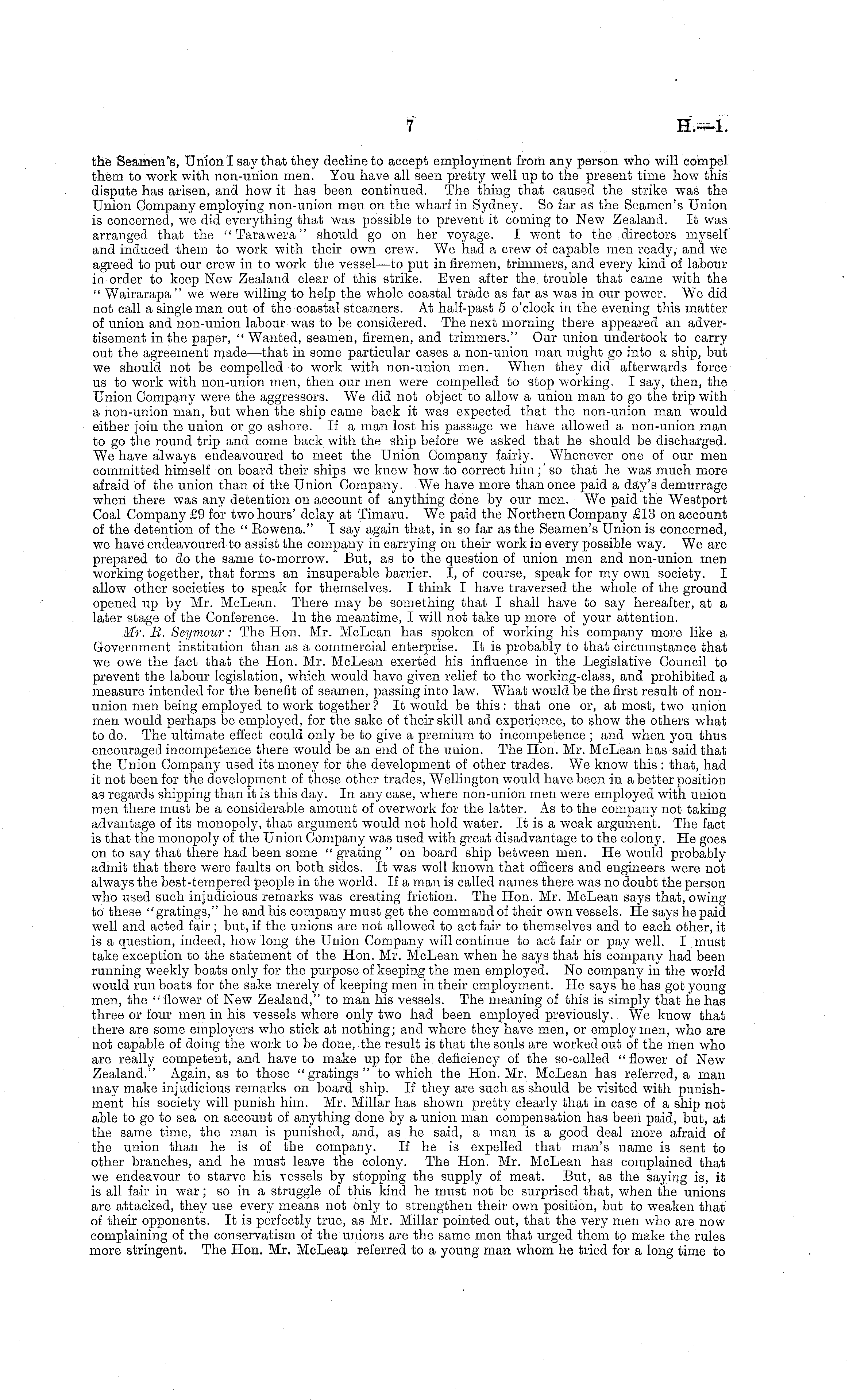 the Seamen's, Union I say that they decline to accept employment from any person who will compel them to work with non-union men. You have all seen pretty well up to the present time how this dispute has arisen, and how it has been continued. The thing that caused the strike was the Union Company employing non-union men on the wharf in Sydney. So far as the Seamen's Union is concerned, we did everything that was possible to prevent it coming to New Zealand. It was arranged that the " Tarawera" should go on her voyage. I went to the directors myself and induced them to work with their own crew. We had a crew of capable men ready, and we agreed to put our crew in to work the vessel—to put in firemen, trimmers, and every kind of labour in order to keep New Zealand clear of this strike. Even after the trouble that came with the " Wairarapa "we were willing to help the whole coastal trade as far as was in our power. We did not call a single man out of the coastal steamers. At half-past 5 o'clock in the evening this matter of union and non-union labour was to be considered. The next morning there appeared an advertisement in the paper, " Wanted, seamen, firemen, and trimmers." Our union undertook to carry out the agreement made—that in some particular cases a non-union man might go into a ship, but we should not be compelled to work with non-union men. When they did afterwards force us to work with non-union men, then our men were compelled to stop working. I say, then, the Union Company were the aggressors. We did not object to allow a union man to go the trip with a non-union man, but when the ship came back it was expected that the non-union man would either join the union or go ashore. If a man lost his passage we have allowed a non-union man to go the round trip and come back with the ship before we asked that he should be discharged. We have always endeavoured to meet the Union Company fairly. Whenever one of our men committed himself on board their ships wo knew how to correct him;' so that he was much more afraid of the union than of the Union Company. We have more than once paid a day's demurrage when there was any detention on account of anything done by our men. We paid the Westport Coal Company £9 for two hours' delay at Timaru. We paid the Northern Company £13 on account of the detention of the " Eowena." I say again that, in so far as the Seamen's Union is concerned, we have endeavoured to assist the company in carrying on their work in every possible way. We are prepared to do the same to-morrow. But, as to the question of union men and non-union men working together, that forms an insuperable barrier. I, of course, speak for my own society. I allow other societies to speak for themselves. I think I have traversed the whole of the ground opened up by Mr. McLean. There may be something that I shall have to say hereafter, at a later stage of the Conference. In the meantime, I will not take up more of your attention. Mr. li. Seymour: The Hon. Mr. McLean has spoken of working his company more like a Government institution than as a commercial enterprise. It is probably to that circumstance that we owe the fact that the Hon. Mr. McLean exerted his influence in the Legislative Council to prevent the labour legislation, which would have given relief to the working-class, and prohibited a measure intended for the benefit of seamen, passing into law. What would be the first result of nonunion men being employed to work together ? It would be this : that one or, at most, two union men would perhaps be employed, for the sake of their skill and experience, to show the others what to do. The ultimate effect could only be to give a premium to incompetence ; and when you thus encouraged incompetence there would be an end of the union. The Hon. Mr. McLean has said that the Union Company used its money for the development of other trades. We know this : that, had it not been for the development of these other trades, Wellington would have been in a better position as regards shipping than it is this day. In any case, where non-union men were employed with union men there must be a considerable amount of overwork for the latter. As to the company not taking advantage of its monopoly, that argument would not hold water. It is a weak argument. The fact is that the monopoly of the Union Company was used with great disadvantage to the colony. He goes on to say that there had been some " grating " on board ship between men. He would probably admit that there were faults on both sides. It was well known that officers and engineers were not always the best-tempered people in the world. If a man is called names there was no doubt the person who used such injudicious remarks was creating friction. The Hon. Mr. McLean says that, owing to these "gratings," he and his company must get the command of their own vessels. He says he paid well and acted fair ; but, if the unions are not allowed to act fair to themselves and to each other, it is a question, indeed, how long the Union Company will continue to act fair or pay well. I must take exception to the statement of the Hon. Mr. McLean when he says that his company had been running weekly boats only for the purpose of keeping the men employed. No company in the world would run boats for the sake merely of keeping men in their employment. He says he has got young men, the "flower of New Zealand," to man his vessels. The meaning of this is simply that he has three or four men in his vessels where only two had been employed previously. We know that there are some employers who stick at nothing; and where they have men, or employ men, who are not capable of doing the work to be done, the result is that the souls are worked out of the men who are really competent, and have to make up for the deficiency of the so-called "flower of New Zealand." Again, as to those "gratings" to which the Hon. Mr. McLean has referred, a man may make injudicious remarks on board