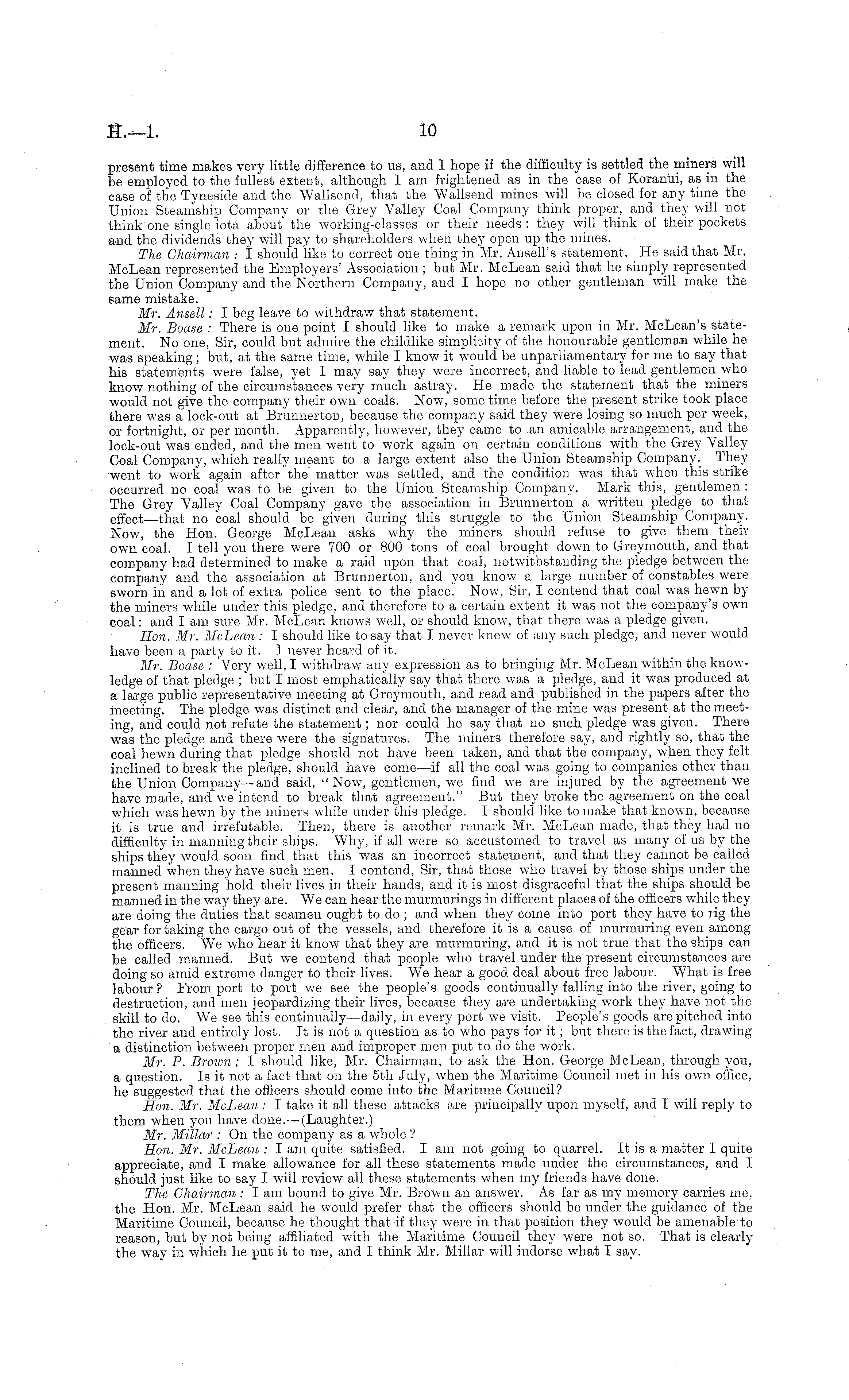 present time makes very little difference to us, and I hope if the difficulty is settled the miners will be employed to the fullest extent, although I am frightened as in the case of Koranui, as in the case of the Tynesicle and the Wallsend, that the Wallsend mines will be closed for any time the Union Steamship Company or the Grey Valley Coal Company think proper, and they will not think one single iota about" the working-classes or their needs : they will think of their pockets and the dividends they will pay to shareholders when they open up the mines. The Chairman .- 1 should like to correct one thing in Mr. Ansell's statement. He said that Mr. McLean represented the Employers' Association ; but Mr. McLean said that he simply represented the Union Company and the Northern Company, and I hope no other gentleman will make the same mistake. Mr. Ansell: I beg leave to withdraw that statement. Mr. Boase : There is one point I should like to make a remark upon in Mr. McLean's statement. No one, Sir, could but admire the childlike simplicity of the honourable gentleman while he was speaking; but, at the same time, while I know it would be unparliamentary for me to say that his statements were false, yet I may say they were incorrect, and liable to lead gentlemen who know nothing of the circumstances very much astray. He made the statement that the miners would not give the company their own coals. Now, some time before the present strike took place there was a lock-out at Brunnerton, because the company said they were losing so much per week, or fortnight, or per month. Apparently, however, they came to an amicable arrangement, and the lock-out was ended, and the men went to work again on certain conditions with the Grey Valley Coal Company, which really meant to a large extent also the Union Steamship Company._ They went to work again after the matter was settled, and the condition was that when this strike occurred no coal was to be given to the Union Steamship Company. Mark this, gentlemen : The Grey Valley Coal Company gave the association in Brunnerton a written pledge to that effect —that no coal should be given during this struggle to the Union Steamship Company. Now, the Hon. George McLean asks why the miners should refuse to give them their own coal. I tell you there were 700 or 800 "tons of coal brought down to Greymouth, and that company had determined to make a raid upon that coal, notwithstanding the pledge between the company and the association at Brunnerton, and you know a large number of constables were sworn in and a lot of extra police sent to the place. Now, Sir, I contend that coal was hewn by the miners while under this pledge, and therefore to a certain extent it was not the company's own coal: and lam sure Mr. McLean knows well, or should know, that there was a pledge given. Hon. Mr. McLean : I should like to say that I never knew of any such pledge, and never would have been a party to it. I never heard of it. Mr. Boase : 'Very well, I withdraw any expression as to bringing Mr. McLean within the knowledge of that pledge ; but I most emphatically say that there was a pledge, and it was produced at a large public representative meeting at Greymouth, and read and published in the papers after the meeting. The pledge was distinct and clear, and the manager of the mine was present at the meeting, and could not refute the statement; nor could he say that no such pledge was given. There was the pledge and there were the signatures. The miners therefore say, and rightly so, that the coal hewn during that pledge should not have been taken, and that the company, when they felt inclined to break the pledge, should have come —if all the coal was going to companies other than the Union Company—and said, "Now, gentlemen, we find we are injured by the agreement we have made, and we intend to break that agreement." But they broke the agreement on the coal which was hewn by the miners while under this pledge. I should like to make that knowri, because it is true and irrefutable. Then, there is another remark Mr. McLean made, that they had no difficulty in manning their ships. Why, if all were so accustomed to travel as many of us by the ships they would soon find that this, was an incorrect statement, and that they cannot be called manned when they have such men. I contend, Sir, that those who travel by those ships under the present manning hold their lives in their hands, and it is most disgraceful that the ships should bo manned in the way they are. We can hear the murmurings in different places of the officers while they are doing the duties that seamen ought to do ; and when they come into port they have to rig the gear for taking the cargo out of the vessels, and therefore it is a cause of murmuring even among the officers. We who hear it know that they are murmuring, and it is not true that the ships can be called manned. But we contend that people who travel under the present circumstances are doing so amid extreme danger to their lives. We hear a good deal about free labour. What is free labour? From port to port we see the people's goods continually falling into the river, going to destruction, and men jeopardizing their lives, because they are undertaking work they have not the skill to do. We see this continually —daily, in every port we visit. People's goods are pitched into the river and entirely lost. It is not a question as to who pays for it ; but there is the fact, drawing a distinction between proper men and improper men put to do the work. Mr. P. Broicn ; I should like, Mr. Chairman, to ask the Hon. George McLean, through you-, a question. Is it not a fact that on the sth July, when the Maritime Council met in his own office, he suggested that the officers should come into the Maritime Council? Hon. Mr. McLean : I take it all these attacks are principally upon myself, and I will reply to them when you have done.--(Laughter.) Mr. Millar : On the company as 