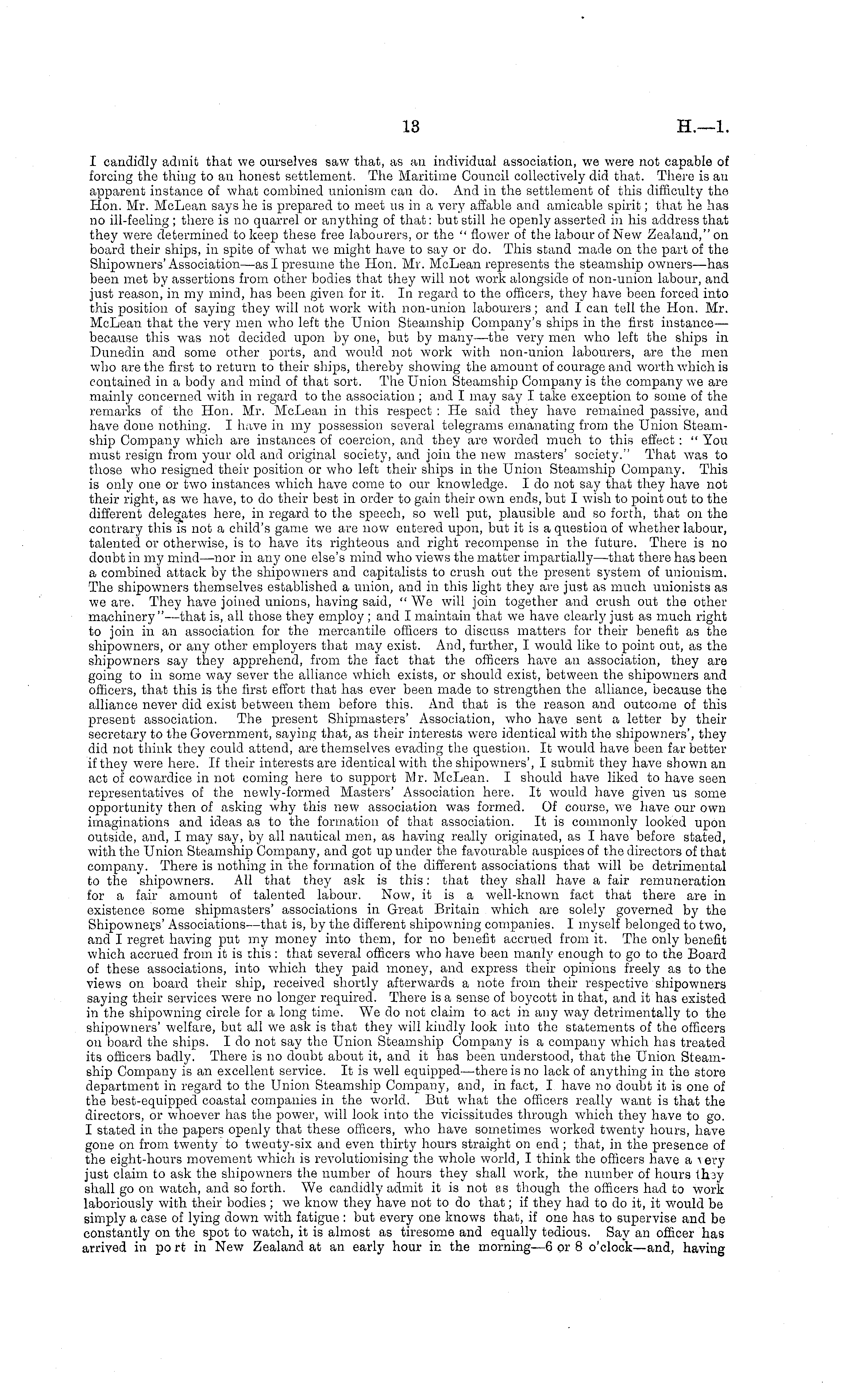 I candidly admit that we ourselves saw that, as an individual association, we were not capable of forcing the thing to an honest settlement. The Maritime Council collectively did that. There is an apparent instance of what combined unionism can do. And in the settlement of this difficulty the Hon. Mr. McLean says he is prepared to meet us in a very affable and amicable spirit; that he has no ill-feeling ; there is no quarrel or anything of that: but still he openly asserted in his address that they were determined to keep these free labourers, or the " flower of the labour of New Zealand," on board their ships, in spite of what we might have to say or do. This stand made on the part of the Shipowners' Association—as I presume the Hon. Mr. McLean represents the steamship owners—has been met by assertions from other bodies that they will not work alongside of non-union labour, and just reason, in my mind, has been given for it. In regard to the officers, they have been forced into this position of saying they will not work with non-union labourers; and I can tell the Hon. Mr. McLean that the very men who left the Union Steamship Company's ships in the first instance — because this was not decided upon by one, but by many—the very men who left the ships in Dunedin and some other ports, and would not work with non-union labourers, are the men who are the first to return to their ships, thereby showing the amount of courage and worth which is contained in a body and mind of that sort. The Union Steamship Company is the company we are mainly concerned with in regard to the association ; and I may say I take exception to some of the remarks of the Hon. Mr. McLean in this respect : He said they have remained passive, and have done nothing. I have in my possession several telegrams emanating from the Union Steamship Company which are instances of coercion, and they are worded much to this effect : " You must resign from your old and original society, and join the now masters' society." That was to those who resigned their position or who left their ships in the Union Steamship Company. This is only one or two instances which have come to our knowledge. Ido not say that they have not their right, as we have, to do their best in order to gain their own ends, but I wish to point out to the different delegates here, in regard to the speech, so well put, plausible and so forth, that on the contrary this is not a child's game we are now entered upon, but it is a question of whether labour, talented or otherwise, is to have its righteous and right recompense in the future. There is no doubt in my mind—nor in any one else's mind who views the matter impartially—that there has been a combined attack by the shipowners and capitalists to crush out the present system of unionism. The shipowners themselves established a union, and in this light they are just as much unionists as we are. They have joined unions, having said, "We will join together and crush out the other machinery"—that is, all those they employ ; and I maintain that we have clearly just as much right to join in an association for the mercantile officers to discuss matters for their benefit as the shipowners, or any other employers that may exist. And, further, I would like to point out, as the shipowners say they apprehend, from the fact that the officers have an association, they are going to in some way sever the alliance which exists, or should exist, between the shipowners and officers, that this is the first effort that has ever been made to strengthen the alliance, because the alliance never did exist between them before this. And that is the reason and outcome of this present association. The present Shipmasters' Association, who have sent a letter by their secretary to the Government, saying that, as their interests were identical with the shipowners', they did not think they could attend, are themselves evading the question. It would have been far better if they were here. If their interests are identical with the shipowners', I submit they have shown an act of cowardice in not coining here to support Mr. McLean. I should have liked to have seen representatives of the newly-formed Masters' Association here. It would have given us some opportunity then of asking why this new association was formed. Of course, we have our own imaginations and ideas as to the formation of that association. It is commonly looked upon outside, and, I may say, by all nautical men, as having really originated, as I have before stated, with the Union Steamship Company, and got up under the favourable auspices of the directors of that company. There is nothing in the formation of the different associations that will be detrimental to the shipowners. All that they ask is this: that they shall have a fair remuneration for a fair amount of talented labour. Now, it is a well-known fact that there are in existence some shipmasters' associations in Great Britain which are solely governed by the Shipowners' Associations —that is, by the different shipowning companies. I myself belonged to two, and I regret having put my money into them, for no benefit accrued from it. The only benefit which accrued from it is this: that several officers who have been manly enough to go to the Board of these associations, into which they paid money, and express their opinions freely as to the views on board their ship, received shortly afterwards a note from their respective shipowners saying their services were no longer required. There is a sense of boycott in that, and it has existed in the shipowning circle for a long time. We do not claim to act in any way detrimentally to the shipowners' welfare, but all we ask is that they will kindly look into the statements of the officers on board the ships. Ido not say the Union Steamship Company is a company which has treated its officers badly. There is no doubt about it, and it has been understood, that the Union Steamsh