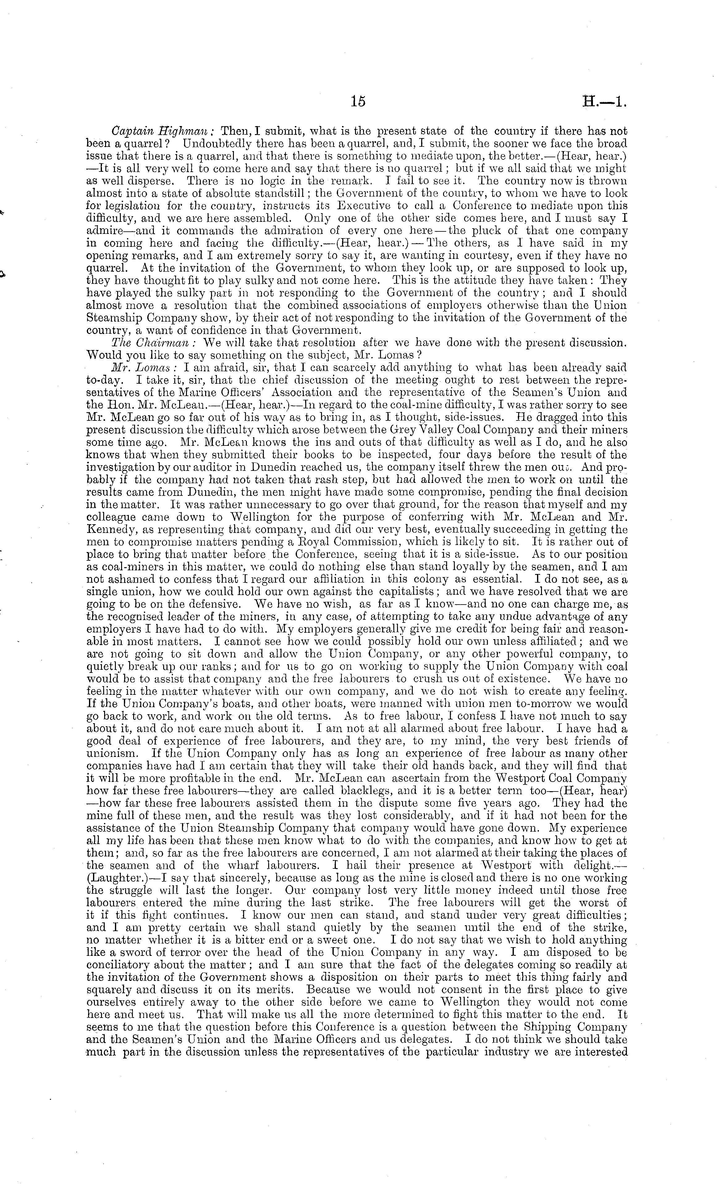 uapiain jtiignman , ineu, x suomn;, wnaii is tne preseni soaie 01 me country 11 mere nas not been a quarrel? Undoubtedly there has been a quarrel, and, I submit, the sooner we face the broad issue that there is a quarrel, and that there is something to mediate upon, the better.—(Hear, hear.) —It is all very well to come here and say that there is no quarrel; but if we all said that we might as well disperse. There is no logic in the remark, I fail to see it. The country now is thrown almost into a state of absolute standstill; the Government of the country, to whom we have to look for legislation for the country, instructs its Executive to call a Conference to mediate upon this difficulty, and we are here assembled. Only one of the other side comes here, and I must say I admire—and it commands the admiration of every one here — the pluck of that one company in coming here and facing the difficulty.—(Hear, hear.) — The others, as I have said in my opening remarks, and I am extremely sorry to say it, are wanting in courtesy, even if they have no quarrel. At the invitation of the Government, to whom they look up, or are supposed to look up, they have thought fit to play sulky and not come here. This is the attitude t\\ey have taken : They have played the sulky part in not responding to the Government of the country ; and I should almost move a resolution that the combined associations of employers otherwise than the Union Steamship Company show, by their act of not responding to the invitation of the Government of the country, a want of confidence in that Government. The Chairman : We will take that resolution after we have done with the present discussion. Would you like to say something on the subject, Mr. Lornas ? Mr. Lomas : I am afraid, sir, that 1 can scarcely add anything to what has been already said to-day. I take it, sir, that the chief discussion of the meeting ought to rest between the representatives of the Marine Officers' Association and the representative of the Seamen's Union and the Hon. Mr. McLean. —(Hear, hear.) —In regard to the coal-rniue difficulty, I was rather sorry to see Mr. McLean go so far out of his way as to bring in, as I thought, side-issues. lie dragged into this present discussion the difficulty which arose between the Grey Valley Coal Company and their miners some time ago. Mr. McLean knows the ins and outs of that difficulty as well as I do, and he also knows that when they submitted their books to be inspected, four days before the result of the investigation by our auditor in Dunedin reached us, the company itself threw the men ouo. And probably if the company had not taken that rash step, but had allowed the men to work on until the results came from Dunedin, the men might have made some compromise, pending the final decision in the matter. It was rather unnecessary to go over that ground, for the reason that myself and my colleague came down to Wellington for the purpose of conferring with Mr. McLean and Mr. Kennedy, as representing that company, and did our very best, eventually succeeding in getting the men to compromise matters pending a Eoyal Commission, which is likely to sit. It is rather out of place to bring that matter before the Conference, seeing that it is a side-issue. As to our position as coal-miners in this matter, we could do nothing else than stand loyally by the seamen, and I am not ashamed to confess that I regard our affiliation in this colony as essential. I do not see, as a single union, how we could hold our own against the capitalists; and we have resolved that we are going to be on the defensive. We have no wish, as far as I know—and no one can charge me, as the recognised leader of the miners, ill any case, of attempting to take any undue advantage of any employers I have had to do with. My employers generally give me credit for being fair and reasonable in most matters. I cannot see how we could possibly hold our own unless affiliated; and we are not going to sit down and allow the Union Company, or any other powerful company, to quietly break up our ranks; and for us to go on working to supply the Union Company with coal would be to assist that company and the free labourers to crush us out of existence. W r e have no feeling in the matter whatever with our own company, and we do not wish to create any feeling. If the Union Company's boats, and other boats, were manned with union men to-morrow we would go back to work, and work on the old terms. As to free labour, I confess I have not much to say about it, and do not care much about it. I am not at all alarmed about free labour. I have had a good deal of experience of free labourers, and they are, to my mind, the very best friends of unionism. If the Union Company only has as long an experience of free labour as many other companies have had I am certain that they will take their old hands back, and they will find that it will be more profitable in the end. Mr. McLean can ascertain from the Westport Coal Company how far these free labourers—they are called blacklegs, and it is a better term too—(Hear, hear) —how far these free labourers assisted them in the dispute some five years ago. They had the mine full of these men, and the result was they lost considerably, and if it had not been for the assistance of the Union Steamship Company that company would have gone down. My experience all my life has been that these men know what to do with the companies, and know how to get at them; and, so far as the free labourers are concerned, I am not alarmed at their taking the places of the seamen and of the wharf labourers. I hail their presence at Westport with delight.— (Laughter.)—I say that sincerely, because as long as the mine is closed and there is no one working the struggle will last the longer. Our company lost very little money indeed until those free labourers entered the mine during the last strike. The free labourers will get the worst of 