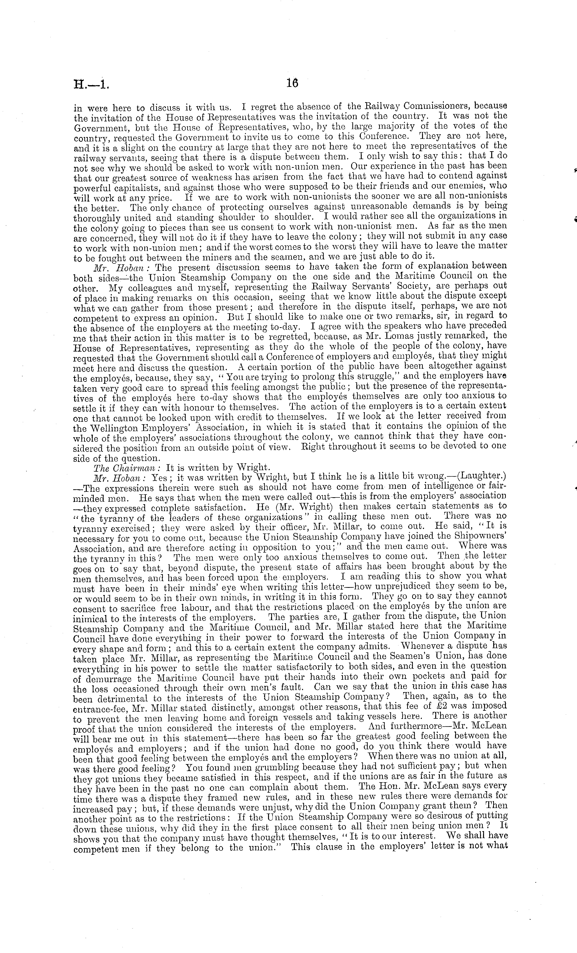 in were here to discuss it with us. I regret the absence of the Eaihvay Commissioners, because the invitation of the House of Eepresentatives was the invitation of the country. It was not the Government, but the House of Eepresentatives, who, by the large majority of the votes of the country, requested the Government to invite us to come to this Conference. They are not here, and it is a slight on the country at large that they are not here to meet the representatives of the railway servants, seeing that there is a dispute between them. I only wish to say this : that Ido not see why we should be asked to work with non-union men. Our experience in the past has been that our greatest source of weakness has arisen from the fact that we have had to contend against powerful capitalists, and against those who were supposed to be their friends and our enemies, who will work at any price. If we are to work with non-unionists the sooner we are all non-unionists the better. The only chance of protecting ourselves against unreasonable demands is by being thoroughly united and standing shoulder to shoulder. I would rather see all the organizations in the colony going to pieces than see us consent to work with non-unionist men. As far as the men are concerned, they will not do it if they have to leave the colony ; they will not submit in any case to work with non-union men; and if the worst comes to the worst they will have to leave the matter to be fought out between the miners and the seamen, and we are just able to do it. Mr. Hoban : The present discussion seems to have taken the form of explanation between both sides—the Union Steamship Company on the one side and the Maritime Council on the other. My colleagues and myself, representing the Eailway Servants' Society, are perhaps out of place in making remarks on this occasion, seeing that we know little about the dispute except what we can gather from those present ; and therefore in the dispute itself, perhaps, we are not competent to express an opinion. But I should like to make oue or two remarks, sir, in regard to the absence of the employers at the meeting to-day. I agree with the speakers who have preceded me that their action in this matter is to bo regretted, because, as Mr. Lomas justly remarked, the House of Eepresentatives, representing as they do the whole of the people of the colony, have requested that the Government should call a Conference of employers and employes, that they might meet here and discuss the question. A certain portion of the public have been altogether against the employes, because, they say, " You are trying to prolong this struggle," and the employers have taken very good care to spread this feeling amongst the public; but the presence of the representatives of the employes here to-day shows that the employes themselves are only too anxious to settle it if they can with honour to themselves. The action of the employers is to a certain extent one that cannot be looked upon with credit to themselves. If we look at the letter received from the Wellington Employers' Association, in which it is stated that it contains the opinion of the whole of the employers' associations throughout the colony, we cannot think that they have considered the position from an outside point of view. Eight throughout it seems to be devoted to one side of the question. The Chairman : It is written by Wright. Mr. Hoban : Yes ; it was written by Wright, but I think he is a little bit wrong.-—(Laughter.) The expressions therein were such as should not have come from men of intelligence or fairminded men. He says that when the men were called out—this is from the employers' association —they expressed complete satisfaction. He (Mr. Wright) then makes certain statements as to " the 'tyranny of the leaders of these organizations" in calling these men out. There was no tyranny exercised; they were asked by their officer, Mr. Millar, to come out. He said, "It is necessary for you to come out, because the Union Steamship Company have joined the Shipowners' Association, and are therefore acting in opposition to you;" and the men came out. Where was the tyranny in this ? The men were only too anxious themselves to come out. Then the letter goes on to'say that, beyond dispute, the present state of affairs has been brought about by the men themselves, and has been forced upon the employers. lam reading this to show you what must have been in their minds' eye when writing this letter—how unprejudiced they seem to be, or would seem to be in their own minds, in writing it in this form. They go on to say they cannot consent to sacrifice free labour, and that the restrictions placed on the employes by the union are inimical to the interests of the employers. The parties are, I gather from the dispute, the Union Steamship Company and the Maritime Council, and Mr. Millar stated here that the Maritime Council have done everything in their power to forward the interests of the Union Company in every shape and form; and this to a certain extent the company admits. Whenever a dispute has taken place Mr. Millar, as representing the Maritime Council and the Seamen's Union, has done everything in his power to settle the matter satisfactorily to both sides, and even in the question of demurrage the Maritime Council have put their hands into their own pockets and paid for the loss occasioned through their own men's fault. Can we say that the union in this case has been detrimental to the interests of the Union Steamship Company'? Then, again, as to the entrance-fee, Mr. Millar stated distinctly, amongst other reasons, that this fee of £2 was imposed to prevent the men leaving home and foreign vessels and taking vessels here. There is another proof that the union considered the interests of the employers. And furthermore—Mr. McLean will bear me out in this statement—there has been so far the greatest good feeling between the employes and employers; and 