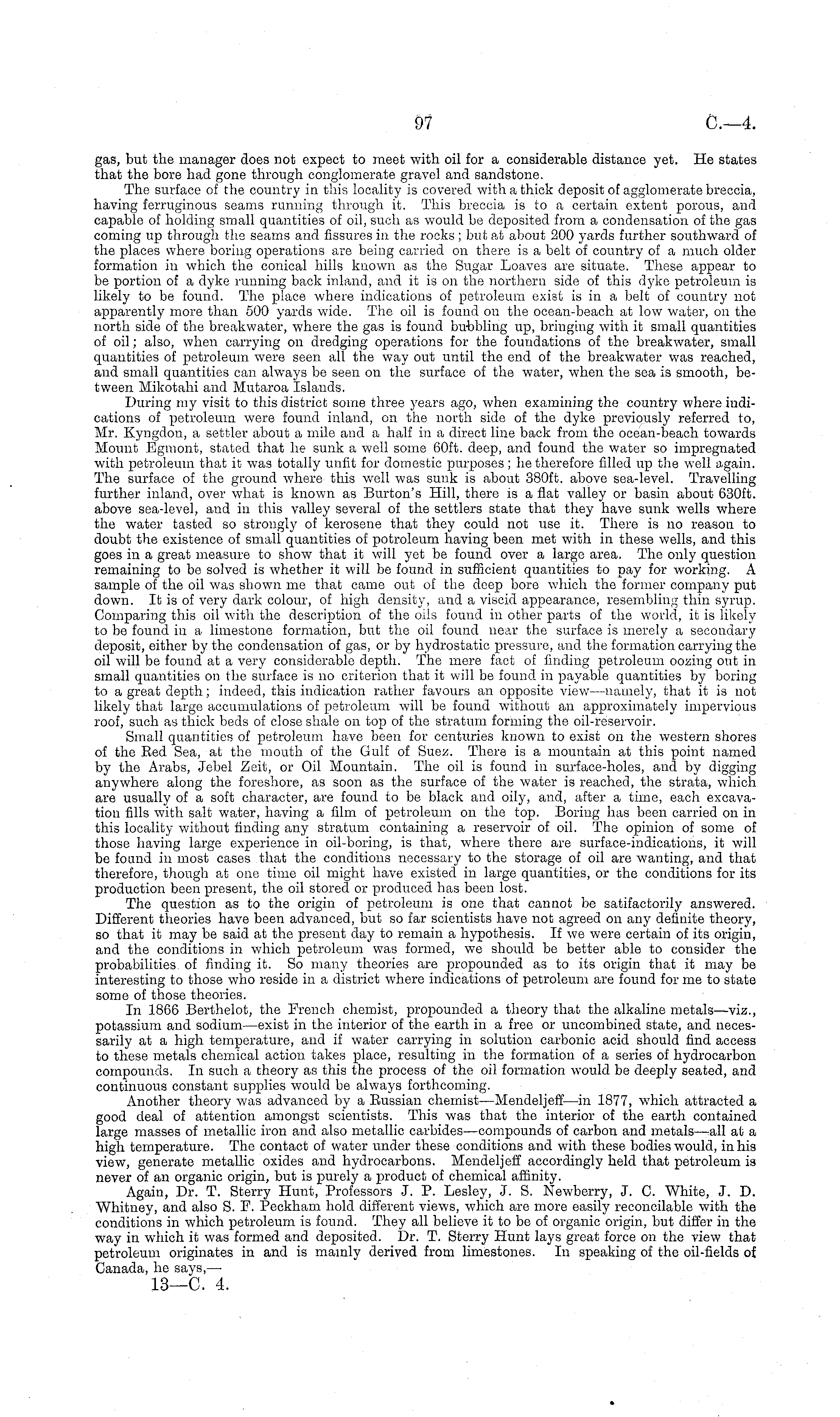 gas, but the manager does not expect to meet with oil for a considerable distance yet. He states that the bore had gone through conglomerate gravel and sandstone. The surface of the country in this locality is covered with a thick deposit of agglomerate breccia, having ferruginous seams running through it. This breccia is to a certain extent porous, and capable of holding small quantities of oil, such as would be deposited from a condensation of the gas coming up through the seams and fissures in the rocks ; but at about 200 yards further southward of the places where boring operations are being carried on there is a belt of country of a much older formation in which the conical hills known as the Sugar Loaves are situate. These appear to be portion of a dyke running back inland, and it is on the northern side of this dyke petroleum is likely to be found. The place where indications of petroleum exist is in a belt of country not apparently more than 500 yards wide. The oil is found on the ocean-beach at low water, on the north side of the breakwater, where the gas is found bubbling up, bringing with it small quantities of oil; also, when carrying on dredging operations for the foundations of the breakwater, small quantities of petroleum were seen all the way out until the end of the breakwater was reached, and small quantities can always be seen on the surface of the water, when the sea is smooth, between Mikotahi and Mutaroa Islands. During my visit to this district some three years ago, when examining the country where indications of petroleum were found inland, on the north side of the dyke previously referred to, Mr. Kyngdon, a settler about a mile and a half in a direct line back from the ocean-beach towards Mount Egmont, stated that he sunk a well some 60ft. deep, and found the water so impregnated with petroleum that it was totally unfit for domestic purposes; he therefore filled up the well again. The surface of the ground where this well was sunk is about 380 ft. above sea-level. Travelling further inland, over what is known as Burton's Hill, there is a flat valley or basin about 630 ft. above sea-level, and in this valley several of the settlers state that they have sunk wells where the water tasted so strongly of kerosene that they could not use it. There is no reason to doubt the existence of small quantities of potroleum having been met with in these wells, and this goes in a great measure to show that it will yet be found over a large area. The only question remaining to be solved is whether it will be found in sufficient quantities to pay for working. A sample of the oil was shown me that came out of the deep bore which the former company put down. It is of very dark colour, of high density, and a viscid appearance, resembling thin syrup. Comparing this oil with the description of the oils found in other parts of the world, it is likely to be found in a limestone formation, but the oil found near the surface is merely a secondary deposit, either by the condensation of gas, or by hydrostatic pressure, and the formation carrying the oil will be found at a very considerable depth. The mere fact of finding petroleum oozing out in small quantities on the surface is no criterion that it will be found in payable quantities by boring to a great depth; indeed, this indication rather favours an opposite view—namely, that it is not likely that large accumulations of petroleum will be found without an approximately impervious roof, such as thick beds of close shale on top of the stratum forming the oil-reservoir. Small quantities of petroleum have been for centuries known to exist on the western shores of the Eed Sea, at the mouth of the Gulf of Suez. There is a mountain at this point named by the Arabs, Jebel Zeit, or Oil Mountain. The oil is found in surface-holes, and by digging anywhere along the foreshore, as soon as the surface of the water is reached, the strata, which are usually of a soft character, are found to be black and oily, and, after a time, each excavation fills with salt water, having a film of petroleum on the top. Boring has been carried on in this locality without finding any stratum containing a reservoir of oil. The opinion of some of those having large experience in oil-boring, is that, where there are surface-indications, it will be found in most cases that the conditions necessary to the storage of oil are wanting, and that therefore, though at one time oil might have existed in large quantities, or the conditions for its production been present, the oil stored or produced has been lost. The question as to the origin of petroleum is one that cannot be satifactorily answered. Different theories have been advanced, but so far scientists have not agreed on any definite theory, so that it may be said at the present day to remain a hypothesis. If we were certain of its origin, and the conditions in which petroleum was formed, we should be better able to consider the probabilities of finding it. So many theories are propounded as to its origin that it may be interesting to those who reside in a district where indications of petroleum are found for me to state some of those theories. In 1866 Berthelot, the French chemist, propounded a theory that the alkaline metals—viz., potassium and sodium—exist in the interior of the earth in a free or uncombined state, and necessarily at a high temperature, and if water carrying in solution carbonic acid should find access to these metals chemical action takes place, resulting in the formation of a series of hydrocarbon compounds. In such a theory as this the process of the oil formation would be deeply seated, and continuous constant supplies would be always forthcoming. Another theory was advanced by a Russian chemist—Mendeljeff—in 1877, which attracted a good deal of attention amongst scientists. This was that the interior of the earth contained large masses of metallic iron and also metallic carbides—compounds 