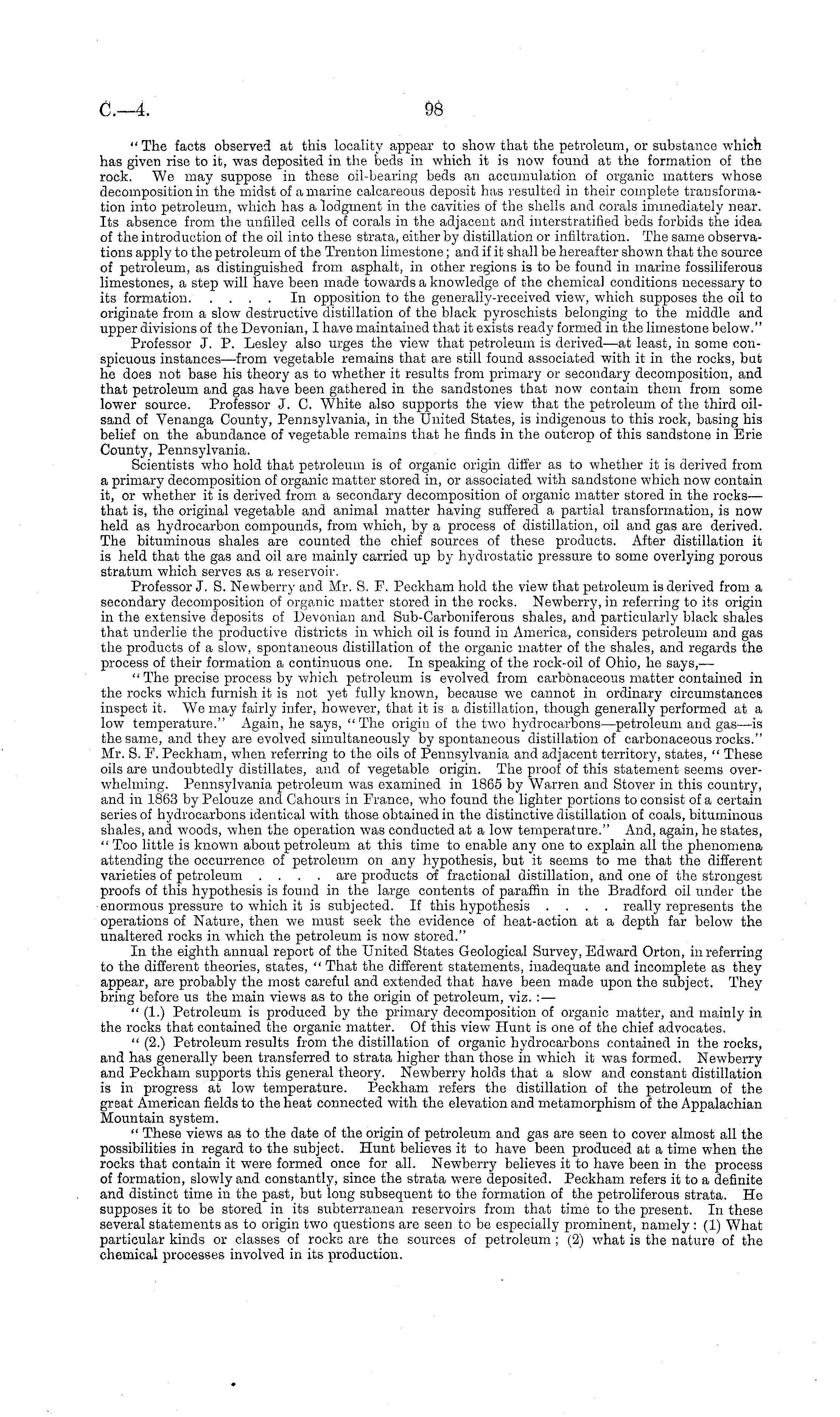 " The facts observed at this locality appear to show that the petroleum, or substance which has given rise to it, was deposited in the beds in which it is now found at the formation of the rock. We may suppose in these oil-bearing beds an accumulation of organic matters whose decomposition in the midst of a marine calcareous deposit has resulted in their complete transformation into petroleum, which has a lodgment in the cavities of the shells and corals immediately near. Its absence from the unfilled cells of corals in the adjacent and interstratified beds forbids the idea of the introduction of the oil into these strata, either by distillation or infiltration. The same observations apply to the petroleum of the Trenton limestone; and if it shall be hereafter shown that the source of petroleum, as distinguished from asphalt, in other regions is to be found in marine fossiliferous limestones, a step will have been made towards a knowledge of the chemical conditions necessary to its formation In opposition to the generally-received view r , which supposes the oil to originate from a slow destructive distillation of the black pyroschists belonging to the middle and upper divisions of the Devonian, I have maintained that it exists ready formed in the limestone below." Professor J. P. Lesley also urges the view that petroleum is derived —at least, in some conspicuous instances—from vegetable remains that are still found associated with it in the rocks, but he does not base his theory as to whether it results from primary or secondary decomposition, and that petroleum and gas have been gathered in the sandstones that now contain them from some lower source. Professor J. C. White also supports the view that the petroleum of the third oilsand of Venanga County, Pennsylvania, in the United States, is indigenous to this rock, basing his belief on the abundance of vegetable remains that he finds in the outcrop of this sandstone in Erie County, Pennsylvania. Scientists who hold that petroleum is of organic origin differ as to whether it is derived from a primary decomposition of organic matter stored in, or associated with sandstone which now contain it, or whether it is derived from a secondary decomposition of organic matter stored in the rocks— that is, the original vegetable and animal matter having suffered a partial transformation, is now held as hydrocarbon compounds, from which, by a process of distillation, oil and gas are derived. The bituminous shales are counted the chief sources of these products. After distillation it is held that the gas and oil are mainly carried up by hydrostatic pressure to some overlying porous stratum which serves as a reservoir. Professor J. S. Newberry and Mr. S. F. Peckham hold the view that petroleum is derived from a secondary decomposition of organic matter stored in the rocks. Newberry, in referring to its origin in the extensive deposits of Devonian and Sub-Carboniferous shales, and particularly black shales that underlie the productive districts in which oil is found in America, considers petroleum and gas the products of a slow, spontaneous distillation of the organic matter of the shales, and regards the process of their formation a continuous one. In speaking of the rock-oil of Ohio, he says,— " The precise process by which petroleum is evolved from carbonaceous matter contained in the rocks which furnish it is not yet fully known, because we cannot in ordinary circumstances inspect it. We may fairly infer, however, that it is a distillation, though generally performed at a low temperature." Again, he says, "The origin of the two hydrocarbons—petroleum and gas —is the same, and they are evolved simultaneously by spontaneous distillation of carbonaceous rocks." Mr. S. F. Peckham, when referring to the oils of Pennsylvania and adjacent territory, states, " These oils are undoubtedly distillates, and of vegetable origin. The proof of this statement seems overwhelming. Pennsylvania petroleum was examined in 1865 by Warren and Stover in this country, and in 1863 by Pelouze and Cahours in France, who found the lighter portions to consist of a certain series of hydrocarbons identical with those obtained in the distinctive distillation of coals, bituminous shales, and woods, when the operation was conducted at a low temperature." And, again, he states, " Too little is known about petroleum at this time to enable any one to explain all the phenomena attending the occurrence of petroleum on any hypothesis, but it seems to me that the different varieties of petroleum .... are products of fractional distillation, and one of the strongest proofs of this hypothesis is found in the large contents of paraffin in the Bradford oil under the enormous pressure to which it is subjected. If this hypothesis .... really represents the operations of Nature, then we must seek the evidence of heat-action at a depth far below the unaltered rocks in which the petroleum is now stored." In the eighth annual report of the United States Geological Survey, Edward Orton, in referring to the different theories, states, " That the different statements, inadequate and incomplete as they appear, are probably the most careful and extended that have been made upon the subject. They bring before us the main views as to the origin of petroleum, viz. : — " (1.) Petroleum is produced by the primary decomposition of organic matter, and mainly in the rocks that contained the organic matter. Of this view Hunt is one of the chief advocates. " (2.) Petroleum results from the distillation of organic hydrocarbons contained in the rocks, and has generally been transferred to strata higher than those in which it was formed. Newberry and Peckham supports this general theory. Newberry holds that a slow and constant distillation is in progress at low temperature. Peckham refers the distillation of the petroleum of the great American fields to the heat connected with the elevation and metamorp