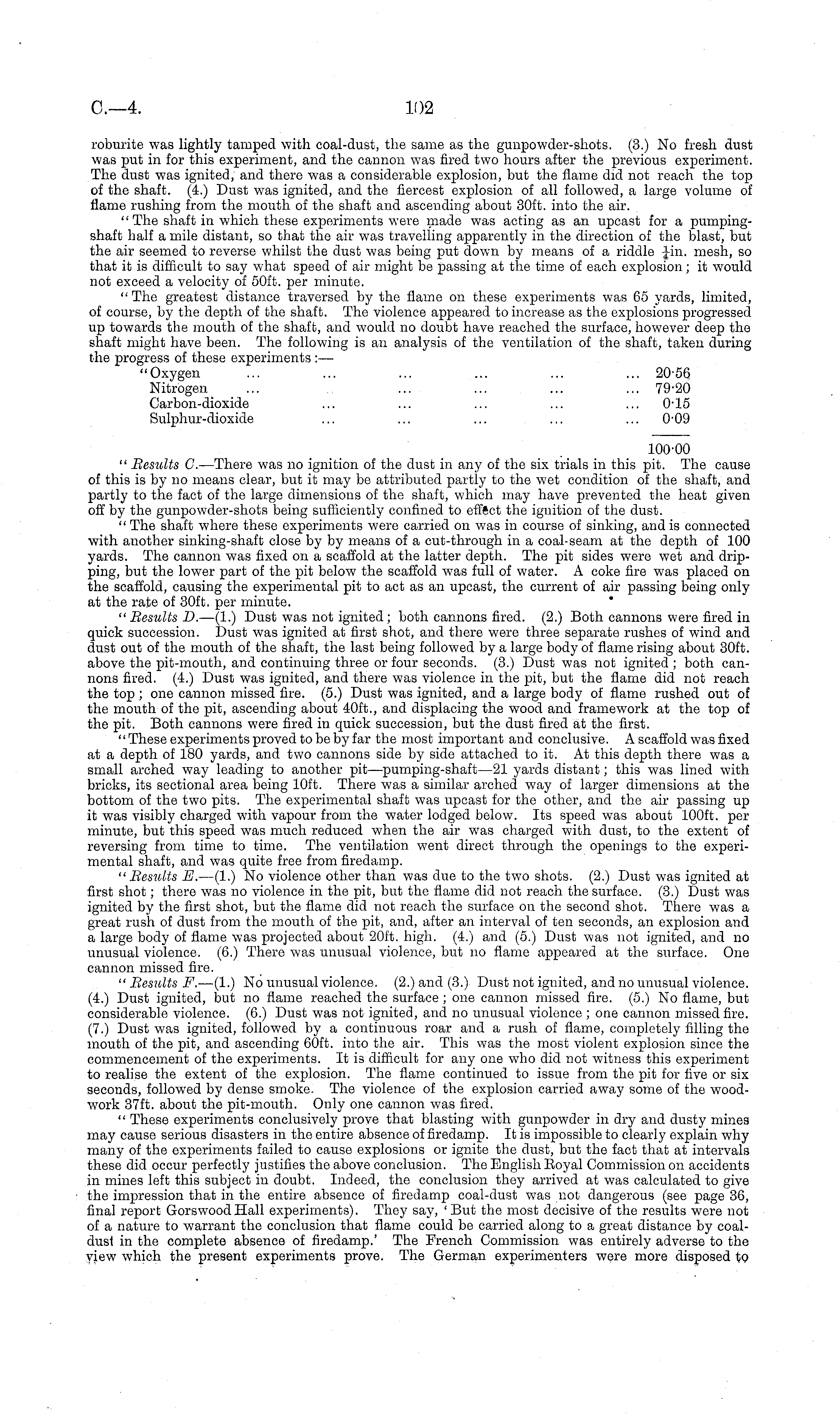 roburite was lightly tamped with coal-dust, the same as the gunpowder-shots. (3.) No fresh dust was put in for this experiment, and the cannon was fired two hours after the previous experiment. The dust was ignited, and there was a considerable explosion, but the flame did not reach the top of the shaft. (4.) Dust was ignited, and the fiercest explosion of all followed, a large volume of flame rushing from the mouth of the shaft and ascending about 30ft. into the air. " The shaft in which these experiments were made was acting as an upcast for a pumpingshaft half a mile distant, so that the air was travelling apparently in the direction of the blast, but the air seemed to reverse whilst the dust was being put down by means of a riddle Jin. mesh, so that it is difficult to say what speed of air might be passing at the time of each explosion; it would not exceed a velocity of 50ft. per minute. " The greatest distance traversed by the flame on these experiments was 65 yards, limited, of course, by the depth of the shaft. The violence appeared to increase as the explosions progressed up towards the mouth of the shaft, and would no doubt have reached the surface, however deep the shaft might have been. The following is an analysis of the ventilation of the shaft, taken during the progress of these experiments : — "Oxygen ... ... ... ... .... ... 20-56 Nitrogen ... ... ... ... ... 79-20 Carbon-dioxide ... ... ... ... ... 0-15 Sulphur-dioxide ... ... ... ... ... 0-09 100-00 " Besults C. —There was no ignition of the dust in any of the six trials in this pit. The cause of this is by no means clear, but it may be attributed partly to the wet condition of the shaft, and partly to the fact of the large dimensions of the shaft, which may have prevented the heat given off by the gunpowder-shots being sufficiently confined to effect the ignition of the dust. " The shaft where these experiments were carried on was in course of sinking, and is connected with another sinking-shaft close by by means of a cut-through in a coal-seam at the depth of 100 yards. The cannon was fixed on a scaffold at the latter depth. The pit sides were wet and dripping, but the lower part of the pit below the scaffold was full of water. A coke fire was placed on the scaffold, causing the experimental pit to act as an upcast, the current of air passing being only at the rate of 30ft. per minute. "Besults D. —(l.) Dust was not ignited; both cannons fired. (2.) Both cannons were fired in quick succession. Dust was ignited at first shot, and there were three separate rushes of wind and dust out of the mouth of the shaft, the last being followed by a large body of flame rising about 30ft. above the pit-mouth, and continuing three or four seconds. (3.) Dust was not ignited ; both cannons fired. (4.) Dust was ignited, and there was violence in the pit, but the flame did not reach the top ; one cannon missed fire. (5.) Dust was ignited, and a large body of flame rushed out of the mouth of the pit, ascending about 40ft., and displacing the wood and framework at the top of the pit. Both cannons were fired in quick succession, but the dust fired at the first. "These experiments proved to be by far the most important and conclusive. A scaffold was fixed at a depth of 180 yards, and two cannons side by side attached to it. At this depth there was a small arched way leading to another pit —pumping-shaft —21 yards distant; this was lined with bricks, its sectional area being 10ft. There was a similar arched way of larger dimensions at the bottom of the two pits. The experimental shaft was upcast for the other, and the air passing up it was visibly charged with vapour from the water lodged below. Its speed was about 100 ft. per minute, but this speed was much reduced when the air was charged with dust, to the extent of reversing from time to time. The ventilation went direct through the openings to the experimental shaft, and was quite free from firedamp. "Besults E. —(1.) No violence other than was due to the two shots. (2.) Dust was ignited at first shot; there was no violence in the pit, but the flame did not reach the surface. (3.) Dust was ignited by the first shot, but the flame did not reach the surface on the second shot. There was a great rush of dust from the mouth of the pit, and, after an interval of ten seconds, an explosion and a large body of flame was projected about 20ft. high. (4.) and (5.) Dust was not ignited, and no unusual violence. (6.) There was unusual violence, but no flame appeared at the surface. One cannon missed fire. " Besults F. —(l.) No unusual violence. (2.) and (3.) Dust not ignited, and no unusual violence. (4.) Dust ignited, but no flame reached the surface ; one cannon missed fire. (5.) No flame, but considerable violence. (6.) Dust was not ignited, and no unusual violence ; one cannon missed fire. (7.) Dust was ignited, followed by a continuous roar and a rush of flame, completely filling the mouth of the pit, and ascending 60ft. into the air. This was the most violent explosion since the commencement of the experiments. It is difficult for any one who did not witness this experiment to realise the extent of the explosion. The flame continued to issue from the pit for five or six seconds, followed by dense smoke. The violence of the explosion carried away some of the woodwork 37ft. about the pit-mouth. Only one cannon was fired. " These experiments conclusively prove that blasting with gunpowder in dry and dusty mines may cause serious disasters in the entire absence of firedamp. It is impossible to clearly explain why many of the experiments failed to cause explosions or ignite the dust, but the fact that at intervals these did occur perfectly justifies the above conclusion. The English Royal Commission on accidents in mines left this subject in doubt. Indeed, the conclusion they arrived at was calculated to give the impression that in the entire absence of firedamp coal-dust was not dange