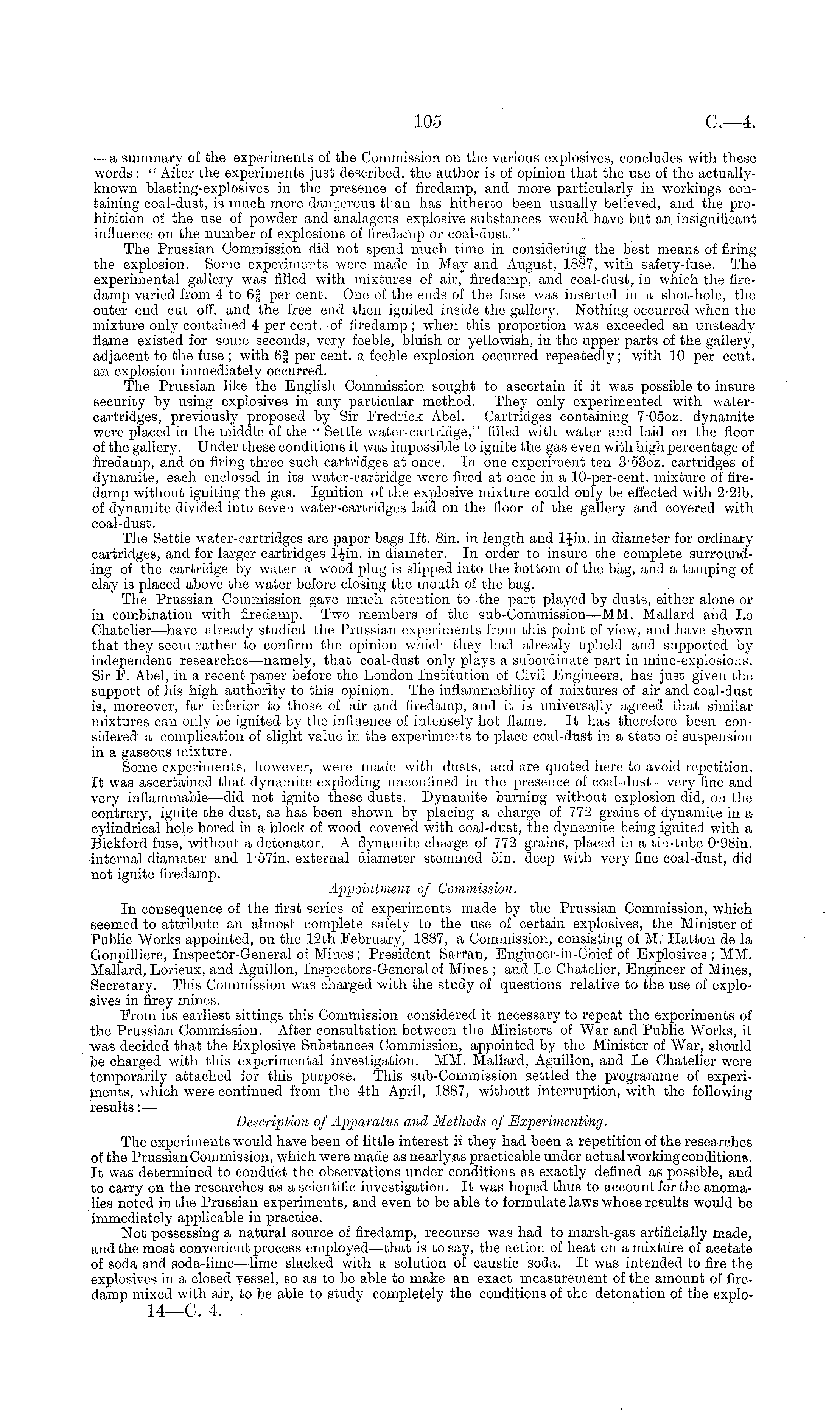 —a summary of the experiments of the Commission on the various explosives, concludes with these words : " After the experiments just described, the author is of opinion that the use of the actuallyknown blasting-explosives in the presence of firedamp, and more particularly in workings containing coal-dust, is much more dangerous than has hitherto been usually believed, and the prohibition of the use of powder and analagous explosive substances would have but an insignificant influence on the number of explosions of firedamp or coal-dust." The Prussian Commission did not spend much time in considering the best means of firing the explosion. Some experiments were made in May and August, 1887, with safety-fuse. The experimental gallery was filled with mixtures of air, firedamp, and coal-dust, in which the firedamp varied from Ito 6f per cent. One of the ends of the fuse was inserted in a shot-hole, the outer end cut off, and the free end then ignited inside the gallery. Nothing occurred when the mixture only contained 4 per cent, of firedamp ; when this proportion was exceeded an unsteady flame existed for some seconds, very feeble, bluish or yellowish, in the upper parts of the gallery, adjacent to the fuse ; with 6f per cent, a feeble explosion occurred repeatedly; with 10 per cent, an explosion immediately occurred. The Prussian like the English Commission sought to ascertain if it was possible to insure security by using explosives in any particular method. They only experimented with watercartridges, previously proposed by Sir Fredrick Abel. Cartridges containing 7'050z. dynamite were placed in the middle of the " Settle water-cartridge," filled with water and laid on the floor of the gallery. Under these conditions it was impossible to ignite the gas even with high percentage of firedamp, and on firing three such cartridges at once. In one experiment ten 3'530z. cartridges of dynamite, each enclosed in its water-cartridge were fired at once in a 10-per-cent. mixture of firedamp without igniting the gas. Ignition of the explosive mixture could only be effected with 2-21b. of dynamite divided into seven water-cartridges laid on the floor of the gallery and covered with coal-dust. The Settle water-cartridges are paper bags Ift. Bin. in length and ljin. in diameter for ordinary cartridges, and for larger cartridges 14in. in diameter. In order to insure the complete surrounding of the cartridge by water a wood plug is slipped into the bottom of the bag, and a tamping of clay is placed above the water before closing the mouth of the bag. The Prussian Commission gave much attention to the part played by dusts, either alone or in combination with firedamp. Two members of the sub-Commission—MM. Mallard and Le Chatelier —have already studied the Prussian experiments from this point of view, and have shown that they seem rather to confirm the opinion which they had already upheld and supported by independent researches—namely, that coal-dust only plays a subordinate part in mine-explosions. Sir F. Abel, in a recent paper before the London Institution of Civil Engineers, has just given the support of his high authority to this opinion. The inflammability of mixtures of air and coal-dust is, moreover, far inferior to those of air and firedamp, and it is universally agreed that similar mixtures can only be ignited by the influence of intensely hot flame. It has therefore been considered a complication of slight value in the experiments to place coal-dust in a state of suspension in a gaseous mixture. Some experiments, however, were made with dusts, and are quoted here to avoid repetition. It was ascertained that dynamite exploding unconfined in the presence of coal-dust —very fine and very inflammable—did not ignite these dusts. Dynamite burning without explosion did, on the contrary, ignite the dust, as has been shown by placing a charge of 772 grains of dynamite in a cylindrical hole bored in a block of wood covered with coal-dust, the dynamite being ignited with a Bickford fuse, without a detonator. A dynamite charge of 772 grains, placed in a tin-tube 0-98 in. internal diamater and l's7in. external diameter stemmed sin. deep with very fine coal-dust, did not ignite firedamp. Appointment of Commission. In consequence of the first series of experiments made by the Prussian Commission, which seemed to attribute an almost complete safety to the use of certain explosives, the Minister of Public Works appointed, on the 12th February, 1887, a Commission, consisting of M. Hatton de la Gonpilliere, Inspector-General of Mines; President Sarran, Engineer-in-Chief of Explosives ; MM. Mallard, Lorieux, and Aguillon, Inspectors-General of Mines ; and Le Chatelier, Engineer of Mines, Secretary. This Commission was charged with the study of questions relative to the use of explosives in firey mines. From its earliest sittings this Commission considered it necessary to repeat the experiments of the Prussian Commission. After consultation between the Ministers of War and Public Works, it was decided that the Explosive Substances Commission, appointed by the Minister of War, should be charged with this experimental investigation. MM. Mallard, Aguillon, and Le Chatelier were temporarily attached for this purpose. This sub-Commission settled the programme of experiments, which were continued from the 4th April, 1887, without interruption, with the following results: — Description of Apparatus and Methods of Experimenting. The experiments would have been of little interest if they had been a repetition of the researches of the Prussian Commission, which were made as nearly as practicable under actual workingconditions. It was determined to conduct the observations under conditions as exactly defined as possible, and to carry on the researches as a scientific investigation. It was hoped thus to account for the anomalies noted in the Prussian experiments, and even to be able to formulate laws whose resul