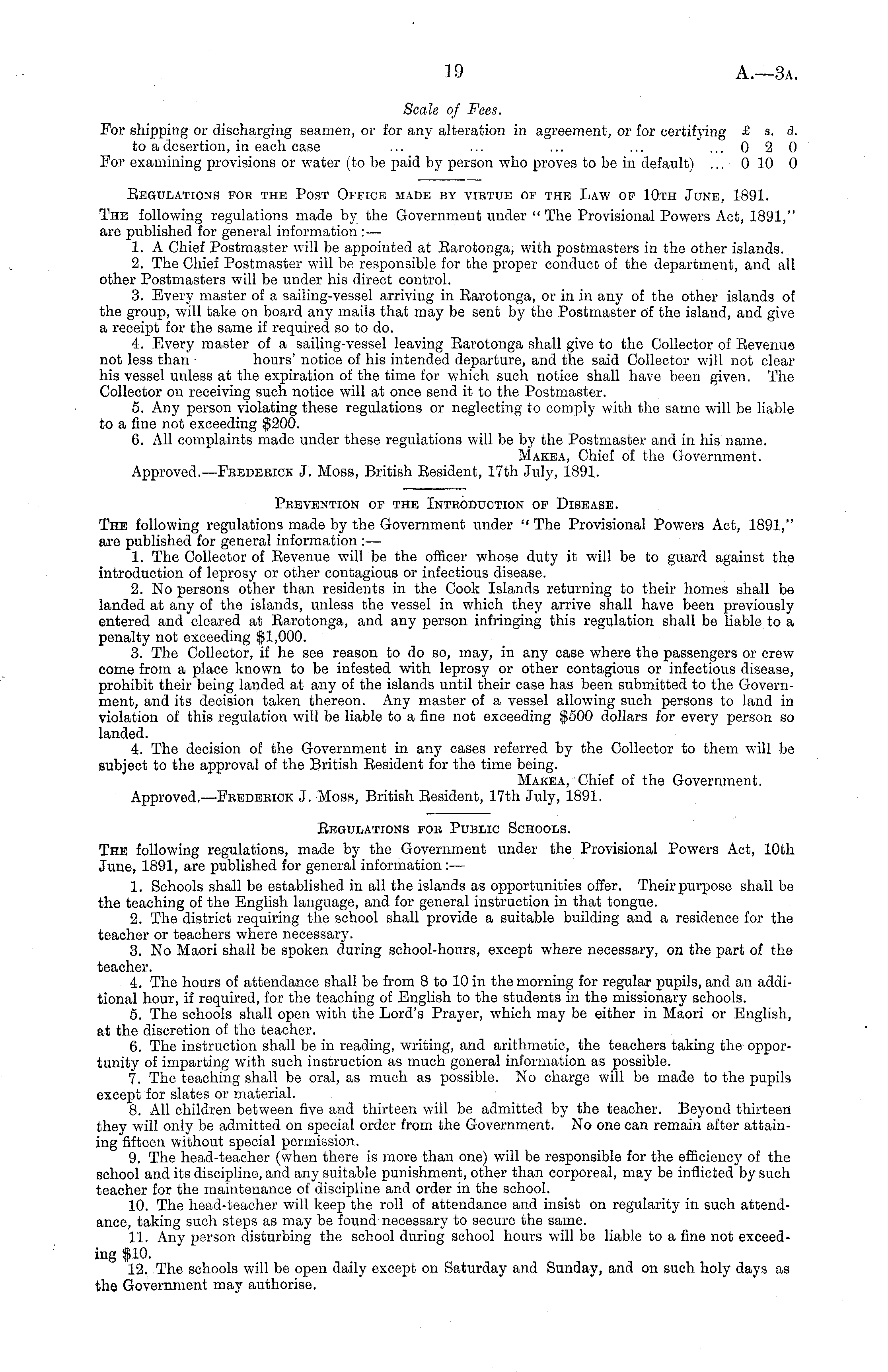 Begulations foe Public Schools. The following regulations, made by the Government under the Provisional Powers Act, 10th June, 1891, are published for general information: — 1. Schools shall be established in all the islands as opportunities offer. Their purpose shall be the teaching of the English language, and for general instruction in that tongue. 2. The district requiring the school shall provide a suitable building and a residence for the teacher or teachers where necessary. 3. No Maori shall be spoken during school-hours, except where necessary, on the part of the teacher. 4. The hours of attendance shall be from 8 to 10 in the morning for regular pupils, and an additional hour, if required, for the teaching of English to the students in the missionary schools. 5. The schools shall open with the Lord's Prayer, which may be either in Maori or English, at the discretion of the teacher. 6. The instruction shall be in reading, writing, and arithmetic, the teachers taking the opportunity of imparting with such instruction as much general information as possible. 7. The teaching shall be oral, as much as possible. No charge will be made to the pupils except for slates or material. 8. All children between five and thirteen will be admitted by the teacher. Beyond thirteen they will only be admitted on special order from the Government. No one can remain after attaining fifteen without special permission. 9. The head-teacher (when there is more than one) will be responsible for the efficiency of the school and its discipline, and any suitable punishment, other than corporeal, may be inflicted by such teacher for the maintenance of discipline and order in the school. 10. The head-teacher will keep the roll of attendance and insist on regularity in such attendance, taking such steps as may be found necessary to secure the same. 11. Any person disturbing the school during school hours will be liable to a fine not exceeding $10. 12. The schools will be open daily except on Saturday and Sunday, and on such holy days as the Government may authorise.