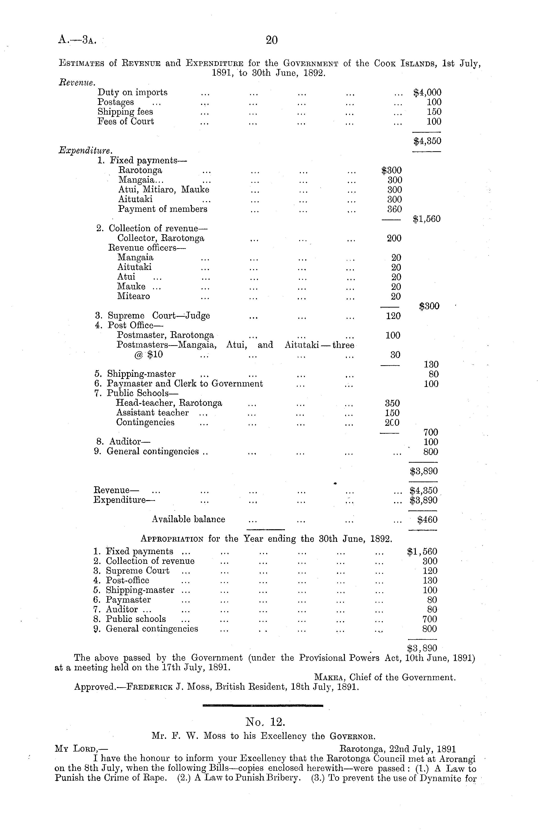 Appropriation for the Year ending the 30th June, 1892. 1. Fixed payments ... ... ... ... ... ... $1,560 2. Collection of revenue ... ... ... ... ... 300 3. Supreme Court ... ... ... ... ... ... 120 4. Post-office ... ... ... ... ... ... 130 5. Shipping-master ... ... ... ... .., ... 100 6. Paymaster ... ... ... ... ... ... 80 7. Auditor ... ... ... ... ... ... ... 80 8. Public schools ... ... ... ... ... ... 700 9. General contingencies ... . . ... ... ... 800 $3,890 The above passed by the Government (under the Provisional Powers Act, 10th June, 1891) at a meeting held on the 17th July, 1891. Makea, Chief of the Government. Approved.-—Frederick J. Moss, British Eesident, 18th July, 1891.