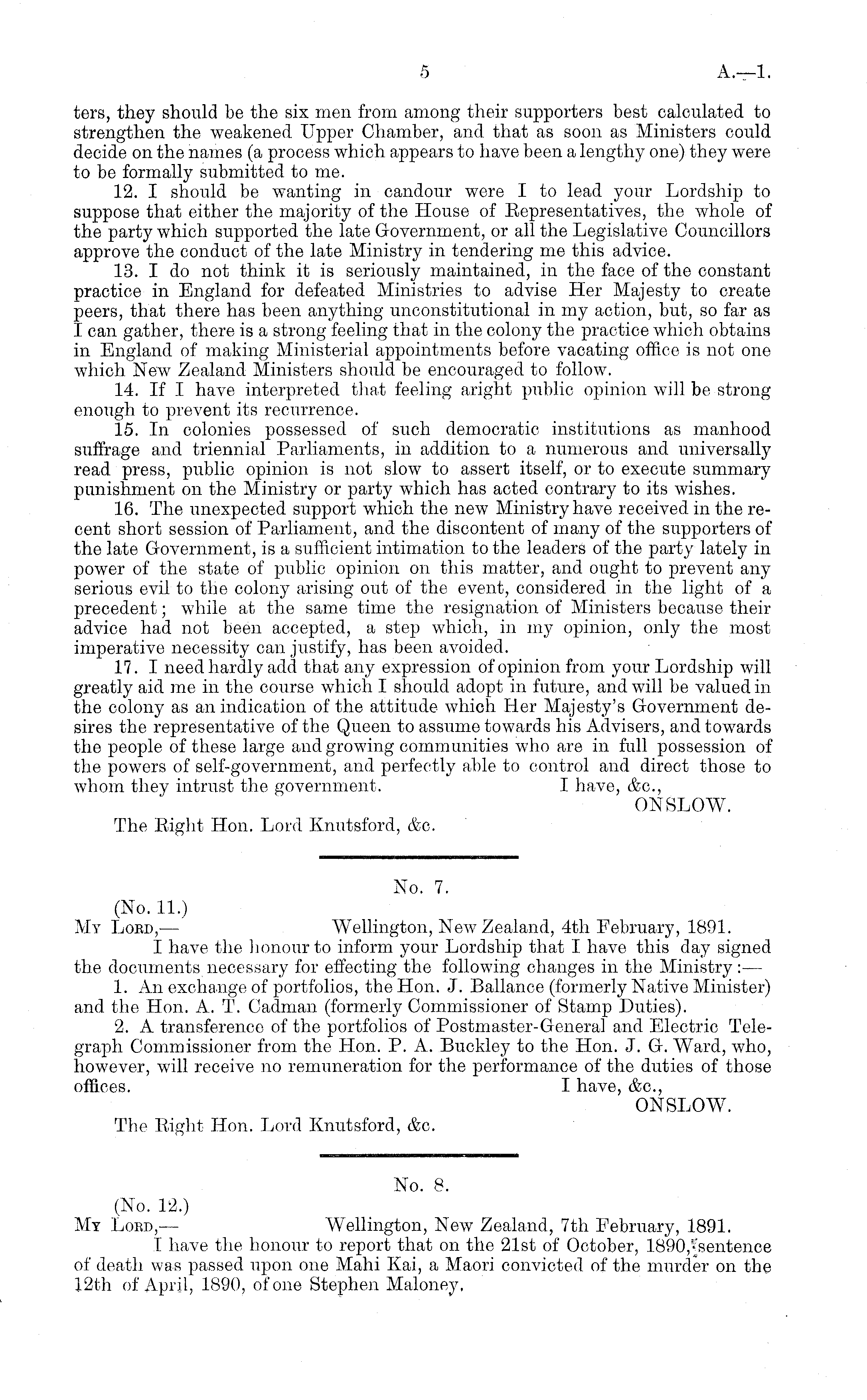 No. 7. (No. 11.) My Lobd, — Wellington, New Zealand, 4th February, 1891. I have the honour to inform your Lordship that I have this day signed the documents necessary for effecting the following changes in the Ministry:— 1. An exchange of portfolios, the Hon. J. Ballance (formerly Native Minister) and the Hon. A. T. Cadman (formerly Commissioner of Stamp Duties). 2. A transference of the portfolios of Postmaster-General and Electric Telegraph Commissioner from the Hon. P. A. Buckley to the Hon. J. G. Ward, who, however, will receive no remuneration for the performance of the duties of those offices. I have, &c, ONSLOW. The Right Hon. Lord Knutsford, &c.
