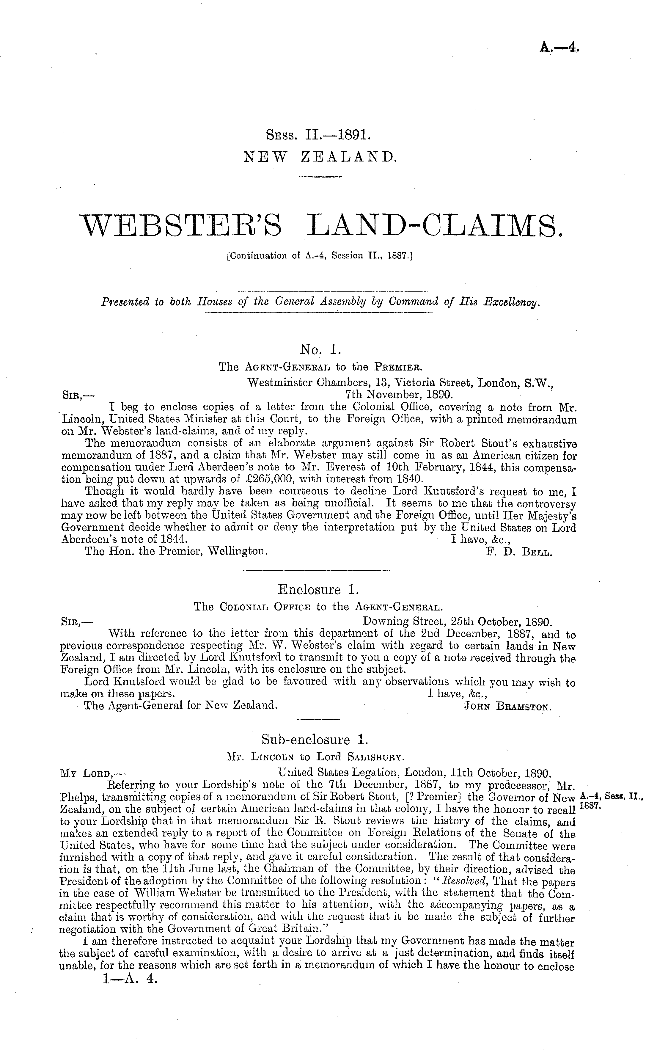Enclosure 1. The Colonial Office to the Agent-Geneeal. Sic,— Downing Street, 25th October, 1890. With reference to the letter from this department of the 2nd December, 1887, and to previous correspondence respecting Mr. W. Webster's claim with regard to certain lands in NewZealand, I am directed by Lord Knutsford to transmit to you a copy of a note received through the Foreign Office from Mr. Lincoln, with its enclosure on the subject. Lord Knutsford would be glad to be favoured with any observations which you may wish to make on these papers. I have, &c, The Agent-General for New Zealand. John Beamston.
