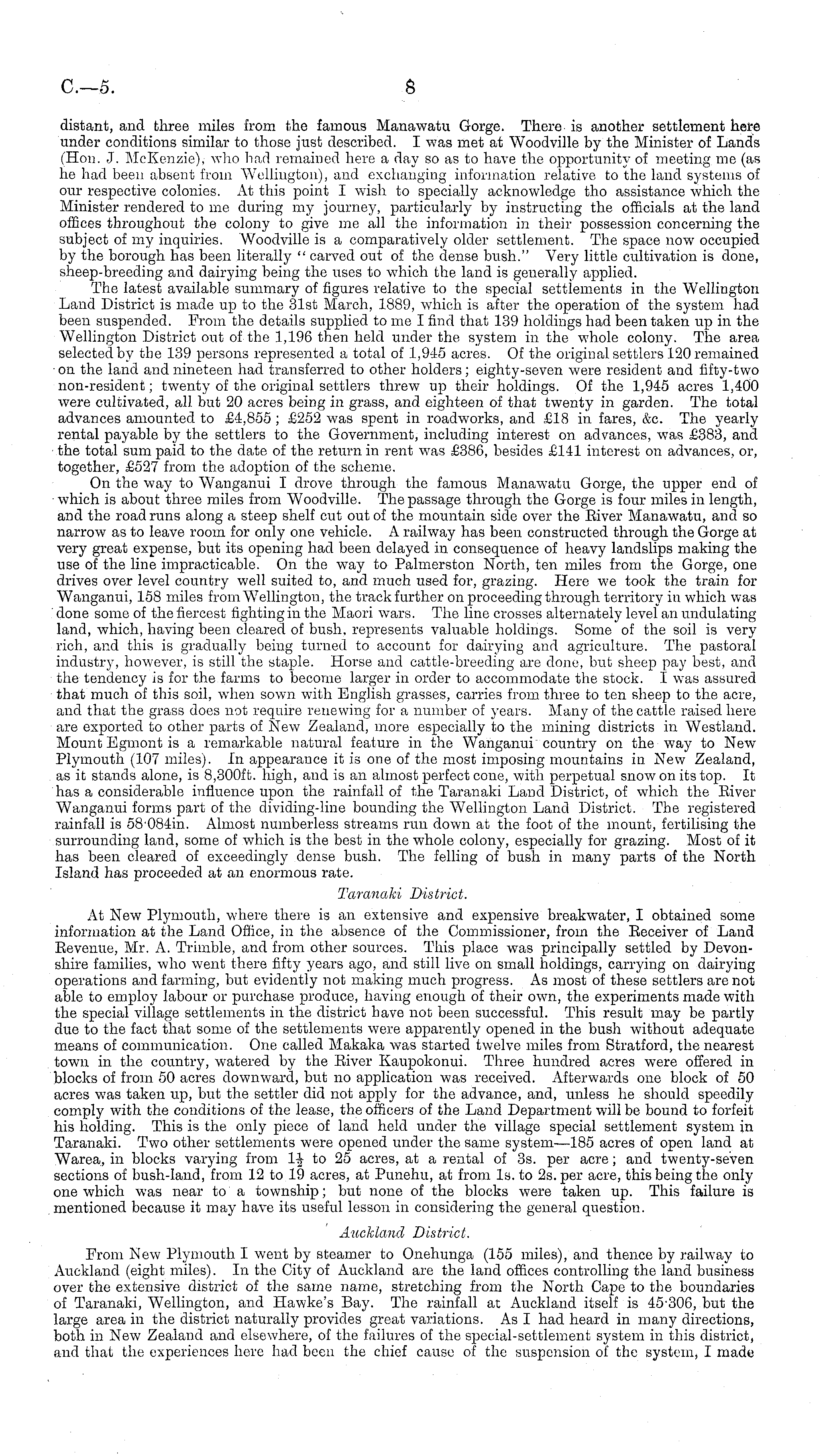 distant, and three miles from the famous Manawatu Gorge. There is another settlement here under conditions similar to those just described. I was met at Woodville by the Minister of Lands (Hon. J. McKenzie); who had remained here a day so as to have the opportunity of meeting me (as he had been absent from Wellington), and exchanging information relative to the land systems of our respective colonies. At this point I wish to specially acknowledge tho assistance which the Minister rendered to me during my journey, particularly by instructing the officials at the land offices throughout the colony to give me all the information in their possession concerning the subject of my inquiries. Woodville is a comparatively older settlement. The space now occupied by the borough has been literally " carved out of the dense bush." Very little cultivation is done, sheep-breeding and dairying being the uses to which the land is generally applied. The latest available summary of figures relative to the special settlements in the Wellington Land District is made up to the 31st March, 1889, which is after the operation of the system had been suspended. From the details supplied to me I find that 139 holdings had been taken up in the Wellington District out of the 1,196 then held under the system in the whole colony. The area selected by the 139 persons represented a total of 1,945 acres. Of the original settlers 120 remained on the land and nineteen had transferred to other holders; eighty-seven were resident and fifty-two non-resident; twenty of the original settlers threw up their holdings. Of the 1,945 acres 1,400 were cultivated, all but 20 acres being in grass, and eighteen of that twenty in garden. The total advances amounted to £4,855 ; £252 was spent in roadw-orks, and £18 in fares, &c. The yearly rental payable by the settlers to the Government, including interest on advances, was £383, and the total sum paid to the date of the return in rent was £386, besides £141 interest on advances, or, together, £527 from the adoption of the scheme. On the way to Wanganui I drove through the famous Manawatu Gorge, the upper end of which is about three miles from Woodville. The passage through the Gorge is four miles in length, and the road runs along a steep shelf cut out of the mountain side over the River Manawatu, and so narrow as to leave room for only one vehicle. A railway has been constructed through the Gorge at very great expense, but its opening had been delayed in consequence of heavy landslips making the use of the line impracticable. On the way to Palmerston North, ten miles from the Gorge, one drives over level country well suited to, and much used for, grazing. Here we took the train for Wanganui, 158 miles from Wellington, the track further on proceeding through territory in which was done some of the fiercest fighting in the Maori wars. The line crosses alternately level an undulating land, which, having been cleared of bush, represents valuable holdings. Some of the soil is very rich, and this is gradually being turned to account for dairying and agriculture. The pastoral industry, however, is still the staple. Horse and cattle-breeding are clone, but sheep pay best, and the tendency is for the farms to become larger in order to accommodate the stock. I was assured that much of this soil, when sown with English grasses, carries from three to ten sheep to the acre, and that the grass does not require renewing for a number of years. Many of the cattle raised here are exported to other parts of New Zealand, more especially to the mining districts in Westland. Mount Egmont is a remarkable natural feature in the Wanganui country on the way to New Plymouth (107 miles). In appearance it is one of the most imposing mountains in New Zealand, as it stands alone, is 8,300 ft. high, and is an almost perfect cone, with perpetual snow on its top. It has a considerable influence upon the rainfall of the Taranaki Land District, of which the River Wanganui forms part of the dividing-line bounding the Wellington Land District. The registered rainfall is 58-084 in. Almost numberless streams run down at the foot of the mount, fertilising the surrounding land, some of which is the best in the whole colony, especially for grazing. Most of it has been cleared of exceedingly dense bush. The felling of bush in many parts of the North Island has proceeded at an enormous rate. Taranaki District. At New Plymouth, where there is an extensive and expensive breakwater, I obtained some information at the Land Office, in the absence of the Commissioner, from the Receiver of Land Revenue, Mr. A. Trimble, and from other sources. This place was principally settled by Devonshire families, who went there fifty years ago, and still live on small holdings, carrying on dairying operations and farming, but evidently not making much progress. As most of these settlers are not able to employ labour or purchase produce, having enough of their own, the experiments made with the special village settlements in the district have not been successful. This result may be partly due to the fact that some of the settlements were apparently opened in the bush without adequate means of communication. One called Makaka was started twelve miles from Stratford, the nearest town in the country, watered by the River Kaupokonui. Three hundred acres were offered in blocks of from 50 acres downward, but no application was received. Afterwards one block of 50 acres was taken up, but the settler did not apply for the advance, and, unless he should speedily comply with the conditions of the lease, the officers of the Land Department will be bound to forfeit his holding. This is the only piece of land held under the village special settlement system in Taranaki. Two other settlements were opened under the same system—lßs acres of open land at Warea, in blocks varying from 1-| to 25 acres, at a rental of 3s. per acre; and twenty-seven sections of 