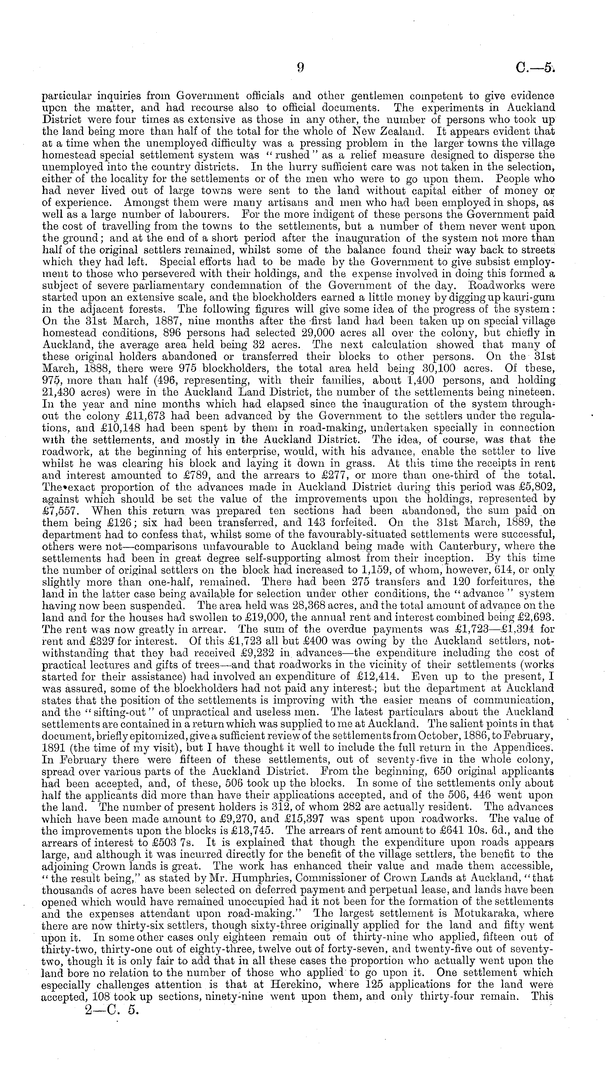 particular inquiries from Government officials and other gentlemen competent to give evidence upon the matter, and had recourse also to official documents. The experiments in Auckland District were four times as extensive as those in any other, the number of persons who took up the land being more than half of the total for the whole of New Zealand. It appears evident that at a time when the unemployed difficulty was a pressing problem in the larger towns the village homestead special settlement system was " rushed " as a relief measure designed to disperse the unemployed into the country districts. In the hurry sufficient care was not taken in the selection, either of the locality for the settlements or of the men who were to go upon them. People who had never lived out of large towns were sent to the land without capital either of money or of experience. Amongst them were many artisans and men who had been employed in shops, as well as a large number of labourers. For the more indigent of these persons the Government paid the cost of travelling from the towns to the settlements, but a number of them never went upon the ground; and at the end of a short period after the inauguration of the system not more than half of the original settlers remained, whilst some of the balance found their way back to streets which they had left. Special efforts had to be made by the Government to give subsist employment to those who persevered with their holdings, and the expense involved in doing this formed a subject of severe parliamentary condemnation of the Government of the day. Roadworks were started upon an extensive scale, and the blockholders earned a little money by digging up kauri-gum in the adjacent forests. The following figures will give some idea of the progress of the system: On the 31st March, 1887, nine months after the -first land had been taken up on special village homestead conditions, 896 persons had selected 29,000 acres all over the colony, but chiefly in Auckland, the average area held being 32 acres. The next calculation showed, that many of these original holders abandoned or transferred their blocks to other persons. On the 31st March, 1888, there were 975 blockholders, the total area held being 30,100 acres. Of these, 975, more than half (496, representing, with their families, about 1,400 persons, and holding 21,430 acres) were in the Auckland Land District, the number of the settlements being nineteen. In the year and nine months which had elapsed since the inauguration of the system throughout the colony £11,673 had been advanced by the Government to the settlers under the regulations, and £10,148 had been spent by them in road-making, undertaken specially in connection With the settlements, and mostly in the Auckland District. The idea, of course, was that the roadwork, at the beginning of his enterprise, would, with his advance, enable the settler to live whilst he was clearing his block and laying it down in grass. At this time the receipts in rent and interest amounted to £789, and the arrears to £277, or more than one-third of the total. The»exact proportion of the advances made in Auckland District during this period was £5,802, against which should be set tlie value of the improvements upon the holdings, represented by £7,557. When this return was prepared ten sections had been abandoned, tho sum paid on them being £126; six had been transferred, and 143 forfeited. On the 31st March, 1889, the department had to confess that, whilst some of the favourably-situated settlements were successful, others were not—comparisons unfavourable to Auckland being made with Canterbury, where the settlements had been in great degree self-supporting almost from their inception. By this time the number of original settlers on the block had increased to 1,159, of whom, however, 614, or only slightly more than one-half, remained. There had been 275 transfers and 120 forfeitures, the land in the latter case being available for selection under other conditions, the " advance " system having now been suspended. The area held was 28,368 acres, and the total amount of advance on the land and for the houses had swollen to £19,000, the annual rent and interest combined being £2,693. The rent was now greatly in arrear. The sum of the overdue payments was £1,723 —£1,394 for rent and £329' for interest. Of this £1,723 all but £400 was owing by the Auckland settlers, notwithstanding that they had received £9,232 in advances—the expenditure including the cost of practical lectures and gifts of trees—and that roadworks in the vicinity of their settlements (works started for their assistance) had involved an expenditure of £12,414. Even up to the present, I was assured, some of the blockholders had not paid any interest-; but the department at Auckland states that the position of the settlements is improving with -the easier means of communication, and the " sifting-out "of unpractical and useless men. The latest particulars about the Auckland settlements are contained in a return which was supplied to me at Auckland. The salient pom ts in that document, briefly epitomized, give a sufficient review of the settlements from October, 1886, to February, 1891 (the time of my visit), but I have thought it well to include the full return in the Appendices. In February there were fifteen of these settlements, out of seventy-five in the whole colony, spread over various parts of the Auckland District. From the beginning, 650 original applicants had been accepted, and, of these, 506 took up the blocks. In some of the settlements only about half the applicants did more than have their applications accepted, and of the 506, 446 went upon the land. The number of present holders is 312, of whom 282 are actually resident. The advances which have been made amount to £9,270, and £15,397 was spent upon roadworks. The value of the improvements upon the blocks is £13,745. The arrears of r