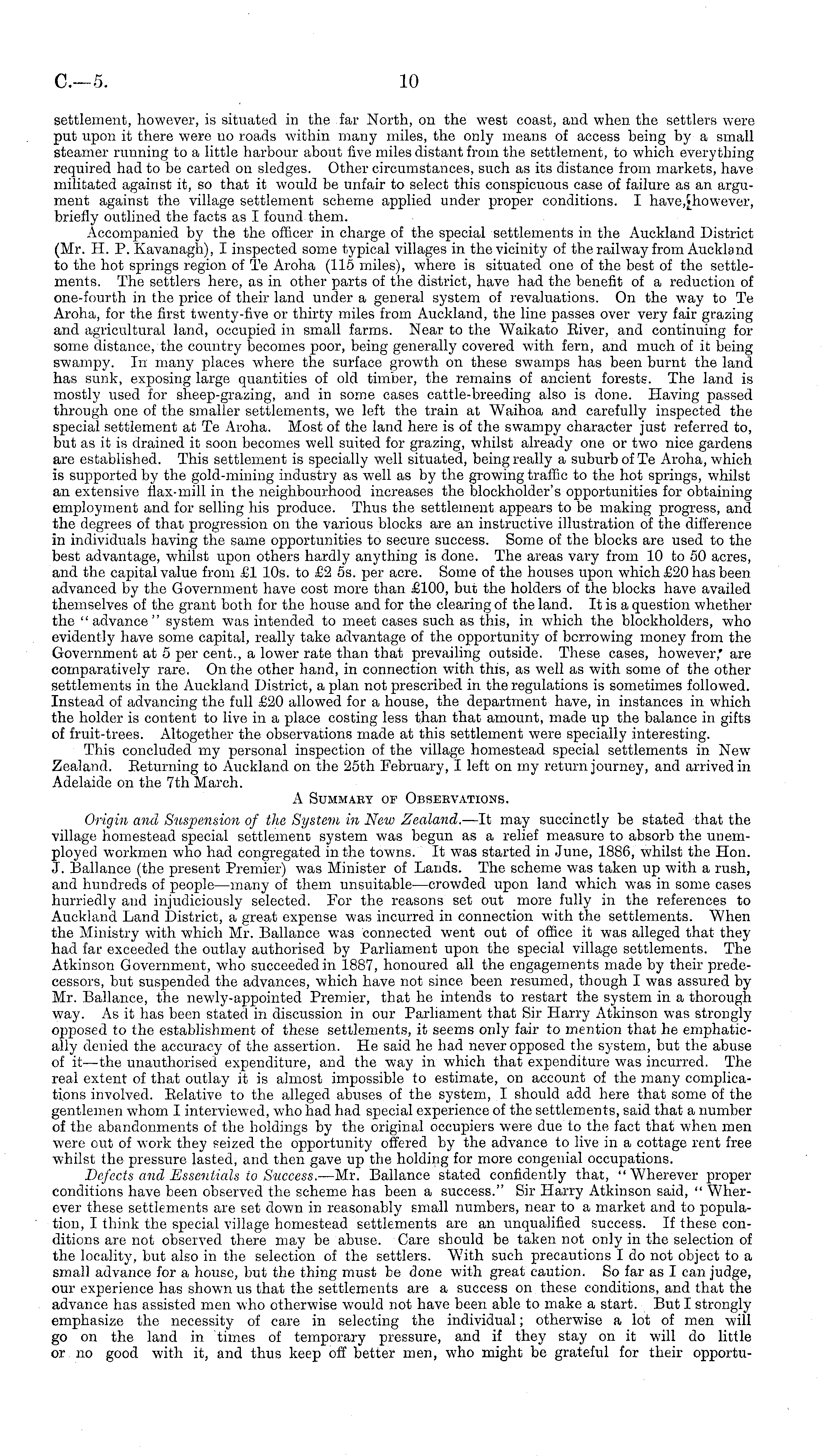 settlement, however, is situated in the far North, on the west coast, and when, the settlers were put upon it there were no roads within many miles, the only means of access being by a small steamer running to a little harbour about five miles distant from the settlement, to which everything required had to be carted on sledges. Other circumstances, such as its distance from markets, have militated against it, so that it would be unfair to select this conspicuous case of failure as an argument against the village settlement scheme applied under proper conditions. I have,[however, briefly outlined the facts as I found them. Accompanied by the the officer in charge of the special settlements in the Auckland District (Mr. H. P. Kavanagh), I inspected some typical villages in the vicinity of the railway from Auckland to the hot springs region of Te Aroha (115 miles), where is situated one of the best of the settlements. The settlers here, as in other parts of the district, have had the benefit of a reduction of one-fourth in the price of their land under a general system of revaluations. On the way to Te Aroha, for the first twenty-five or thirty miles from Auckland, the line passes over very fair grazing and agricultural land, occupied in small farms. Near to the Waikato River, and continuing for some distance, the country becomes poor, being generally covered with fern, and much of it being swampy. In many places where the surface growth on these swamps has been burnt the land has sunk, exposing large quantities of old timber, the remains of ancient forests. The land is mostly used for sheep-grazing, and in some cases cattle-breeding also is done. Having passed through one of the smaller settlements, we left the train at Waihoa and carefully inspected the special settlement at Te Aroha. Most of the land here is of the swampy character just referred to, but as it is drained it soon becomes well suited for grazing, whilst already one or two nice gardens are established. This settlement is specially well situated, being really a suburb of Te Aroha, which is supported by the gold-mining industry as well as by the growing traffic to the hot springs, whilst an extensive flax-mill in the neighbourhood increases the blockholder's opportunities for obtaining employment and for selling his produce. Thus the settlement appears to be making progress, and the degrees of that progression on the various blocks are an instructive illustration of the difference in individuals having the same opportunities to secure success. Some of the blocks are used to the best advantage, whilst upon others hardly anything is done. The areas vary from 10 to 50 acres, and the capital value from £1 10s. to £2 ss. per acre. Some of the houses upon which £20 has been advanced by the Government have cost more than £100, but the holders of the blocks have availed themselves of the grant both, for the house and for the clearing of the land. It is a question whether the "advance" system was intended to meet cases such as this, in which the blockholders, who evidently have some capital, really take advantage of the opportunity of borrowing money from the Government at 5 per cent., a lower rate than that prevailing outside. These cases, however,* are comparatively rare. On the other hand, in connection with this, as well as with some of the other settlements in the Auckland District, a plan not prescribed in the regulations is sometimes followed. Instead of advancing the full £20 allowed for a house, the department have, in instances in which the holder is content to live in a place costing less than that amount, made up the balance in gifts of fruit-trees. Altogether the observations made at this settlement were specially interesting. This concluded my personal inspection of the village homestead special settlements in New Zealand. Returning to Auckland on the 25th February, I left on my return journey, and arrived in Adelaide on the 7th March. A SUMMAEY OF OBSEEVATIONS. Origin and Suspension of the System in New Zealand. —It may succinctly be stated that the village homestead special settlement; system was begun as a relief measure to absorb the unemployed workmen who had congregated in the towns. It was started in June, 1886, whilst the Hon. J. Ballance (the present Premier) was Minister of Lands. The scheme was taken up with a rush, and hundreds of people—many of them unsuitable —crowded upon land which was in some cases hurriedly and injudiciously selected. For the reasons set out more fully in the references to Auckland Land District, a great expense was incurred in connection with the settlements. When the Ministry with which Mr. Ballance was connected went out of office it was alleged that they had far exceeded the outlay authorised by Parliament upon the special village settlements. The Atkinson Government, who succeeded in 1887, honoured all the engagements made by their predecessors, but suspended the advances, which have not since been resumed, though I was assured by Mr. Ballance, the newly-appointed Premier, that he intends to restart the system in a thorough way. As it has been stated in discussion in our Parliament that Sir Harry Atkinson was strongly opposed to the establishment of these settlements, it seems only fair to mention that he emphatically denied the accuracy of the assertion. He said he had never opposed the system, but the abuse of it—the unauthorised expenditure, and the way in which that expenditure was incurred. The real extent of that outlay it is almost impossible to estimate, on account of the many complications involved. Relative to the alleged abuses of the system, I should add here that some of the gentlemen whom I interviewed, who had had special experience of the settlements, said that a number of the abandonments of the holdings by the original occupiers were due to the fact that when men were out of work they seized the opportunity offered by the advance to live in a cottage 