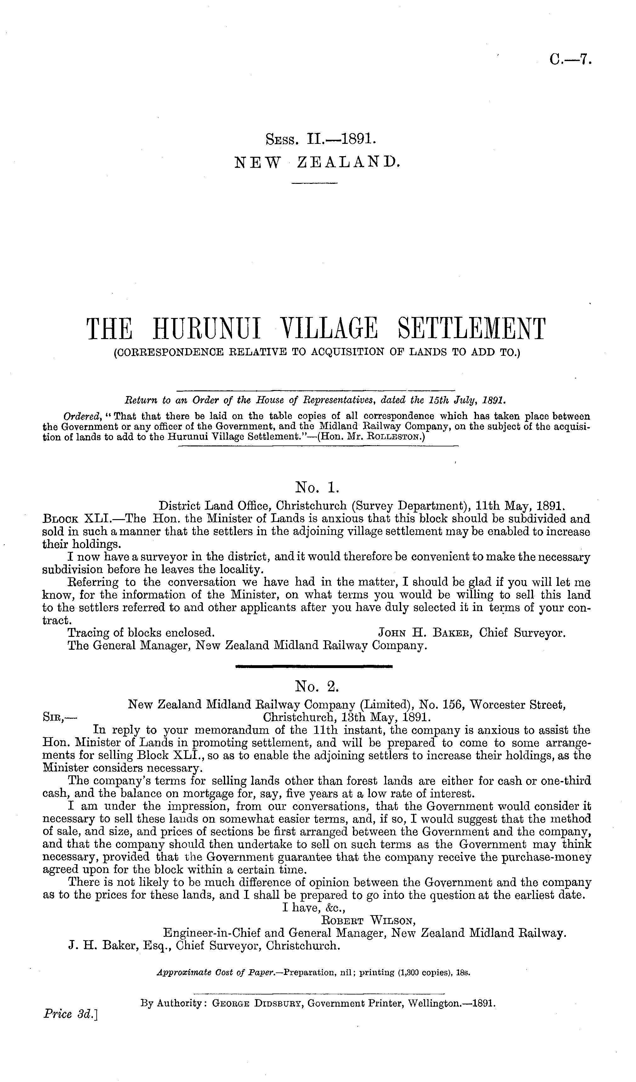 No. 2. New Zealand Midland Eailway Company (Limited), No. 156, Worcester Street, Sib,— Christchurch, 13th May, 1891. In reply to your memorandum of the 11th instant, the company is anxious to assist the Hon. Minister of Lands in promoting settlement, and will be prepared to come to some arrangements for selling Block XLI., so as to enable the adjoining settlers to increase their holdings, as the Minister considers necessary. The company's terms for selling lands other than forest lands are either for cash or one-third cash, and the balance on mortgage for, say, five years at a low rate of interest. I am under the impression, from our conversations, that the Government would consider it necessary to sell these lands on somewhat easier terms, and, if so, I would suggest that the method of sale, and size, and prices of sections be first arranged between the Government and the company, and that the company should then undertake to sell on such terms as the Government may think necessary, provided that the Government guarantee that the company receive the purchase-money agreed upon for the block within a certain time. There is not likely to be much difference of opinion between the Government and the company as to the prices for these lands, and I shall be prepared to go into the question at the earliest date. I have, &c, Eobeet Wilson, Engineer-in-Chief and General Manager, New Zealand Midland Eailway. J. H. Baker, Esq., Chief Surveyor, Christchurch. Approximate Cost of Paper.— Preparation, nil; printing (1,300 copies), 18s.
