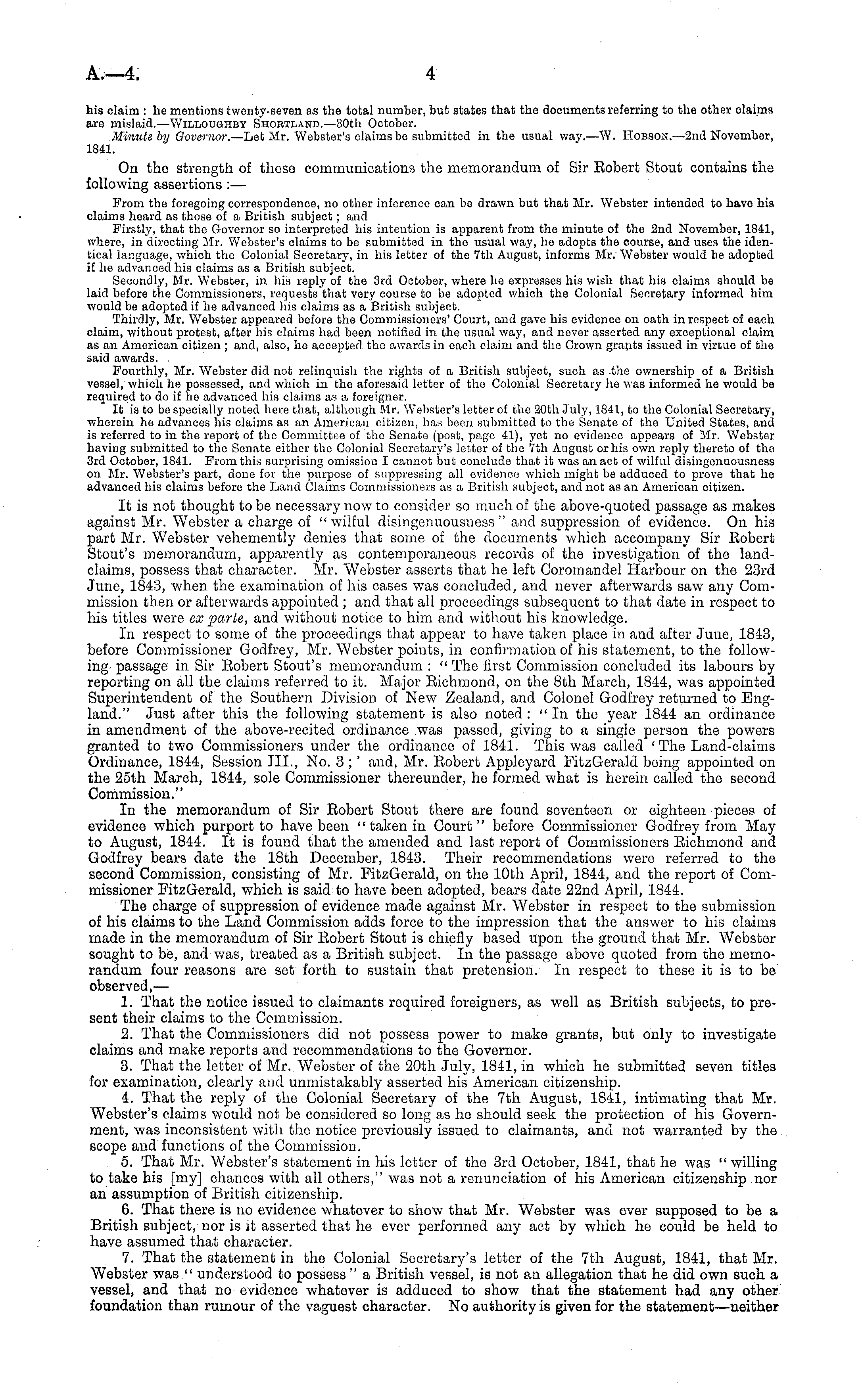 his claim : he mentions twenty-seven as the total number, but states that the documents referring to the other claims are mislaid.—Willoughby Shobtland. —30th October. Mimite by Governor. —Let Mr. Webster's claims be submitted in the usual way.—W. Hoeson.—2nd November, 1841. On the strength of these communications the memorandum of Sir Robert Stout contains the following assertions :— Prom the foregoing correspondence, no other inference can be drawn but that Mr. Webster intended to have his claims heard as those of a British subject; and Firstly, that the Governor so interpreted his intention is apparent from the minute of the 2nd November, 1841, where, in directing Mr. Webster's claims to be submitted in the usual way, he adopts the course, and uses the identical language, which the Colonial Secretary, in his letter of the 7th August, informs Mr. Webster would be adopted if he advanced his claims as a British subject. Secondly, Mr. Webster, in his reply of the 3rd October, where he expresses his wish that his claims should be laid before the Commissioners, requests that very course to be adopted which the Colonial Secretary informed him would be adopted if he advanced his claims as a British subject. Thirdly, Mr. Webster appeared before the Commissioners' Court, and gave his evidence on oath in respect of each claim, without protest, after his claims had been notified in the usual way, and never asserted any exceptional claim as an American citizen ; and, also, he accepted the awards in each claim and the Crown grants issued in vircuo of the said awards. Fourthly, Mr. Webster did not relinquish the rights of a British subject, such as .the ownership of a British vessel, which he possessed, and which in the aforesaid letter of the Colonial Secretary he was informed he would be required to do if he advanced his claims as a foreigner. It is to be specially noted here that, although Mr. Webster's letter of the 20th July, 1841, to the Colonial Secretary, wherein he advances his claims as an American citizen, has been submitted to the Senate of the United States, and is referred to in the report of the Committee of the Senate (post, page 41), yet no evidence appears of Mr. Webster having submitted to the Senate either the Colonial Secretary's letter of the 7th August or his own reply thereto of the 3rd October, 1841. From this surprising omission I cannot but conclude that it was an act of wilful disingenuousness on Mr. Webster's part, done for the purpose of suppressing all evidence which might be adduced to prove that he advanced his claims before the Land Claims Commissioners as a British subject, and not as an American citizen. It is not thought to be necessai'y now to consider so much of the above-quoted passage as makes against Mr. Webster a charge of " wilful disingenuousness " and suppression of evidence. On his part Mr. Webster vehemently denies that some of the documents which accompany Sir Eobert Stout's memorandum, apparently as contemporaneous records of the investigation of the landclaims, possess that character. Mr. Webster asserts that he left Coromandel Harbour on the 23rd June, 1843, when the examination of his cases was concluded, and never afterwards saw any Commission then or afterwards appointed ; and that all proceedings subsequent to that date in respect to his titles were ex jparte, and without notice to him and without his knowledge. In respect to some of the proceedings that appear to have taken place in and after June, 1843, before Commissioner Godfrey, Mr. Webster points, in confirmation of his statement, to the following passage in Sir Bobert Stout's memorandum : " The first Commission concluded its labours by reporting on all the claims referred to it. Major Bichmond, on the Bth March, 1844, was appointed Superintendent of the Southern Division of New Zealand, and Colonel Godfrey returned to England." Just after this the following statement is also noted :" In the year 1844 an ordinance in amendment of the above-recited ordinance was passed, giving to a single person the powers granted to two Commissioners under the ordinance of 1841. This was called ' The Land-claims Ordinance, 1844, Session 111., No. 3 ; ' and, Mr. Bobert Appleyard PitzGerald being appointed on the 25th March, 1844, sole Commissioner thereunder, he formed what is herein called the second Commission." In the memorandum of Sir Bobert Stout there are found seventeen or eighteen pieces of evidence which purport to have been " taken in Court" before Commissioner Godfrey from May to August, 1844. It is found that the amended and last report of Commissioners Bichmond and Godfrey bears date the 18th December, 1843. Their recommendations were referred to the second Commission, consisting of Mr. FitzGerald, on the 10th April, 1844, and the report of Commissioner FitzGerald, which is said to have been adopted, bears date 22nd April, 1844. The charge of suppression of evidence made against Mr. Webster in respect to the submission of his claims to the Land Commission adds force to the impression that the answer to his claims made in the memorandum of Sir Bobert Stout is chiefly based upon the ground that Mr. Webster sought to be, and was, treated as a British subject. In the passage above quoted from the memorandum four reasons are set forth to sustain that pretension. In respect to these it is to be observed, — 1. That the notice issued to claimants required foreigners, as well as British subjects, to present their claims to the Commission. 2. That the Commissioners did not possess power to make grants, but only to investigate claims and make reports and recommendations to the Governor. 3. That the letter of Mr. Webster of the 20th July, 1841, in which he submitted seven titles for examination, clearly and unmistakably asserted his American citizenship. 4. That the reply of the Colonial Secretary of the 7th August, 1841, intimating that Mr. Webster's claims would not be considered so long a