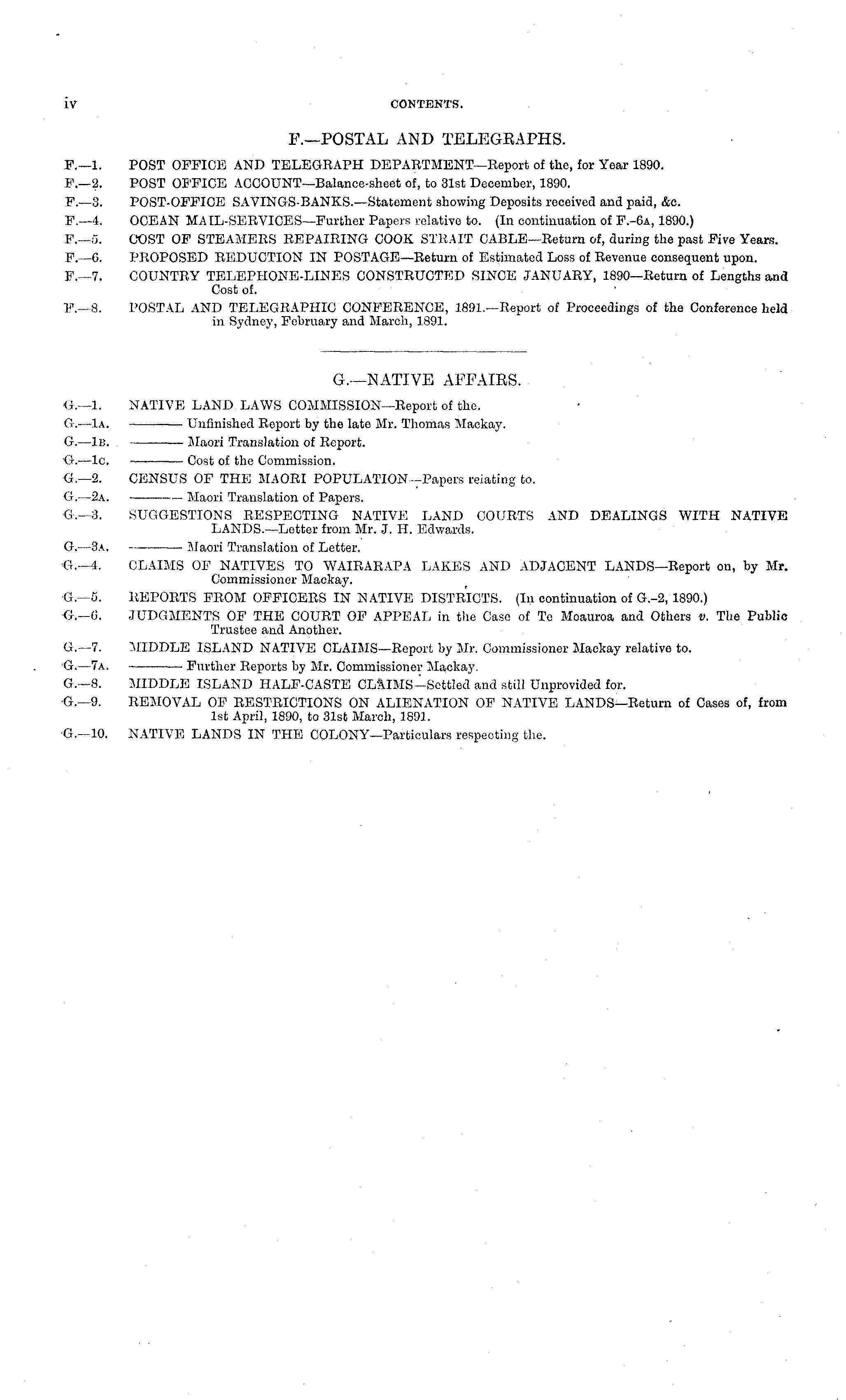 G.—NATIVE AFFAIRS. Ot.~ l. NATIVE LAND LAWS COMMISSION—Report o£ the. G.—la. —- Unfinished Report by the late Mr. Thomas Mackay. G.—-Ib. — Maori Translation of Report. Or. —Ic. Cost of the Commission. G.—2. CENSUS OF THE MAORI POPULATION—Papers relating to. G.—2a. Maori Translation of Papers. <3-.—3. SUGGESTIONS RESPECTING NATIVE LAND COURTS AND DEALINGS WITH NATIVE LANDS.—Letter from Mr. J. IT. Edwards. G.—3a. Maori Translation of Letter. G.— i. CLAIMS OF NATIVES TO WAIRARAPA LAKES AND ADJACENT LANDS—Report on, by Mr. Commissioner Mackay. Q.—a. REPORTS FROM OFFICERS IN NATIVE DISTRICTS. (In continuation of G.-2, 1890.) G.—6. JUDGMENTS OF THE COURT OF APPEAL m the Case of To Moauroa and Others ti. The Public Trustee and Another. G.—7. MIDDLE ISLAND NATIVE CLAIMS—Report by Mr. Commissioner Mackay relative to. G. —7a. Further Reports by Mr. Commissioner Mackay. G.— B. MIDDLE ISLAND HALF-CASTE CLAlMS—Settled and still Unprovided for. G.—9. REMOVAL OF RESTRICTIONS ON ALIENATION OF NATIVE LANDS—Return of Cases of, from Ist April, 1890, to 31st March, 1891. G.—lo. NATIVE LANDS IN THE COLONY—Particulars respecting the.