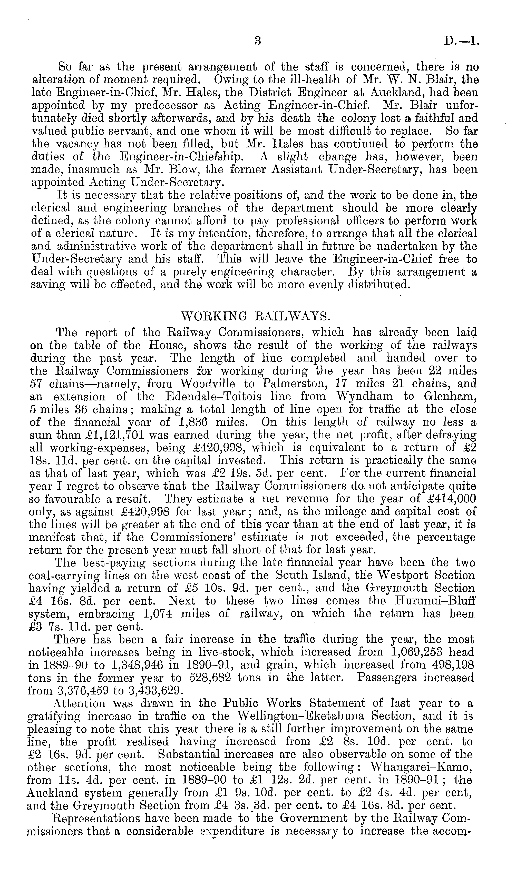 So far as the present arrangement of the staff is concerned, there is no alteration of moment required. Owing to the ill-health of Mr. W. N. Blair, the late Engineer-in-Chief, Mr. Hales, the District Engineer at Auckland, had been appointed by my predecessor as Acting Engineer-in-Chief. Mr. Blair unfortunately died shortly afterwards, and by his death the colony lost a faithful and valued public servant, and one whom it will be most difficult to replace. So far the vacancy has not been filled, but Mr. Hales has continued to perform the duties of the Engineer-in-Chiefship. A slight change has, however, been made, inasmuch as Mr. Blow, the former Assistant Under-Secretary, has been appointed Acting Under-Secretary. It is necessary that the relative positions of, and the work to be done in, the clerical and engineering branches of the department should be more clearly defined, as the colony cannot afford to pay professional officers to perform work of a clerical nature. It is my intention, therefore, to arrange that all the clerical and administrative work of the department shall in future be undertaken by the Under-Secretary and his staff. This will leave the Engineer-in-Chief free to deal with questions of a purely engineering character. By this arrangement a saving will be effected, and the work will be more evenly distributed. WOEKING EAILWAYS. The report of the Eailway Commissioners, which has already been laid on the table of the House, shows the result of the working of the railways during the past year. The length of line completed and handed over to the Eailway Commissioners for working during the year has been 22 miles 57 chains —namely, from Woodville to Palmerston, 17 miles 21 chains, and an extension of the Edendale-Toitois line from Wyndham to Glenham, 5 miles 36 chains; making a total length of line open for traffic at the close of the financial year of 1,836 miles. On this length of railway no less a sum than £1,121,701 was earned during the year, the net profit, after defraying all working-expenses, being £420,998, which is equivalent to a return of £2 18s. lid. per cent, on the capital invested. This return is practically the same as that of last year, which was £2 19s. sd. per cent. For the current financial year I regret to observe that the Eailway Commissioners do. not anticipate quite so favourable a result. They estimate a net revenue for the year of £414,000 only, as against £420,998 for last year; and, as the mileage and capital cost of the lines will be greater at the end of this year than at the end of last year, it is manifest that, if the Commissioners' estimate is not exceeded, the percentage return for the present year must fall short of that for last year. The best-paying sections during the late financial year have been the two coal-carrying lines on the west coast of the South Island, the Westport Section having yielded a return of £5 10s. 9d. per cent., and the Greymouth Section £4 16s. Bd. per cent. Next to these two lines comes the Hurunui-Bluff system, embracing 1,074 miles of railway, on which the return has been £3 7s. lid. per cent. There has been a fair increase in the traffic during the year, the most noticeable increases being in live-stock, which increased from 1,069,253 head in 1889-90 to 1,348,946 in 1890-91, and grain, which increased from 498,198 tons in the former year to 528,682 tons in the latter. Passengers increased from 3,376,459 to 3,433,629. Attention was drawn in the Public Works Statement of last year to a gratifying increase in traffic on the Wellington-Eketahuna Section, and it is pleasing to note that this year there is a still further improvement on the same line, the profit realised having increased from £2 Bs. lOd. per cent, to £2 16s. 9d. per cent. Substantial increases are also observable on some of the other sections, the most noticeable being the following: Whangarei-Kamo, from 11s. 4d. per cent, in 1889-90 to £1 12s. 2d. per cent, in 1890-91 ; the Auckland system generally from £1 9s. lOd. per cent, to £2 4s. 4d. per cent, and the Greymouth Section from £4 3s. 3d. per cent, to £4 16s. Bd. per cent. Eepresentations have been made to the Government by the Eailway Commissioners that a considerable expenditure is necessary to increase the accom-