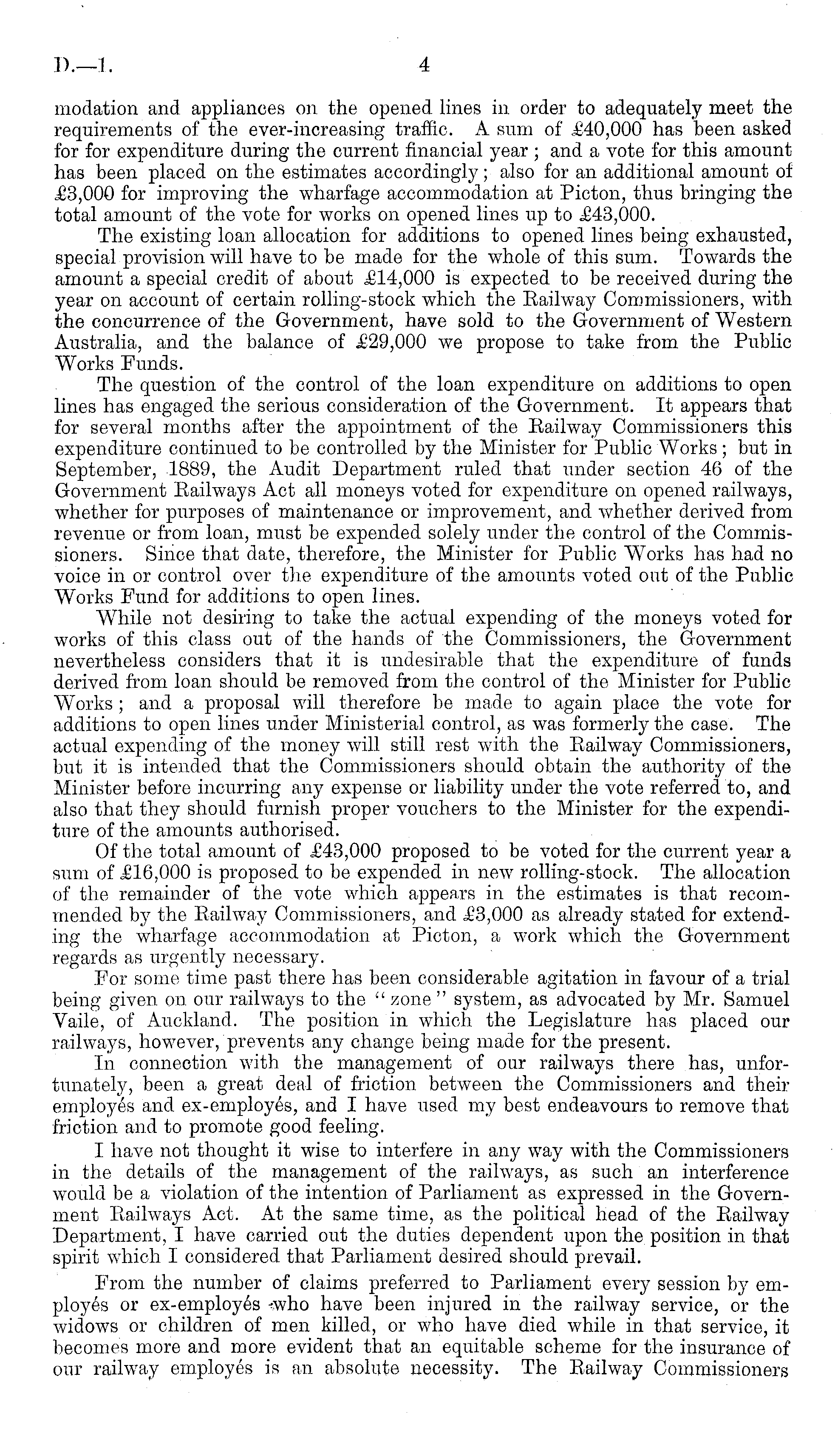 modation and appliances on the opened lines in order to adequately meet the requirements of the ever-increasing traffic. A sum of .-£40,000 has been asked for for expenditure during the current financial year ; and a vote for this amount has been placed on the estimates accordingly; also for an additional amount of £3,000 for improving the wharfage accommodation at Picton, thus bringing the total amount of the vote for works on opened lines up to £43,000. The existing loan allocation for additions to opened lines being exhausted, special provision will have to be made for the whole of this sum. Towards the amount a special credit of about £14,000 is expected to be received during the year on account of certain rolling-stock which the Eailway Commissioners, with the concurrence of the Government, have sold to the Government of Western Australia, and the balance of £29,000 we propose to take from the Public Works Funds. The question of the control of the loan expenditure on additions to open lines has engaged the serious consideration of the Government. It appears that for several months after the appointment of the Railway Commissioners this expenditure continued to be controlled by the Minister for Public Works; but in September, 1889, the Audit Department ruled that under section 46 of the Government Railways Act all moneys voted for expenditure on opened railways, whether for purposes of maintenance or improvement, and whether derived from revenue or from loan, must be expended solely under the control of the Commissioners. Since that date, therefore, the Minister for Public Works has had no voice in or control over the expenditure of the amounts voted out of the Public Works Fund for additions to open lines. While not desiring to take the actual expending of the monej^s voted for works of this class out of the hands of the Commissioners, the Government nevertheless considers that it is undesirable that the expenditure of funds derived from loan should be removed from the control of the Minister for Public Works ; and a proposal will therefore be made to again place the vote for additions to open lines under Ministerial control, as was formerly the case. The actual expending of the money will still rest with the Railway Commissioners, but it is intended that the Commissioners should obtain the authority of the Minister before incurring any expense or liability under the vote referred to, and also that they should furnish proper vouchers to the Minister for the expenditure of the amounts authorised. Of the total amount of £43,000 proposed to be voted for the current year a sum of £16,000 is proposed to be expended in new rolling-stock. The allocation of the remainder of the vote which appears in the estimates is that recommended by the Railway Commissioners, and £3,000 as already stated for extending the wharfage accommodation at Picton, a work which the Government regards as urgently necessary. For some time past there has been considerable agitation in favour of a trial being given on our railways to the " " system, as advocated by Mr. Samuel Vaile, of Auckland. The position in which the Legislature has placed our railways, however, prevents any change being made for the present. In connection with the management of our railways there has, unfortunately, been a great deal of friction between the Commissioners and their employes and ex-employes, and I have used my best endeavours to remove that friction and to promote good feeling. I have not thought it wise to interfere in any way with the Commissioners in the details of the management of the railways, as such an interference would be a violation of the intention of Parliament as expressed in the Government Railways Act. At the same time, as the political head of the Railway Department, I have carried out the duties dependent upon the position in that spirit which I considered that Parliament desired should prevail. From the number of claims preferred to Parliament every session by employes or ex-employes -who have been injured in the railway service, or the widows or children of men killed, or who have died while in that service, it becomes more and more evident that an equitable scheme for the insurance of our railway employes is an absolute necessity. The Railway Commissioners