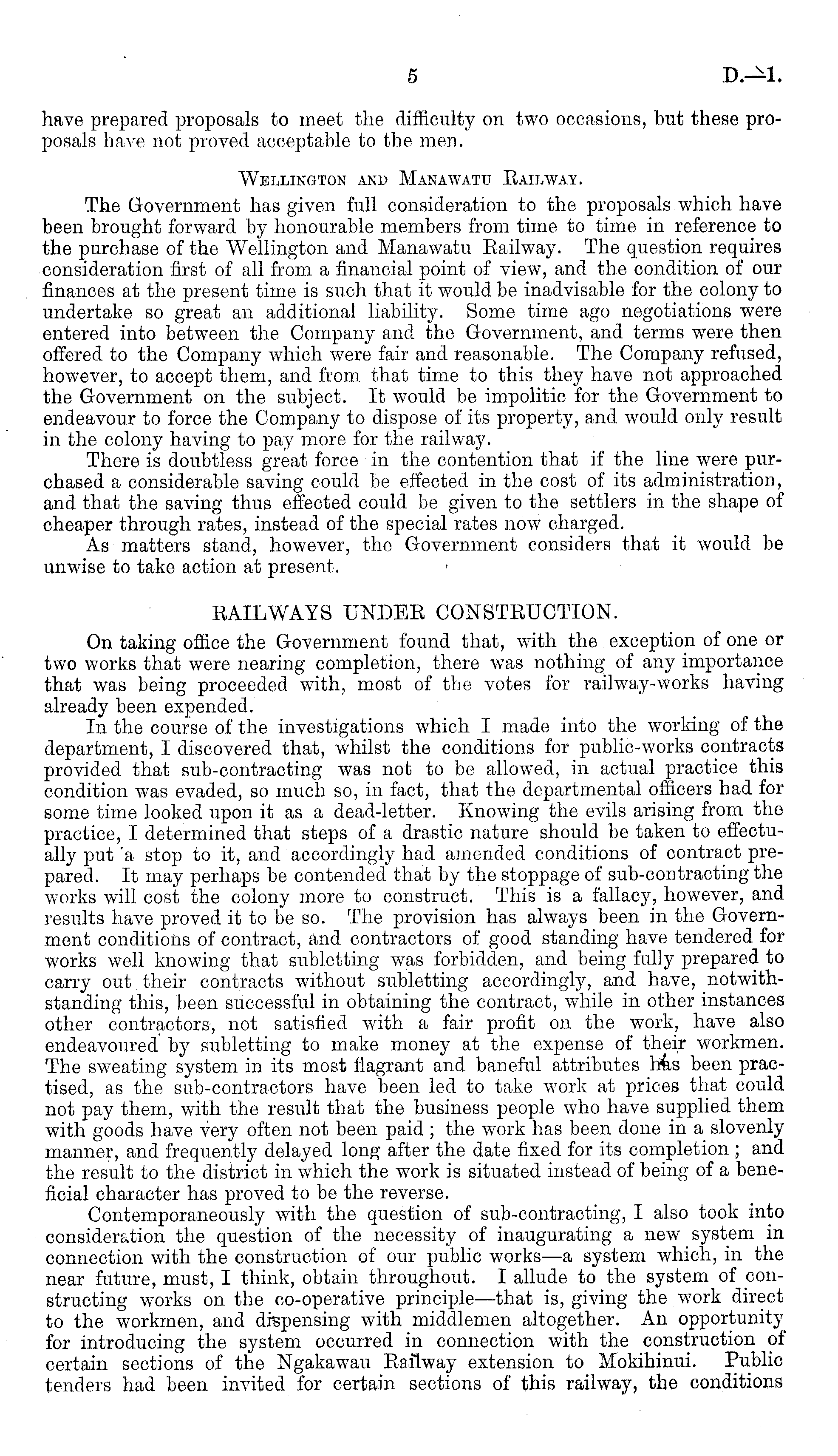 have prepared proposals to meet the difficulty on two occasions, hut these proposals have not proved acceptahle to the men. Wellington and Manawatu Bailway. The Government has given full consideration to the proposals which have heen brought forward by honourable members from time to time in reference to the purchase of the Wellington and Manawatu Eailway. The question requires consideration first of all from a financial point of view, and the condition of our finances at the present time is such that it would be inadvisable for the colony to undertake so great an additional liability. Some time ago negotiations were entered into between the Company and the Government, and terms were then offered to the Company which were fair and reasonable. The Company refused, however, to accept them, and from that time to this they have not approached the Government on the subject. It would be impolitic for the Government to endeavour to force the Company to dispose of its property, and would only result in the colony having to pay more for the railway. There is doubtless great force in the contention that if the line were purchased a considerable saving could be effected in the cost of its administration, and that the saving thus effected could be given to the settlers in the shape of cheaper through rates, instead of the special rates now charged. As matters stand, however, the Government considers that it would be unwise to take action at present. EAILWAYS UNDEB CONSTEUCTION. On taking office the Government found that, with the exception of one or two works that were nearing completion, there was nothing of any importance that was being proceeded with, most of the votes for railway-works having already been expended. In the course of the investigations which I made into the working of the department, I discovered that, whilst the conditions for public-works contracts provided that sub-contracting was not to be allowed, in actual practice this condition was evaded, so much so, in fact, that the departmental officers had for some time looked upon it as a dead-letter. Knowing the evils arising from the practice, I determined that steps of a drastic nature should be taken to effectually put 'a stop to it, and accordingly had amended conditions of contract prepared. It may perhaps be contended that by the stoppage of sub-contracting the works will cost the colony more to construct. This is a fallacy, however, and results have proved it to be so. The provision has always been in the Government conditions of contract, and contractors of good standing have tendered for works well knowing that subletting was forbidden, and being fully prepared to carry out their contracts without subletting accordingly, and have, notwithstanding this, been successful in obtaining the contract, while in other instances other contractors, not satisfied with a fair profit on the work, have also endeavoured by subletting to make money at the expense of their workmen. The sweating system in its most flagrant and baneful attributes h4s been practised, as the sub-contractors have been led to take work at prices that could not pay them, with the result that the business people who have supplied them with goods have very often not been paid ; the work has been done in a slovenly manner, and frequently delayed long after the date fixed for its completion ; and the result to the district in which the work is situated instead of being of a beneficial character has proved to be the reverse. Contemporaneously with the question of sub-contracting, I also took into consideration the question of the necessity of inaugurating a new system in connection with the construction of our public works—a system which, in the near future, must, I think, obtain throughout. I allude to the system of constructing works on the co-operative principle—that is, giving the work direct to the workmen, and dispensing with middlemen altogether. An opportunity for introducing the system occurred in connection with the construction of certain sections of the Ngakawau Bailway extension to Mokihinui. Public tenders had been imdted for certain sections of this railway, the conditions