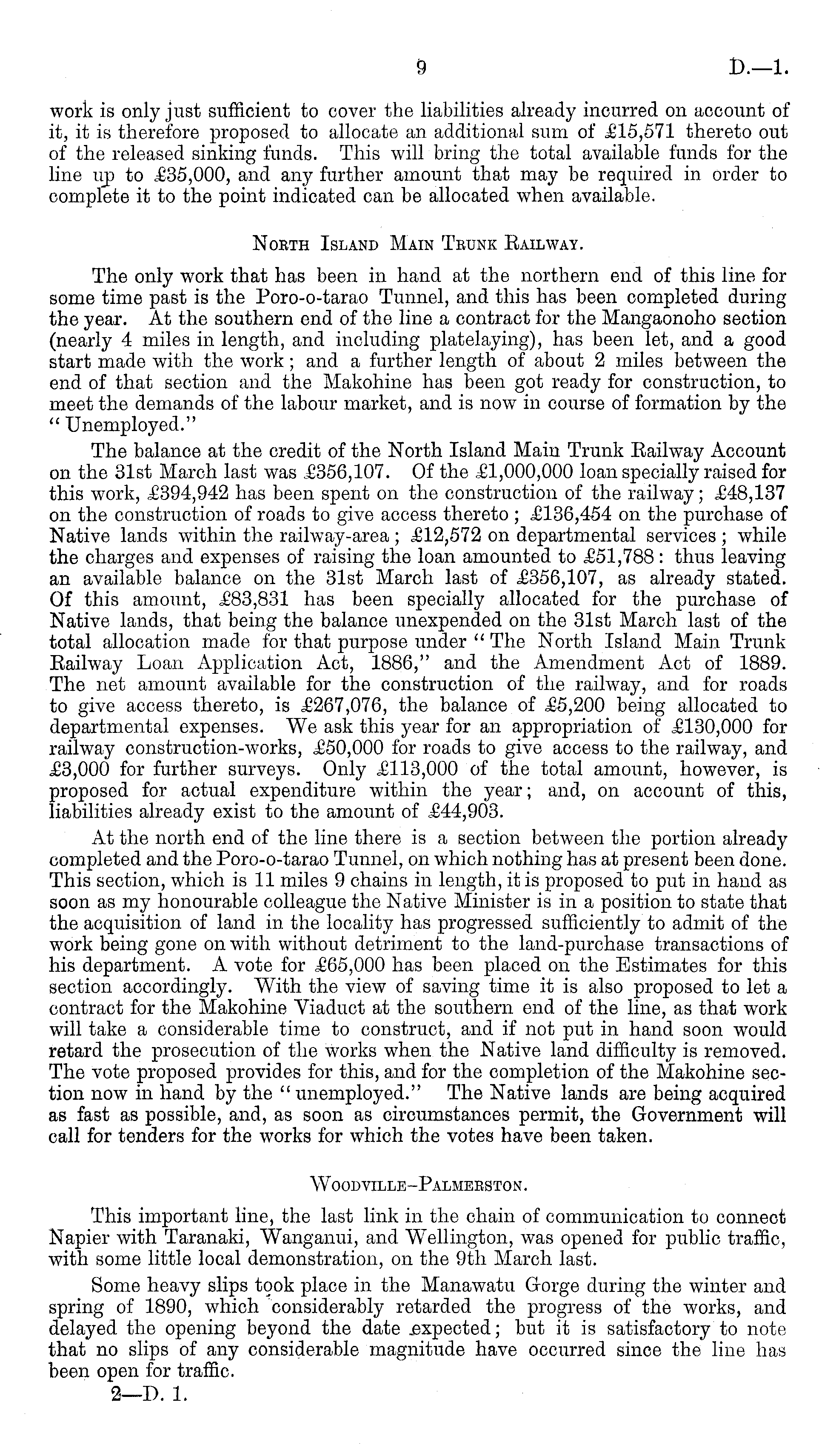 work is only just sufficient to cover the liabilities already incurred on account of it, it is therefore proposed to allocate an additional sum of £15,571 thereto out of the released sinking funds. This will bring the total available funds for the line iip to ,£35,000, and any further amount that may be required in order to complete it to the point indicated can be allocated when available. Noeth Island Main Trunk Eailway. The only work that has been in hand at the northern end of this line for some time past is the Poro-o-tarao Tunnel, and this has been completed during the year. At the southern end of the line a contract for the Mangaonoho section (nearly 4 miles in length, and including platelaying), has been let, and a good start made with the work; and a further length of about 2 miles between the end of that section and the Makohine has been got ready for construction, to meet the demands of the labour market, and is now in course of formation by the " Unemployed." The balance at the credit of the North Island Main Trunk Eailway Account on the 31st March last was £356,107. Of the .£1,000,000 loan specially raised for this work, £394,942 has been spent on the construction of the railway; .£48,137 on the construction of roads to give access thereto ; .£136,454 on the purchase of Native lands within the railway-area ; ,£12,572 on departmental services ; while the charges and expenses of raising the loan amounted to £51,788: thus leaving an available balance on the 31st March last of £356,107, as already stated. Of this amount, £83,831 has been specially allocated for the purchase of Native lands, that being the balance unexpended on the 31st March last of the total allocation made for that purpose under " The North Island Main Trunk Eailway Loan Application Act, 1886," and the Amendment Act of 1889. The net amount available for the construction of the railway, and for roads to give access thereto, is £267,076, the balance of £5,200 being allocated to departmental expenses. We ask this year for an appropriation of £130,000 for railway construction-works, £50,000 for roads to give access to the railway, and £3,000 for further surveys. Only £113,000 of the total amount, however, is proposed for actual expenditure within the year; and, on account of this, liabilities already exist to the amount of £44,903. At the north end of the line there is a section between the portion already completed and the Poro-o-tarao Tunnel, on which nothing has at present been done. This section, which is 11 miles 9 chains in length, it is proposed to put in hand as soon as my honourable colleague the Native Minister is in a position to state that the acquisition of land in the locality has progressed sufficiently to admit of the work being gone on with without detriment to the land-purchase transactions of his department. A vote for £65,000 has been placed on the Estimates for this section accordingly. With the view of saving time it is also proposed to let a contract for the Makohine Viaduct at the southern end of the line, as that work will take a considerable time to construct, and if not put in hand soon would retard the prosecution of the works when the Native land difficulty is removed. The vote proposed provides for this, and for the completion of the Makohine section now in hand by the "unemployed." The Native lands are being acquired as fast as possible, and, as soon as circumstances permit, the Government will call for tenders for the works for which the votes have been taken. Woodville-Palmerston. This important line, the last link in the chain of communication to connect Napier with Taranaki, Wanganui, and Wellington, was opened for public traffic, with some little local demonstration, on the 9th March last. Some heavy slips took place in the Manawatu Gorge during the winter and spring of 1890, which considerably retarded the progress of the works, and delayed the opening beyond the date .expected; but it is satisfactory to note that no slips of any considerable magnitude have occurred since the line has been open for traffic. 2—D. 1.