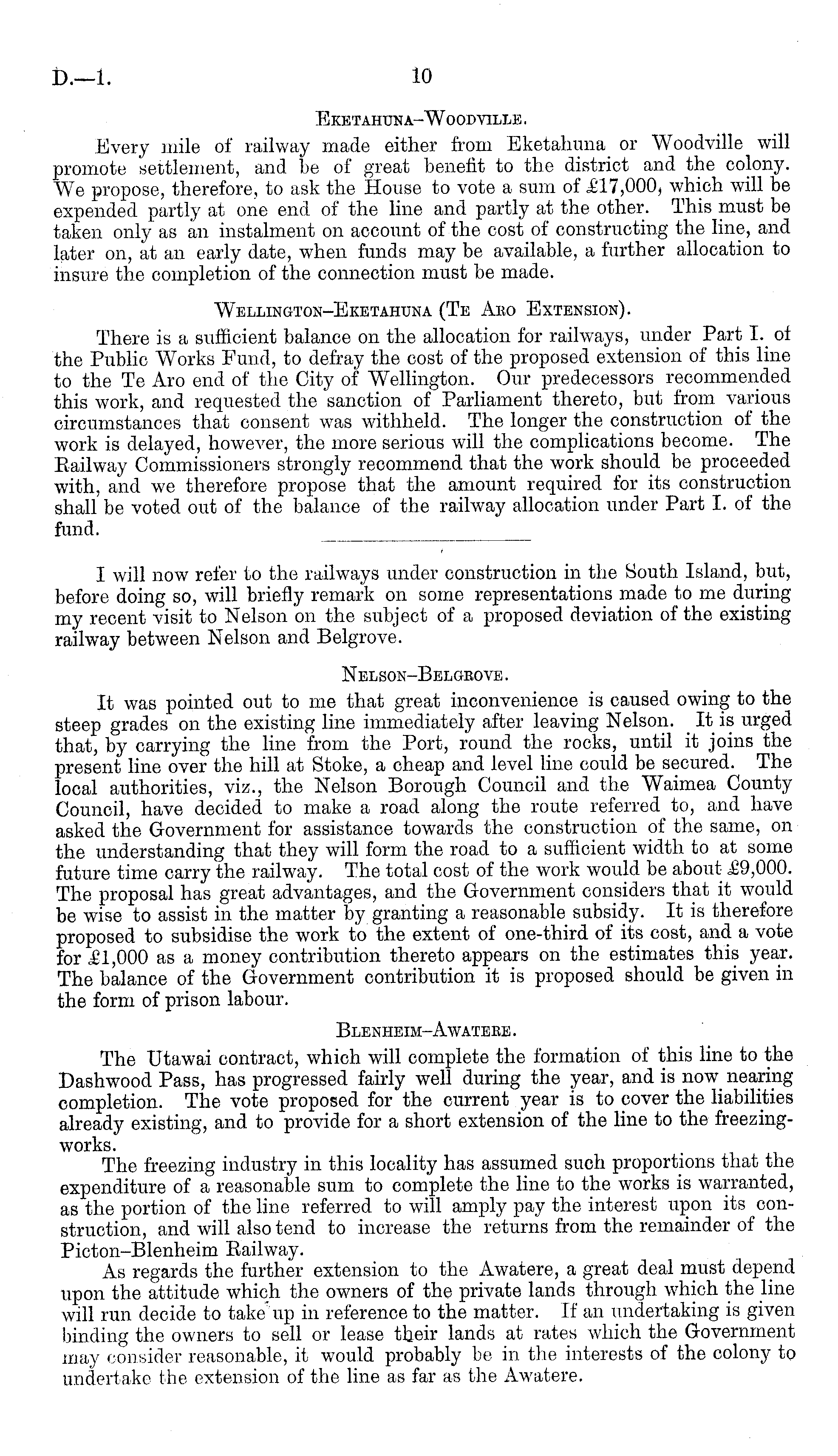 Eketahuna-Woodville. Every mile of railway made either from Eketahuna or Woodville will promote settlement, and be of great benefit to the district and the colony. We propose, therefore, to ask the House to vote a sum of £17,000, which will be expended partly at one end of the line and partly at the other. This must be taken only as an instalment on account of the cost of constructing the line, and later on, at an early date, when funds may be available, a further allocation to insure the completion of the connection must be made. Wellington-Eketahuna (Te Abo Extension). There is a sufficient balance on the allocation for railways, under Part I. of the Public Works Fund, to defray the cost of the proposed extension of this line to the Te Aro end of the City of Wellington. Our predecessors recommended this work, and requested the sanction of Parliament thereto, but from various circumstances that consent was withheld. The longer the construction of the work is delayed, however, the more serious will the complications become. The Eailway Commissioners strongly recommend that the work should be proceeded with, and we therefore propose that the amount required for its construction shall be voted out of the balance of the railway allocation under Part I. of the fund.