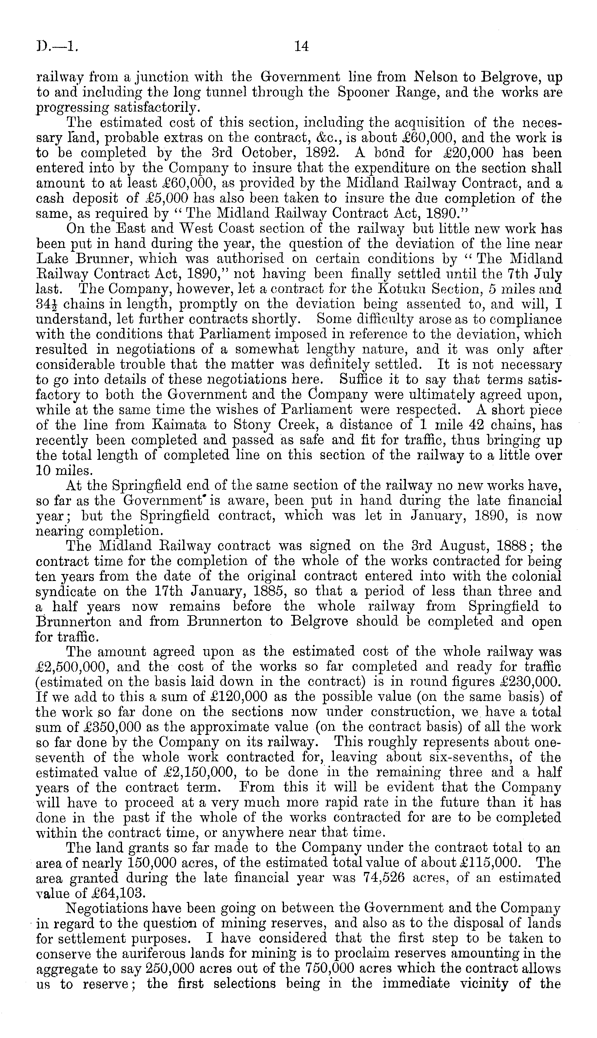 railway from a junction with the Government line from Nelson to Belgrove, up to and including the long tunnel through the Spooner Bange, and the works are progressing satisfactorily. The estimated cost of this section, including the acquisition of the necessary land, probable extras on the contract, &c, is about £60,000, and the work is to be completed by the 3rd October, 1892. A bond for £20,000 has been entered into by the Company to insure that the expenditure on the section shall amount to at least £60,000, as provided by the Midland Eailway Contract, and a cash deposit of £5,000 has also been taken to insure the due completion of the same, as required by " The Midland Eailway Contract Act, 1890." On the East and West Coast section of the railway but little new work has been put in hand during the year, the question of the deviation of the line near Lake Brunner, which was authorised on certain conditions by " The Midland Eailway Contract Act, 1890," not having been finally settled until the 7th July last. The Company, however, let a contract for the Kotuku Section, 5 miles and 34J chains in length, promptly on the deviation being assented to, and will, I understand, let further contracts shortly. Some difficulty arose as to compliance with the conditions that Parliament imposed in reference to the deviation, which resulted in negotiations of a somewhat lengthy nature, and it was only after considerable trouble that the matter was definitely settled. It is not necessary to go into details of these negotiations here. Suffice it to say that terms satisfactory to both the Government and the Company were ultimately agreed upon, while at the same time the wishes of Parliament were respected. A short piece of the line from Kaimata to Stony Creek, a distance of 1 mile 42 chains, has recently been completed and passed as safe and fit for traffic, thus bringing up the total length of completed line on this section of the railway to a little over 10 miles. At the Springfield end of the same section of the railway no new works have, so far as the Government* is aware, been put in hand during the late financial year; but the Springfield contract, which was let in January, 1890, is now nearing completion. The Midland Eailway contract was signed on the 3rd August, 1888; the contract time for the completion of the whole of the works contracted for being ten years from the date of the original contract entered into with the colonial syndicate on the 17th January, 1885, so that a period of less than three and a half years now remains before the whole railway from Springfield to Brunnerton and from Brunnerton to Belgrove should be completed and open for traffic. The amount agreed upon as the estimated cost of the whole railway was £2,500,000, and the cost of the works so far completed and ready for traffic (estimated on the basis laid down in the contract) is in round figures £230,000. If we add to this a sum of £120,000 as the possible value (on the same basis) of the work so far done on the sections now under construction, we have a total sum of £350,000 as the approximate value (on the contract basis) of all the work so far done by the Company on its railway. This roughly represents about oneseventh of the whole work contracted for, leaving about six-sevenths, of the estimated value of £2,150,000, to be done in the remaining three and a half years of the contract term. From this it will be evident that the Company will have to proceed at a very much more rapid rate in the future than it has done in the past if the whole of the works contracted for are to be completed within the contract time, or anywhere near that time. The land grants so far made to the Company under the contract total to an area of nearly 150,000 acres, of the estimated total value of about £115,000. The area granted during the late financial year was 74,526 acres, of an estimated value of £64,103. Negotiations have been going on between the Government and the Company ill regard to the question of mining reserves, and also as to the disposal of lands for settlement purposes. I have considered that the first step to be taken to conserve the auriferous lands for mining is to proclaim reserves amounting in the aggregate to say 250,000 acres out of the 750,000 acres which the contract allows us to reserve; the first selections being in the immediate vicinity of the