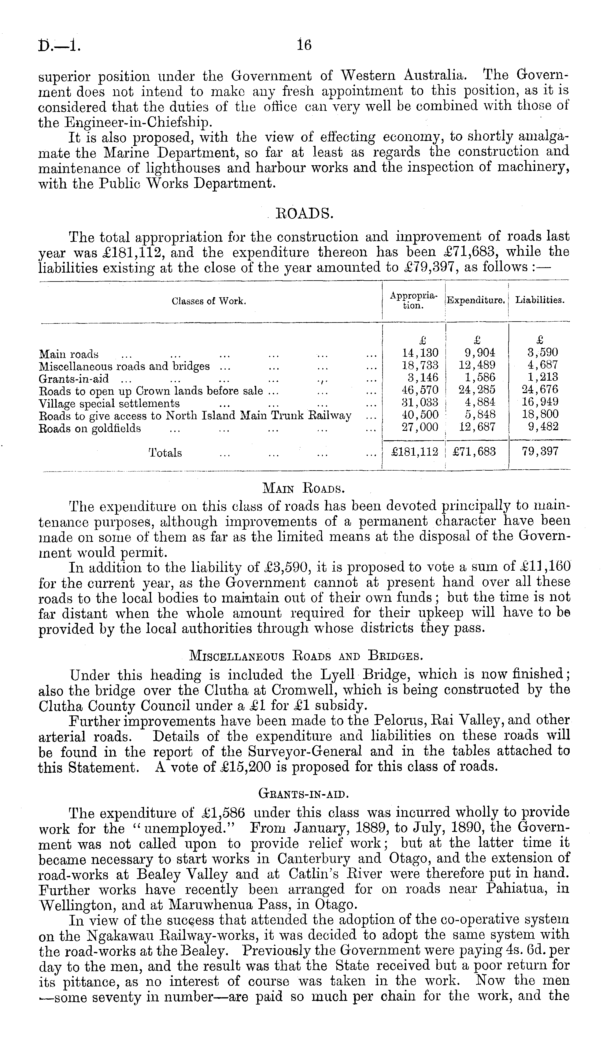 superior position under the Government of Western Australia. The Government does not intend to make any fresh appointment to this position, as it is considered that the duties of the office can very well be combined with those of the Engineer-in-Chiefship. It is also proposed, with the view of effecting economy, to shortly amalgamate the Marine Department, so far at least as regards the construction and maintenance of lighthouses and harbour works and the inspection of machinery, with the Public Works Department. EOADS. The total appropriation for the construction and improvement of roads last year was £181,112, and the expenditure thereon has been £71,683, while the liabilities existing at the close of the year amounted to £79,397, as follows :—