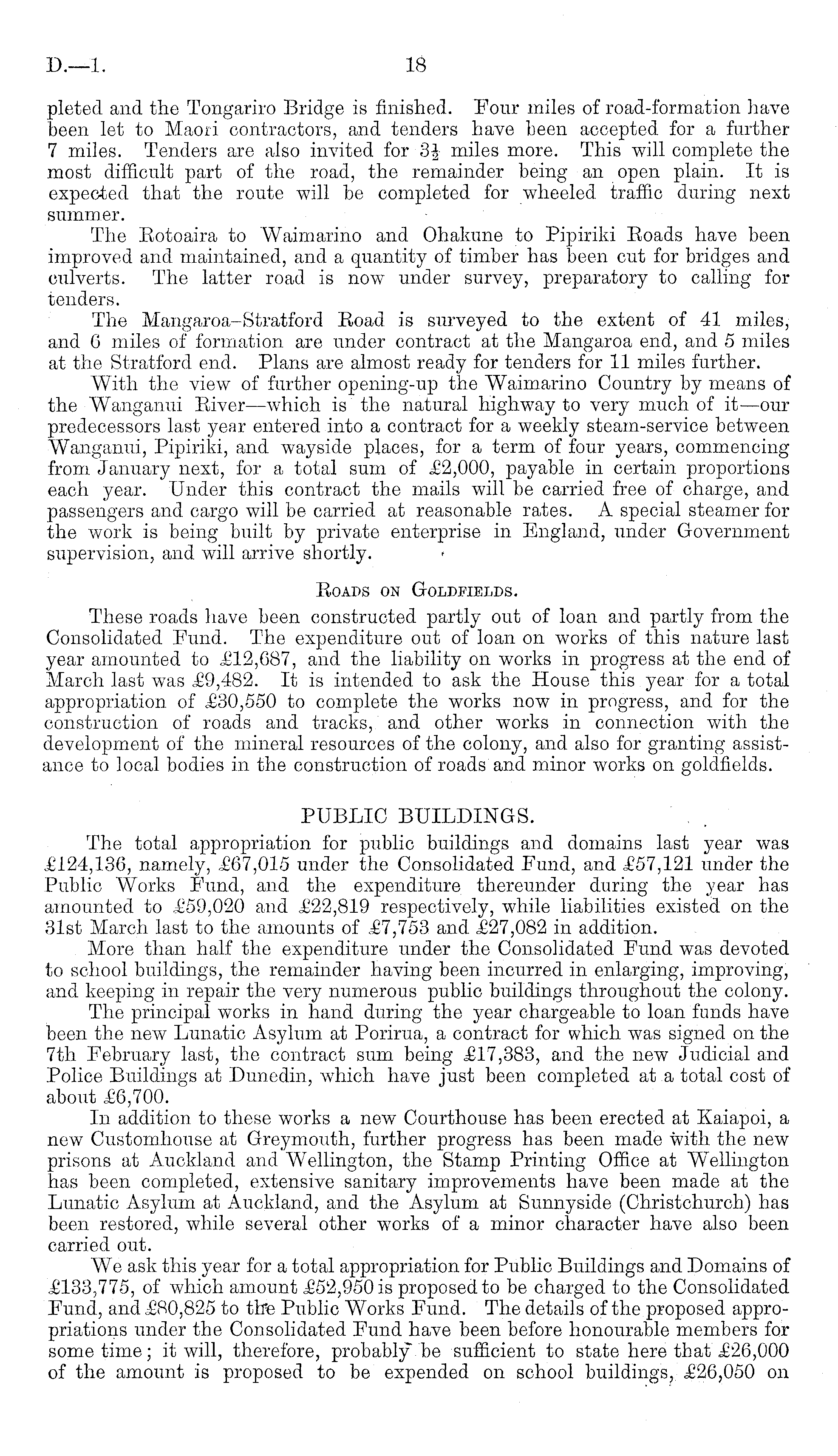 pleted and the Tongariro Bridge is finished. Four miles of road-formation have been let to Maori contractors, and tenders have been accepted for a further 7 miles. Tenders are also invited for 3J miles more. This will complete the most difficult part of the road, the remainder being an open plain. It is expected that the route will be completed for wheeled traffic during next summer. The Kotoaira to Waimarino and Ohakune to Pipiriki Eoads have been improved and maintained, and a quantity of timber has been cut for bridges and culverts. The latter road is now under survey, preparatory to calling for tenders. The Mangaroa- Stratford Eoad is surveyed to the extent of 41 miles, and 6 miles of formation are under contract at the Mangaroa end, and 5 miles at the Stratford end. Plans are almost ready for tenders for 11 miles further. With the view of farther opening-up the Waimarino Country by means of the Wanganui Eiver—which is the natural highway to very much of it—our predecessors last year entered into a contract for a weekly steam-service between Wanganui, Pipiriki, and wayside places, for a term of four years, commencing from January next, for a total sum of £2,000, payable in certain proportions each year. Under this contract the mails will be carried free of charge, and passengers and cargo will be carried at reasonable rates. A special steamer for the work is being built by private enterprise in England, under Government supervision, and will arrive shortly. Eoads on Goldfields. These roads have been constructed partly out of loan and partly from the Consolidated Fund. The expenditure out of loan on works of this nature last year amounted to £12,087, and the liability on works in progress at the end of March last was £9,482. It is intended to ask the House this year for a total appropriation of £30,550 to complete the works now in progress, and for the construction of roads and tracks, and other works in connection with the development of the mineral resources of the colony, and also for granting assistance to local bodies in the construction of roads and minor works on goldfields. PUBLIC BUILDINGS. The total appropriation for public buildings and domains last year was £124,136, namely, £67,015 under the Consolidated Fund, and £57,121 under the Piublic Works Fund, and the expenditure thereunder during the year has amounted to £59,020 and £22,819 respectively, while liabilities existed on the 31st March last to the amounts of £7,753 and £27,082 in addition. More than half the expenditure under the Consolidated Fund was devoted to school buildings, the remainder having been incurred in enlarging, improving, and keeping in repair the very numerous public buildings throughout the colony. The principal works in hand during the year chargeable to loan funds have been the new Lunatic Asylum at Porirua, a contract for which was signed on the 7th February last, the contract sum being £17,383, and the new Judicial and Police Buildings at Dunedin, which have just been completed at a total cost of about £6,700. In addition to these works a new Courthouse has been erected at Kaiapoi, a new Customhouse at Greymouth, further progress has been made with the new prisons at Auckland and Wellington, the Stamp Printing Office at Wellington has been completed, extensive sanitary improvements have been made at the Lunatic Asylum at Auckland, and the Asylum at Sunnyside (Christchurch) has been restored, while several other works of a minor character have also been carried oirt. We ask this year for a total appropriation for Public Buildings and Domains of £133,775, of which amount £52,950 is proposed to be charged to the Consolidated Fund, and £80,825 to the Public Works Fund. The details of the proposed appropriations under the Consolidated Fund have been before honourable members for sometime; it will, therefore, probably be sufficient to state here that £26,000 of the amount is proposed to be expended on school buildings, £26,050 on