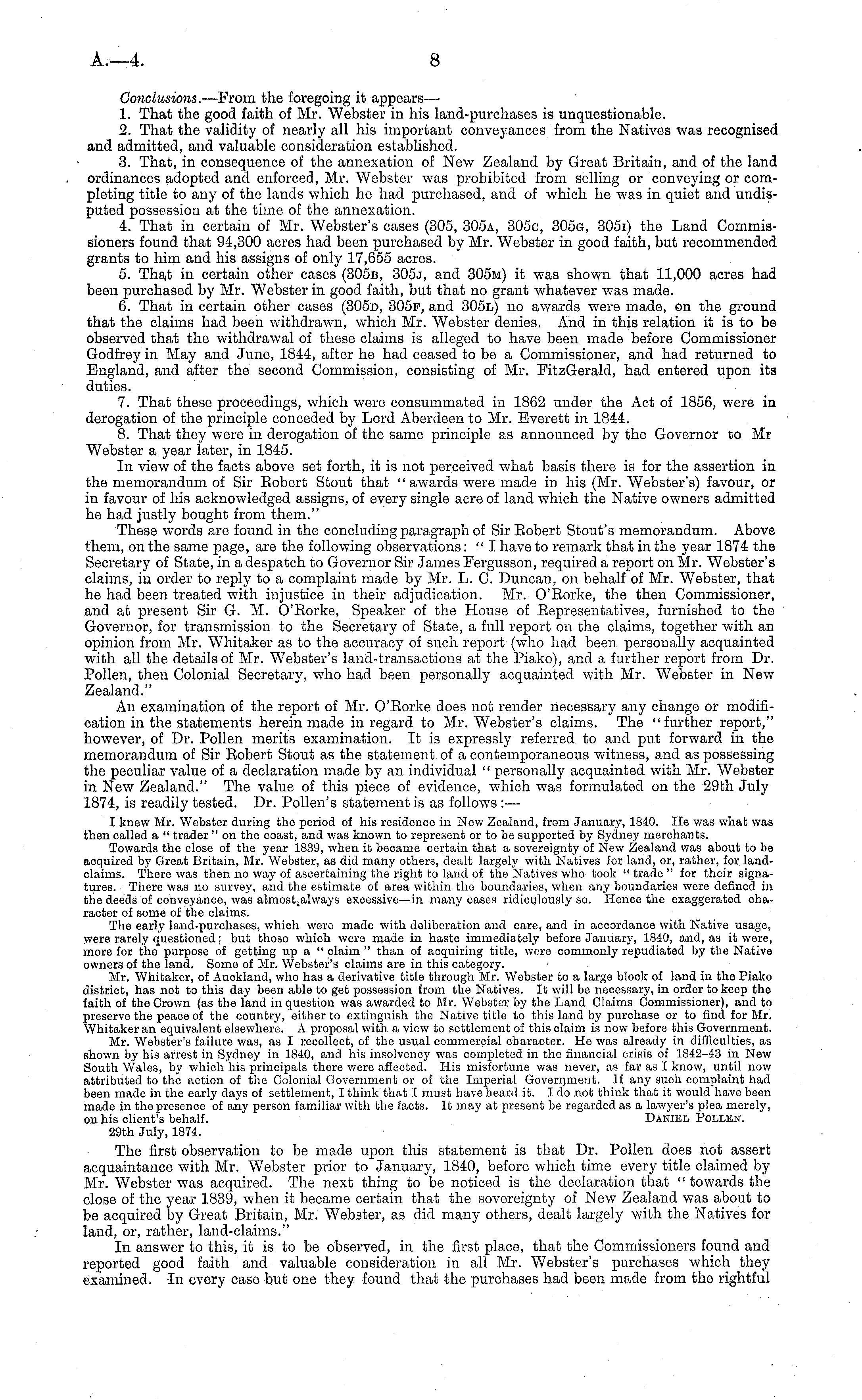 Conclusions. —From the foregoing it appears— 1. That the good faith of Mr. Webster in his land-purchases is unquestionable. 2. That the validity of nearly all his important conveyances from the Natives was recognised and admitted, and valuable consideration established. 3. That, in consequence of the annexation of New Zealand by Great Britain, and of the land ordinances adopted and enforced, Mr. Webster was prohibited from selling or conveying or completing title to any of the lands which he had purchased, and of which he was in quiet and undisputed possession at the time of the annexation. 4. That in certain of Mr. Webster's cases (305, 305 a, 305 c, 305g, 305 i) the Land Commissioners found that 94,300 acres had been purchased by Mr. Webster in good faith, but recommended grants to him and his assigns of only 17,655 acres. 5. That in certain other cases (305b, 305j, and 305 m) it was shown that 11,000 acres had been purchased by Mr. Webster in good faith, but that no grant whatever was made. 6. That in certain other cases (305 d, 305E , , and 305 l) no awards were made, on the ground that the claims had been withdrawn, which Mr. Webster denies. And in this relation it is to be observed that the withdrawal of these claims is alleged to have been made before Commissioner Godfrey in May and June, 1844, after he had ceased to be a Commissioner, and had returned to England, and after the second Commission, consisting of Mr. PitzGerald, had entered upon its duties. 7. That these proceedings, which were consummated in 1862 under the Act of 1856, were in derogation of the principle conceded by Lord Aberdeen to Mr. Everett in 1844. 8. That they were in derogation of the same principle as announced by the Governor to Mr Webster a year later, in 1845. In view of the facts above set forth, it is not perceived what basis there is for the assertion in the memorandum of Sir Eobert Stout that "awards were made in his (Mr. Webster's) favour, or in favour of his acknowledged assigns, of every single acre of land which the Native owners admitted he had justly bought from them." These words are found ill the concluding paragraph of Sir Eobert Stout's memorandum. Above them, on the same page, are the following observations: " I have to remark that in the year 1874 the Secretary of State, in a despatch to Governor Sir James Fergusson, required a report on Mr. Webster's claims, in order to reply to a complaint made by Mr. L. C. Duncan, on behalf of Mr. Webster, that he had been treated with injustice in their adjudication. Mr. O'Eorke, the then Commissioner, and at present Sir G. M. O'Eorke, Speaker of the House of Eepresentatives, furnished to the Governor, for transmission to the Secretary of State, a full report on the claims, together with an opinion from Mr. Whitaker as to the accuracy of such report (who had been personally acquainted with all the details of Mr. W T ebster's land-transactions at the Piako), and a further report from Dr. Pollen, then Colonial Secretary, who had been personally acquainted, with Mr. Webster in New Zealand." An examination of the report of Mr. O'Eorke does not render necessary any change or modification in the statements herein made in regard to Mr. Webster's claims. The "further report," however, of Dr. Pollen merits examination. It is expressly referred to and put forward in the memorandum of Sir Eobert Stout as the statement of a contemporaneous witness, and as possessing the peculiar value of a declaration made by an individual " personally acquainted with Mr. Webster in New Zealand." The value of this piece of evidence, which was formulated on the 29th July 1874, is readily tested. Dr. Pollen's statement is as follows : — I knew Mr. Webster during the period of his residence in New Zealand, from January, 1840. He was what was then called a " trader " on the coast, and was known to represent or to be supported by Sydney merchants. Towards the close of the year 1839, when it became certain that a sovereignty of New Zealand was about to be acquired by Great Britain, Mr. Webster, as did many others, dealt largely with Natives for land, or, rather, for landclaims. There was then no way of ascertaining the right to land of the Natives who took " trade " for their signatures. There was no survey, and the estimate of area within the boundaries, when any boundaries were defined in the deeds of conveyance, was almostalways excessive—in many oases ridiculously so. Hence the exaggerated character of some of the claims. The early land-purchases, which were made with deliberation and care, and in accordance with Native usage, were rarely questioned; but those which were made in haste immediately before January, 1840, and, as it were, more for the purpose of getting up a " claim " than of acquiring title, were commonly repudiated by the Native owners of the land. Some of Mr. Webster's claims are in this category. Mr. Whitaker, of Auckland, who has a derivative title through Mr. Webster to a large block of land in the Piako district, has not to this day been able to get possession from the Natives. It will be necessary, in order to keep the faith of the Crown (as the land in question was awarded to Mr. Webster by the Land Claims Commissioner), and to preserve the peace of the country, either to extinguish the Native title to this land by purchase or to find for Mr. Whitaker an equivalent elsewhere. A proposal with, a view to settlement of this claim is now before this Government. Mr. Webster's failure was, as I recollect, of the usual commercial character. He was already in difficulties, as shown by his arrest in Sydney in 1840, and his insolvency was completed in the financial crisis of 1842-43 in New South Wales, by which his principals there were affected. His misfortune was never, as far as I know, until now attributed to the action of the Colonial Government or of the Imperial Government. If any such complaint had been made in the early days of settlement, I think that I