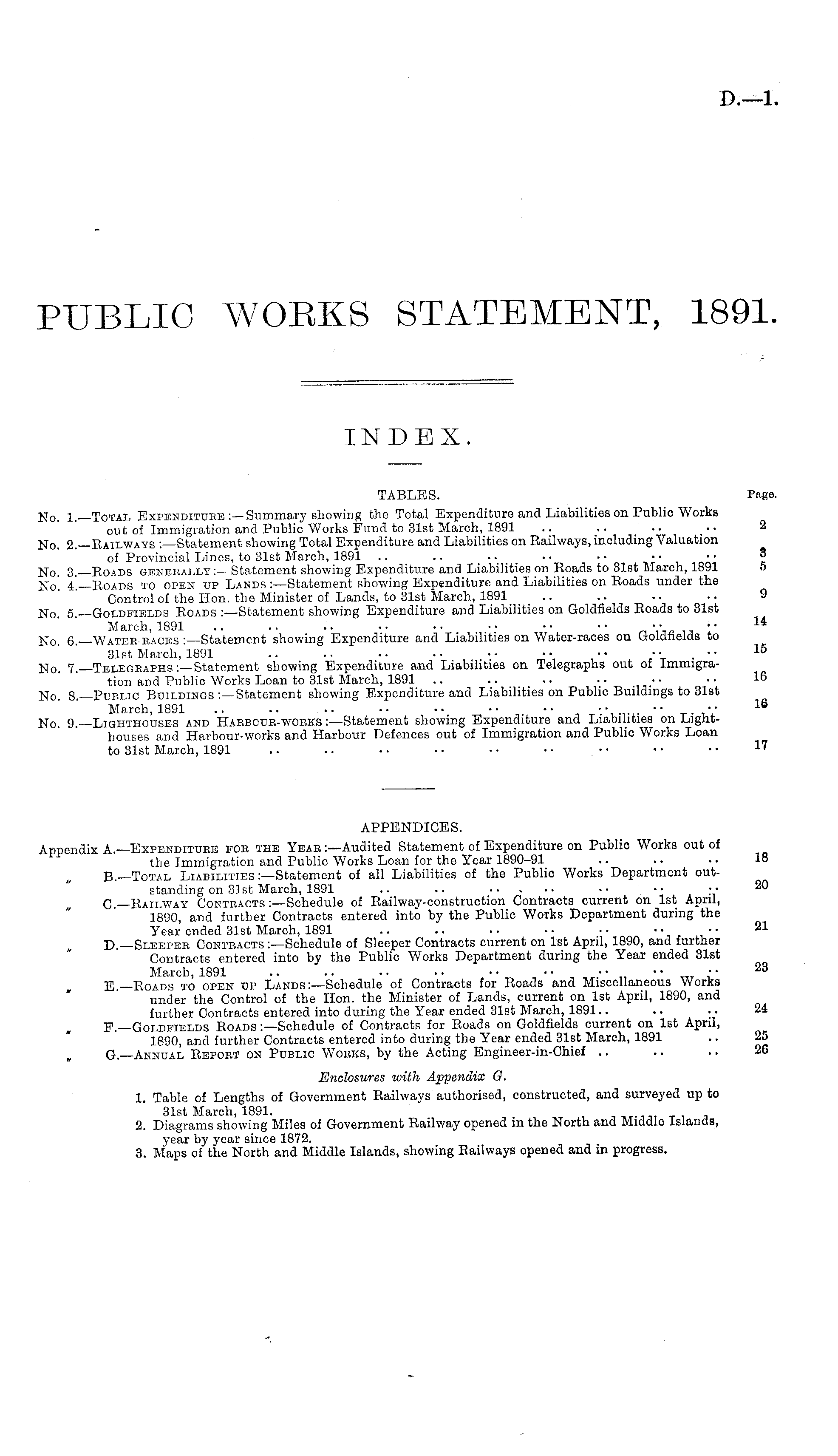 APPENDICES. Appendix A.— Expenditure foe the Year :—Audited Statement o£ Expenditure on Public Works out of the Immigration and Public Works Loan for the Year 1890-91 .. .. •• 18 B.—Total Liabilities-.—Statement of all Liabilities of the Public Works Department outstanding on 31st March, 1891 .. .. • • • • • • 20 C. Railway Contracts: —Schedule of Eailway-construction Contracts current on Ist April, 1890, and further Contracts entered into by the Public Works Department during the Year ended 31st March, 1891 .. .. . • •• ■ • • • • • 21 D.—Sleeper Contracts :—Schedule of Sleeper Contracts current on Ist April, 1890, and further Contracts entered into by the Public Works Department during the Year ended 31st March, 1891 .. .. .. •• •• •• •• • • _ • • 23 E.—Roads to open up Lands:—Schedule of Contracts for Eoads and Miscellaneous Works under the Control of the Hon. the Minister of Lands, current on Ist April, 1890, and further Contracts entered into during the Year ended 31st March, 1891.. .. .. 24 F.—Goldfields Roads :—Schedule of Contracts for Roads on Goldfields current on Ist April, 1890, and further Contracts entered into during the Year ended 31st March, 1891 G.—Annual Repoet on Public Works, by the Acting Engineer-in-Chief .. .. .. 26 Enclosures with Appendix G. 1. Table of Lengths of Government Railways authorised, constructed, and surveyed up to 31st March, 1891. , 2. Diagrams showing Miles of Government Railway opened in the North and Middle Islands, year by year since 1872. 3. Maps of" the North and Middle Islands, showing Railways opened and in progress.